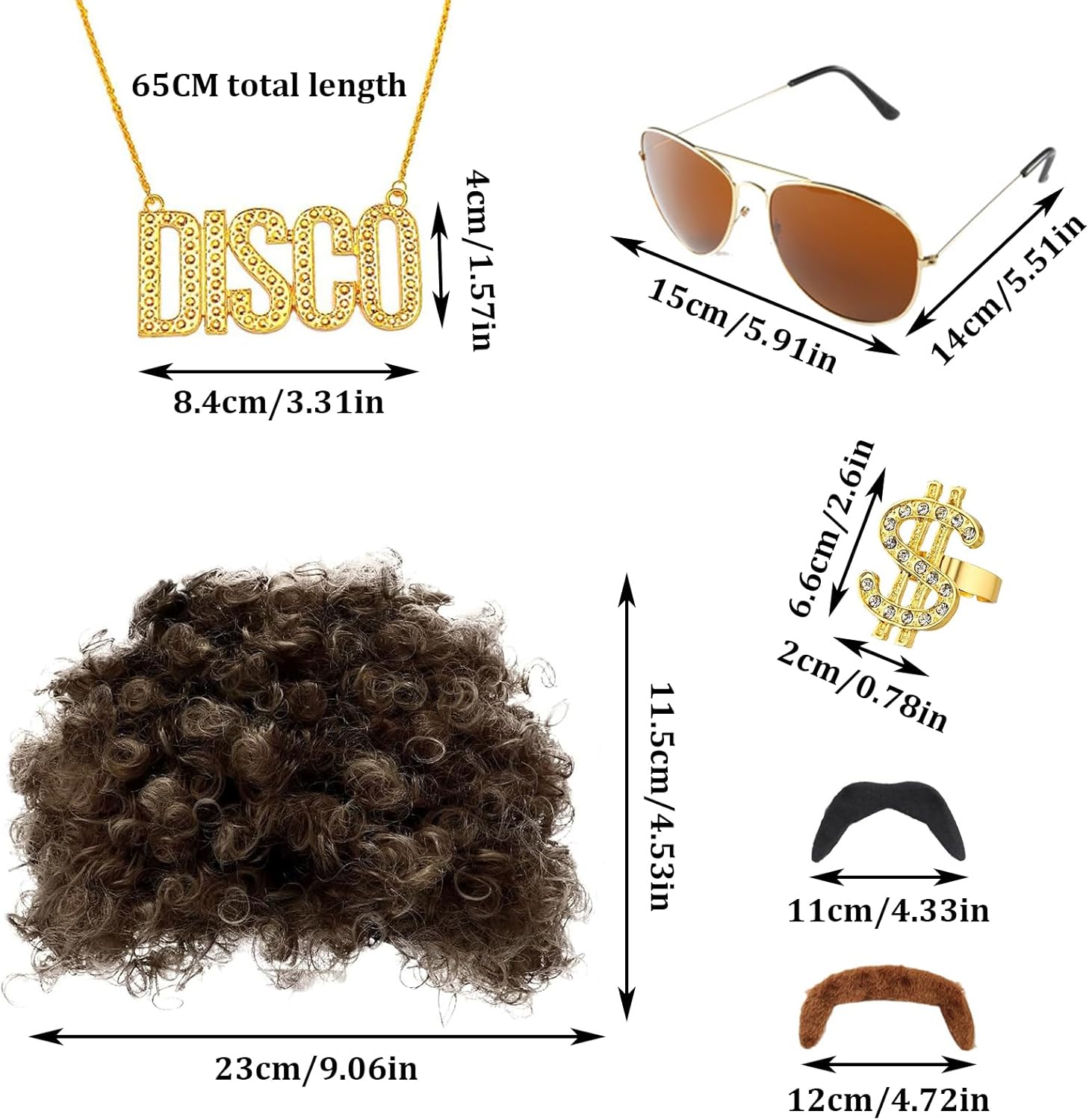 【La Confezione Include】1 confezione di parrucca afro gigante marrone, 1 occhiali da sole hippie, 1 collana, 1 anello e 2 pezzi di barba. L'abbigliamento ha uno stile anni '60 e '70 e si adatta sia ai giovani che agli adulti. 【Materiale Di Alta Qualità】 La parrucca è realizzata in tessuto con elastici, sembra veri capelli umani, molto naturale e adatta per un uso a lungo termine. 【Adatto a Tutti】 La parrucca gigante alla moda e gli occhiali da sole hippie sono taglie per adulti. La barba finta è autoadesiva Prima dell'uso, devi solo rimuovere la pellicola bianca sul retro della barba finta e attaccare il prodotto sulla pelle. 【Ampia Applicazione】 Questo costume hippie è adatto per feste in maschera in costumi anni '60/'70/'80, adatto per adulti, adatto per accessori da discoteca hippie, costumi da discoteca, barbe, parrucche e occhiali di Elvis, feste hippie, feste di compleanno, eventi a tema come Halloween , festival musicali e altri eventi. 【Regalo Perfetto】 L'abbigliamento da uomo è adatto per feste hippie, feste retrò, feste di compleanno, eventi a tema Halloween, festival musicali e altri eventi, molti adolescenti e adulti amano gli accessori hippie retrò alla moda, sono ottimi regali.