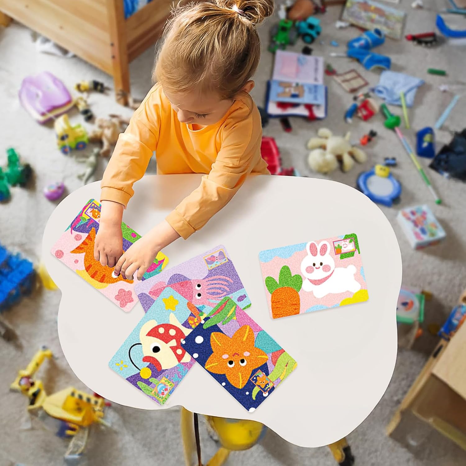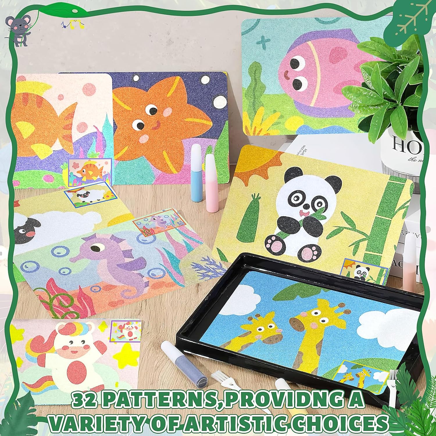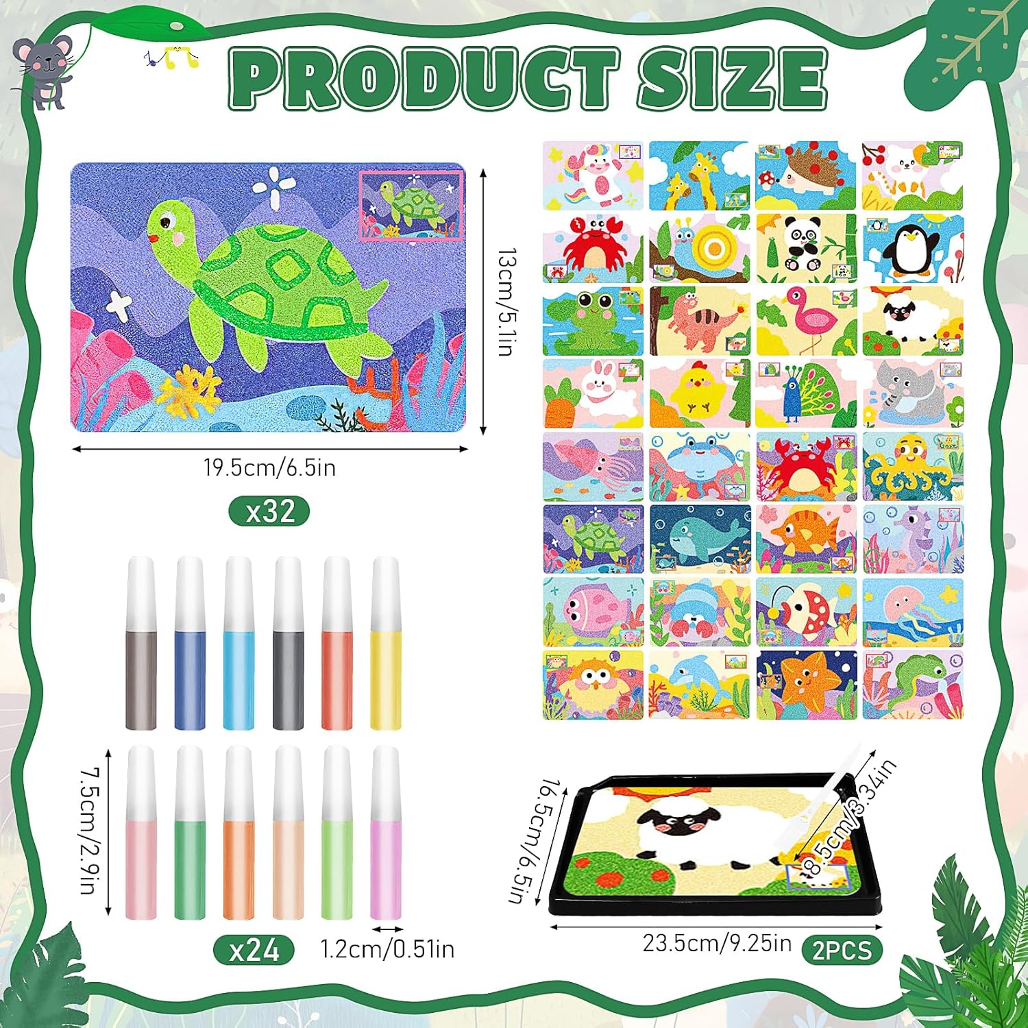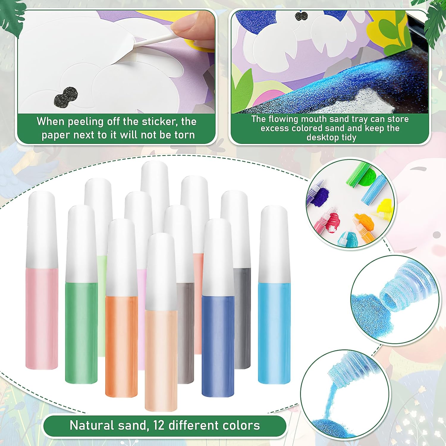 Scelta regalo ideale: ideale come regalo per compleanni, vacanze o Natale; ama esplorare la loro creatività, che è anche un collegamento di comunicazione tra te e il tuo amico, permettendoti di avere un tempo libero migliore; il nostro kit di adesivi per immagini con sabbia è un modo adatto per coltivare la loro creatività ed espressione artistica, fornire loro hobby rilassanti e appaganti, aiuta ad alleviare lo stress e rilasciare il loro artista interiore Accessori completi: i nostri kit per arte della sabbia includono un vassoio di sabbia con beccuccio a flusso, spazzole e 24 bottiglie di sabbia artigianale in 12 colori; quando si dipinge, posizionare la tavola nel vassoio della sabbia; c'è una certa altezza intorno al vassoio per evitare che la sabbia venga sparsa ovunque; la sabbia in eccesso può essere versata dall'angolo del vassoio per raccogliere la sabbia colorata in eccesso per evitare sprechi; utilizzare un pennello per spazzare via la sabbia colorata in eccesso la tavola per garantire che la tavola sia pulita Vari motivi: il nostro kit per pittura con sabbia ha 32 diversi modelli di tavole da pittura a sabbia tra cui scegliere, con diversi tipi di motivi; i motivi sono carini e ricchi, con colori vivaci, che possono aiutare la loro creatività e immaginazione Semplice e sicuro: prendi una tavola da pittura con adesivi e posizionala sul tavolo di sabbia con beccuccio, usa l'altra estremità del pennello per staccare gli adesivi, quindi versa il tuo colore preferito sulla lavagna per creare una tavola da pittura ideale; può dare pieno gioco alla loro immaginazione abbinando i colori in base ai motivi sulle carte di pittura a sabbia Contenuto della confezione: il kit di sabbia contiene 32 pezzi di tavole per pittura con sabbia con una dimensione di circa 19,5 x 13 cm, 2 vassoi per pittura con sabbia con una dimensione di circa 23,5 x 16,2 cm, 2 pennelli, 2 set di 12 bottiglie di sabbia