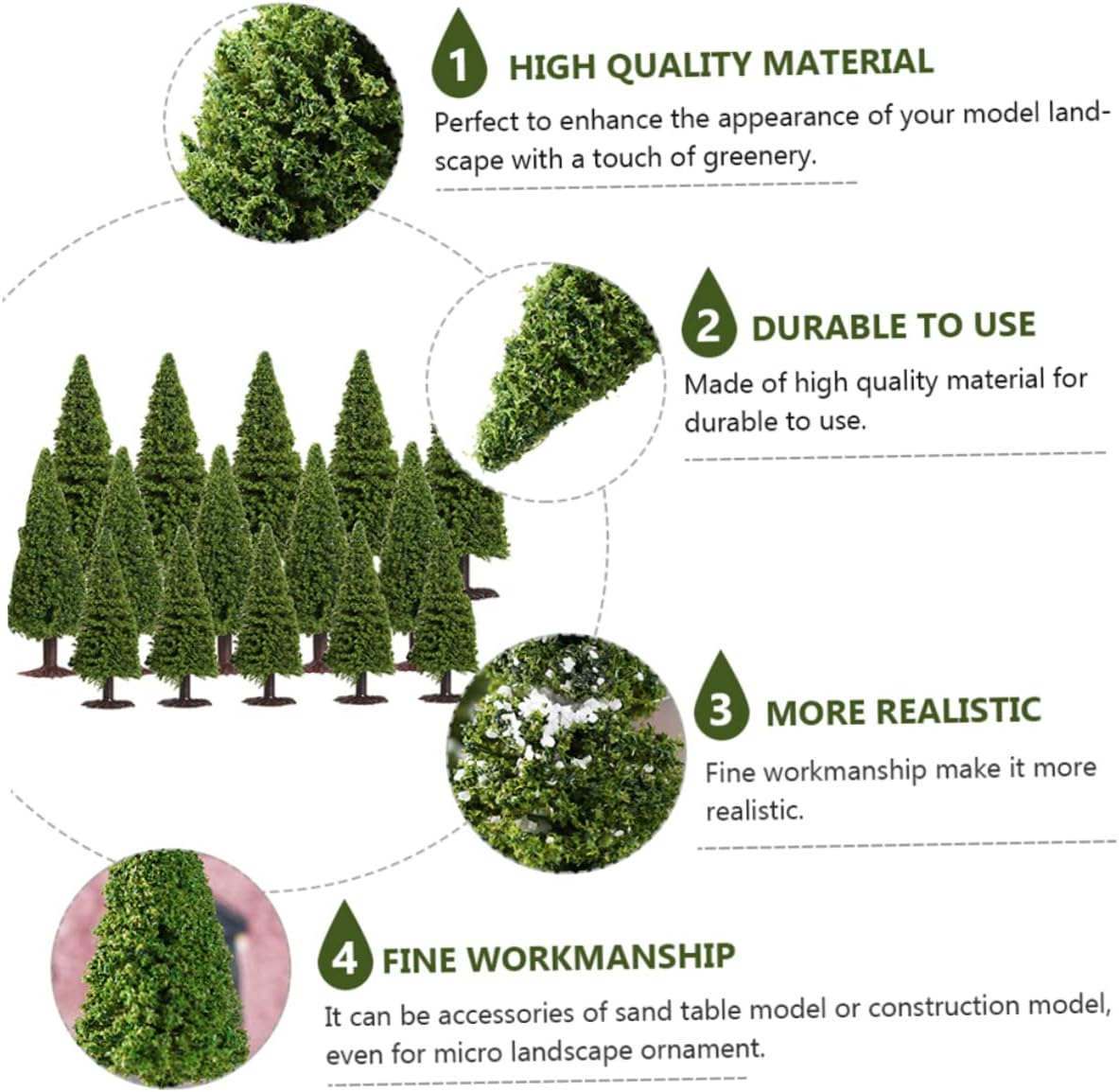 Alberi di cedro verde: adatti per creare scenario paesaggistico fai da te per renderlo più naturale. Modello di scenario: perfetto per l'aspetto del tuo paesaggio modello. Albero modello: per aggiungere una sensazione naturale al tuo fianco con questi modelli di alberi di pino. Paesaggio--ampia applicazione: adatto per l'applicazione a modelli di edifici, modelli di tavoli di sabbia, modellini di alberi di treni, modellini di giocattoli, layout di scene o decorazioni paesaggistiche, ecc. Prop per la disposizione del paesaggio: è una buona decorazione per la casa, la scrivania, il soggiorno, la cucina e così via.
