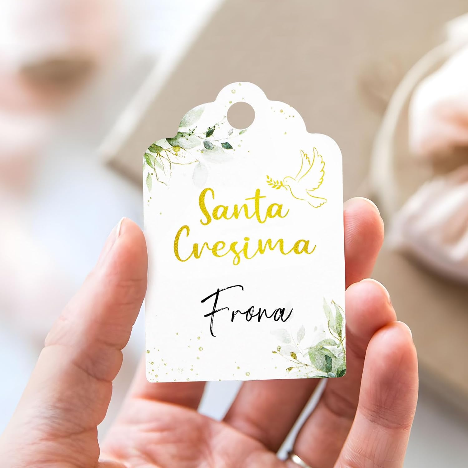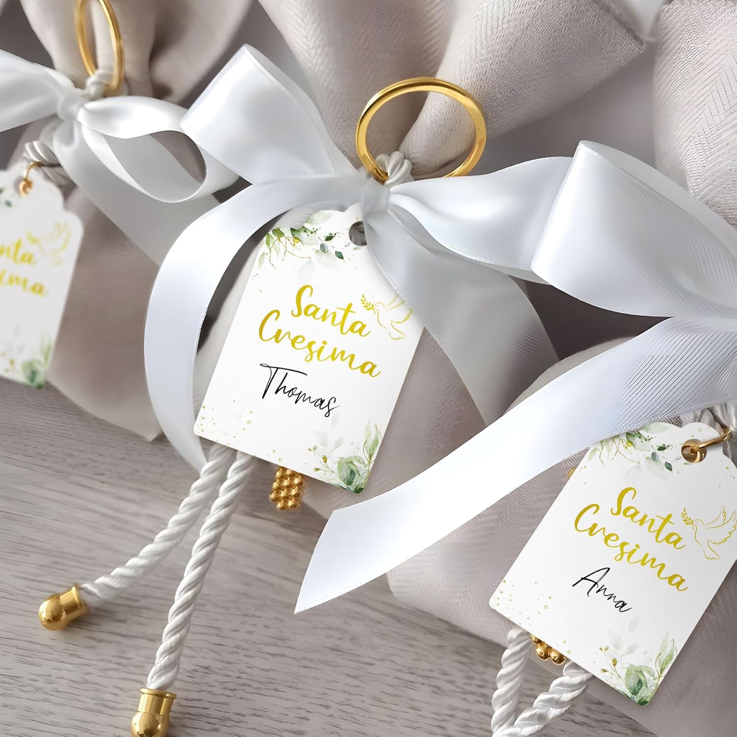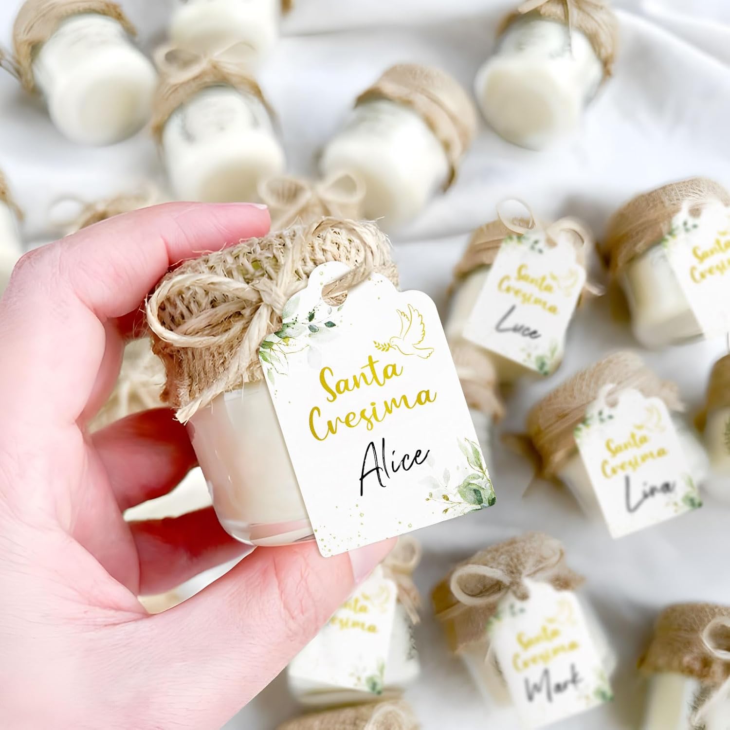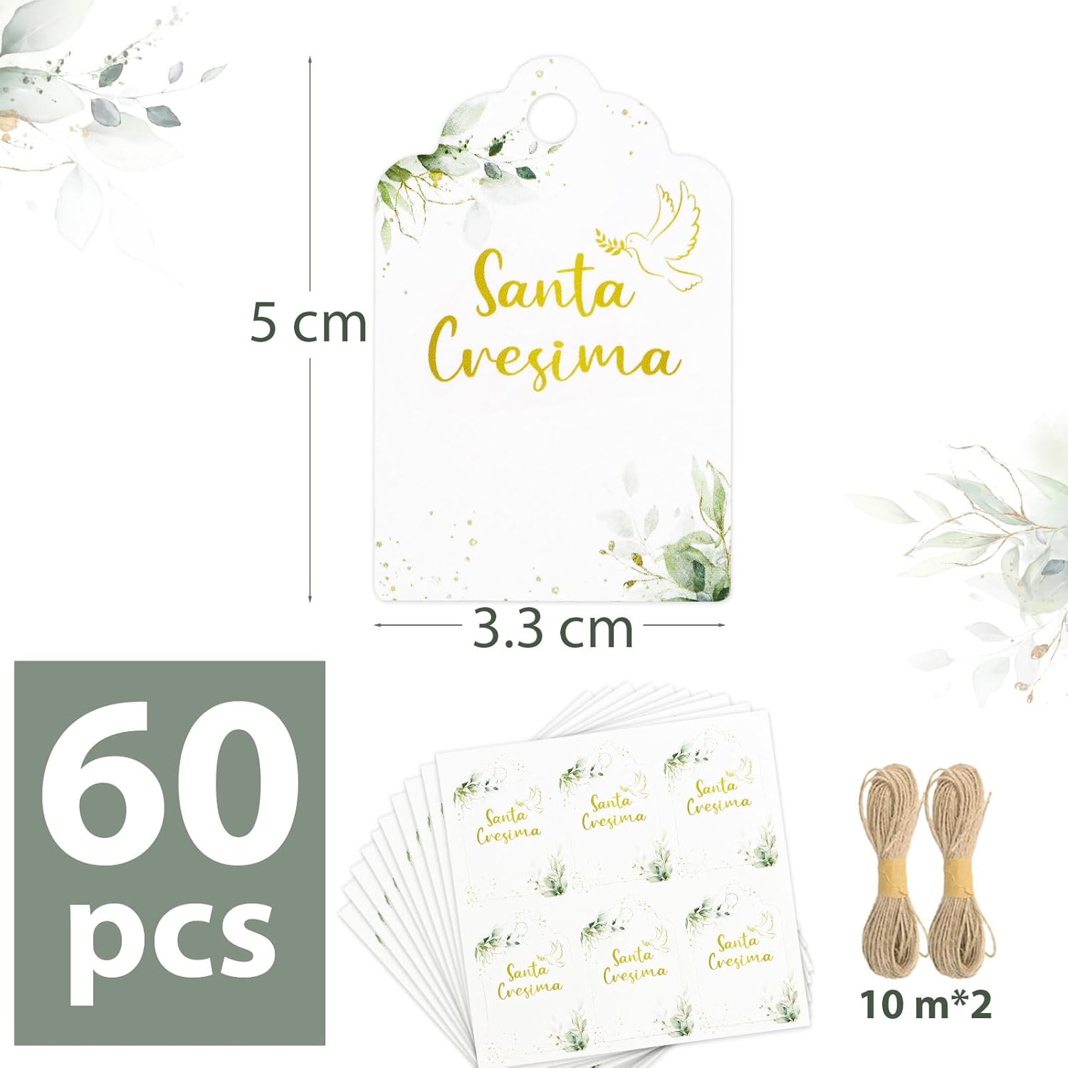 Il pacchetto include: 60pz bigliettini bomboniere cresima con 20m nastro iuta Dimensione: ogni etichette con dimensione 5*3.3cm, la lunghezza di ogni rotolo di nastro di iuta è 10m Design unico: le etichette con scritta santa cresima e stampa la foglia verde e piccone, piena degli elementi classci per sante cresima Qualità alta: le etichette per cresima sono realizzate in materiale di carta. Le etichette sono scrivibili, potrebbe scrivere i nomi e la data sulla parte bianca Ampio utilizzo: i bigliettini cresima sono ideali per decorare i barattoli, bottiglie, il regalo, i sacchetti, i confetti, le scatoline portaconfetti di santa cresima come bomboniere