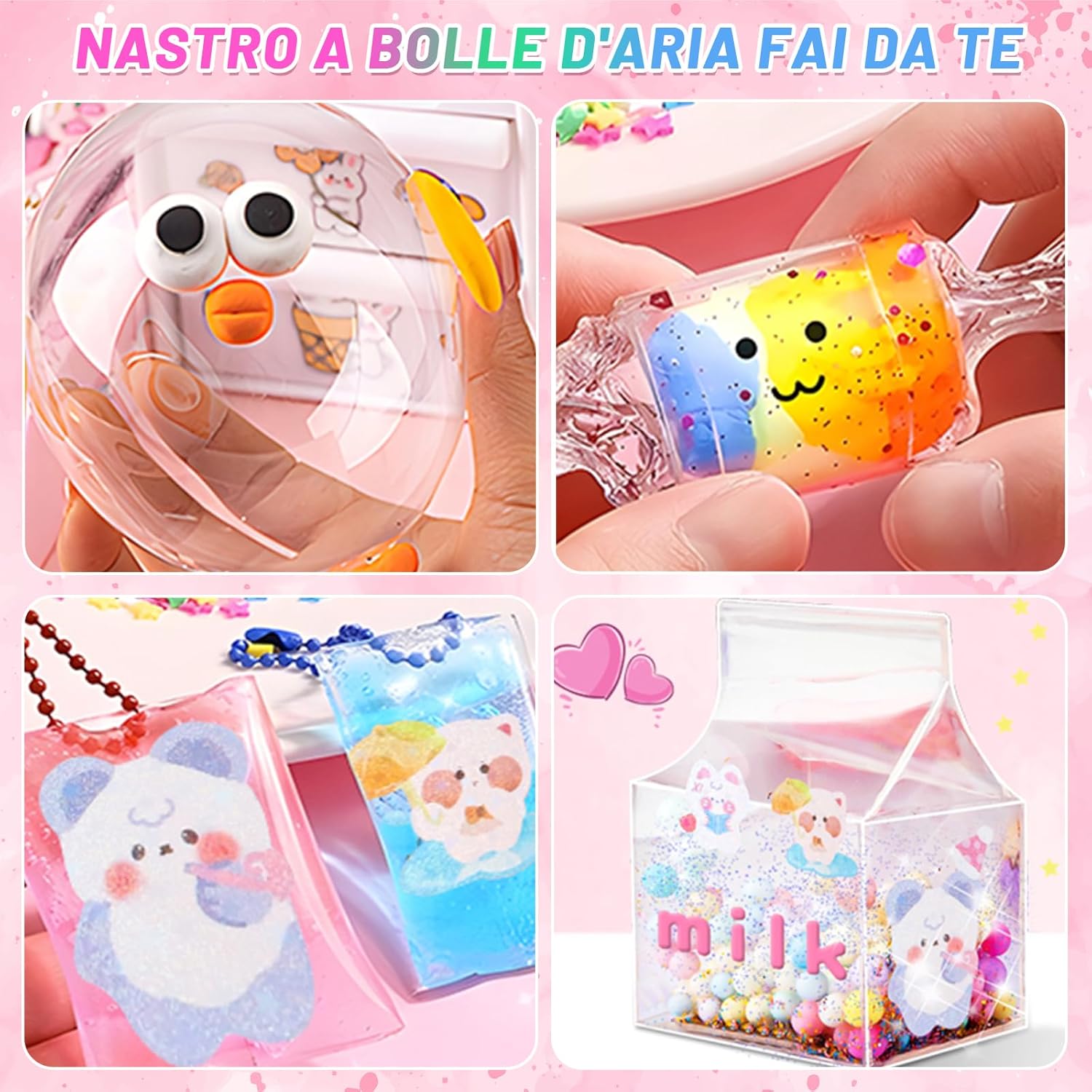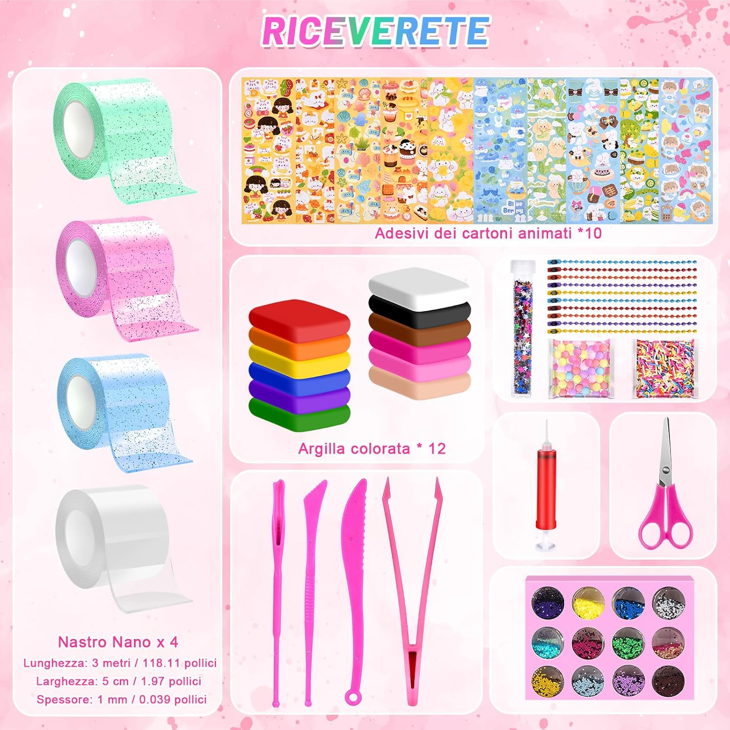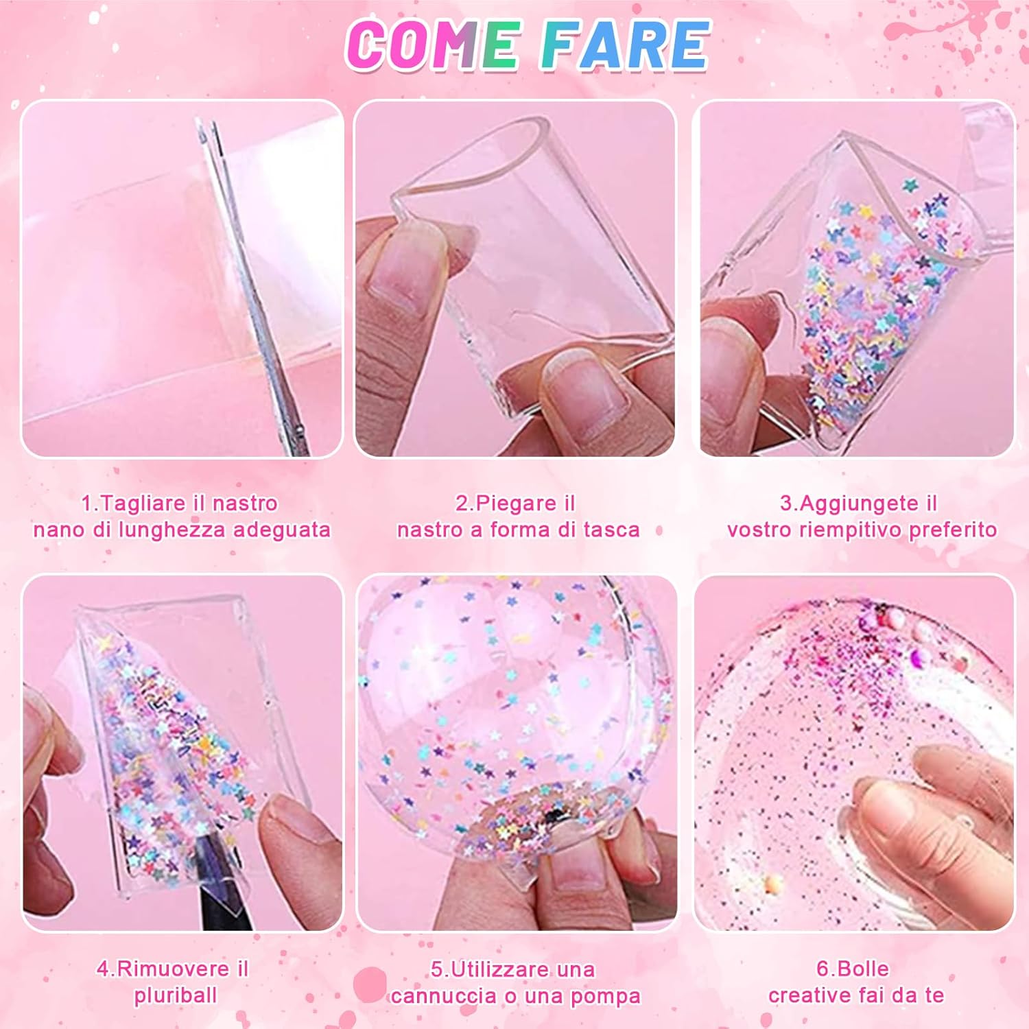 🎨Nano Tape Bubbles Set - Nano Tape x4 (bianco, rosa, blu, verde, 3 metri ciascuno), pezzi di argilla x12, pinzette x1, forbici x1, adesivi x10, pompa x1, scatole colorate x1 e altri accessori. ⭐Materiale di alta qualità - Questo nastro a bolle d'aria è realizzato in materiale atossico di alta qualità, sicuro e resistente, biadesivo, impermeabile, resistente alle alte temperature e alla trazione, può essere piegato e piegato. ✂️DIY Nano Tape Craft Kit- È possibile utilizzare tutta la vostra immaginazione per creare qualsiasi forma. E sul magico nastro a nano bolle potrete mettere alla prova le vostre abilità pittoriche. Il tempo della noia passerà in fretta e sarete felici di essere soli. 🖐️Spielzeug per la decompressione - Il nastro nano è un giocattolo elastico per la decompressione. Il kit di bolle d'aria può aiutare ad alleviare lo stress e a calmare la mente. Questo magico set di bolle di nastro nano sono la scelta perfetta per le varie attività di partito. 🎁Regalo ideale - Il set di bolle di sapone nano è il regalo perfetto per i bambini in occasione di compleanni, Natale e altre occasioni. Puoi giocare con la tua famiglia e i tuoi amici.
