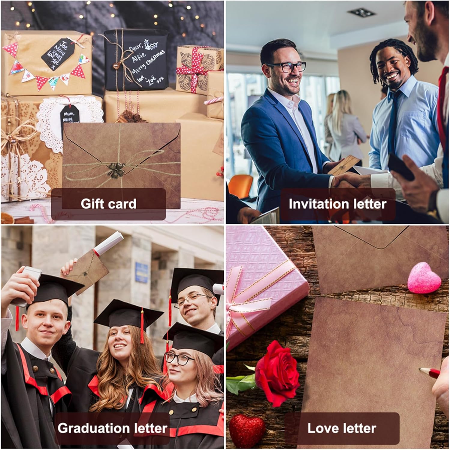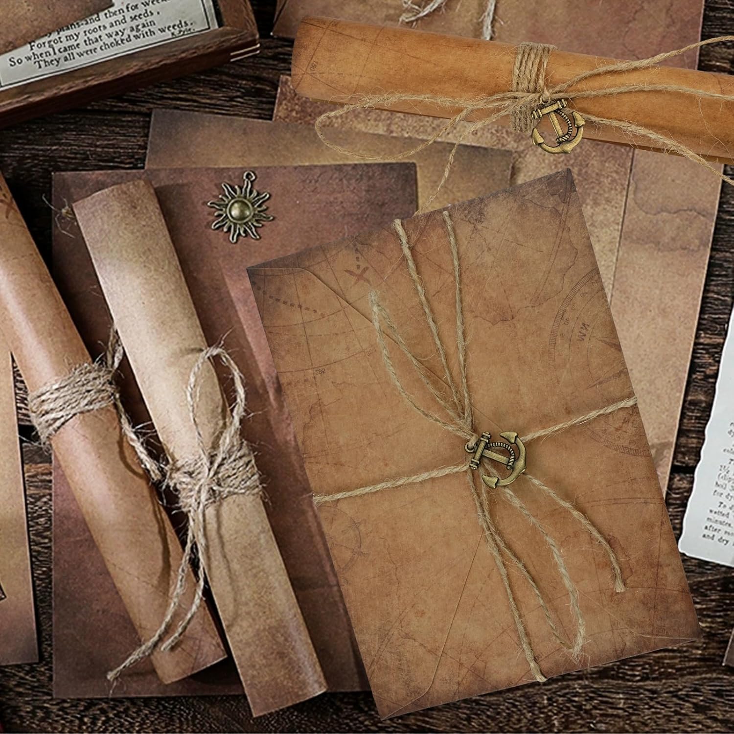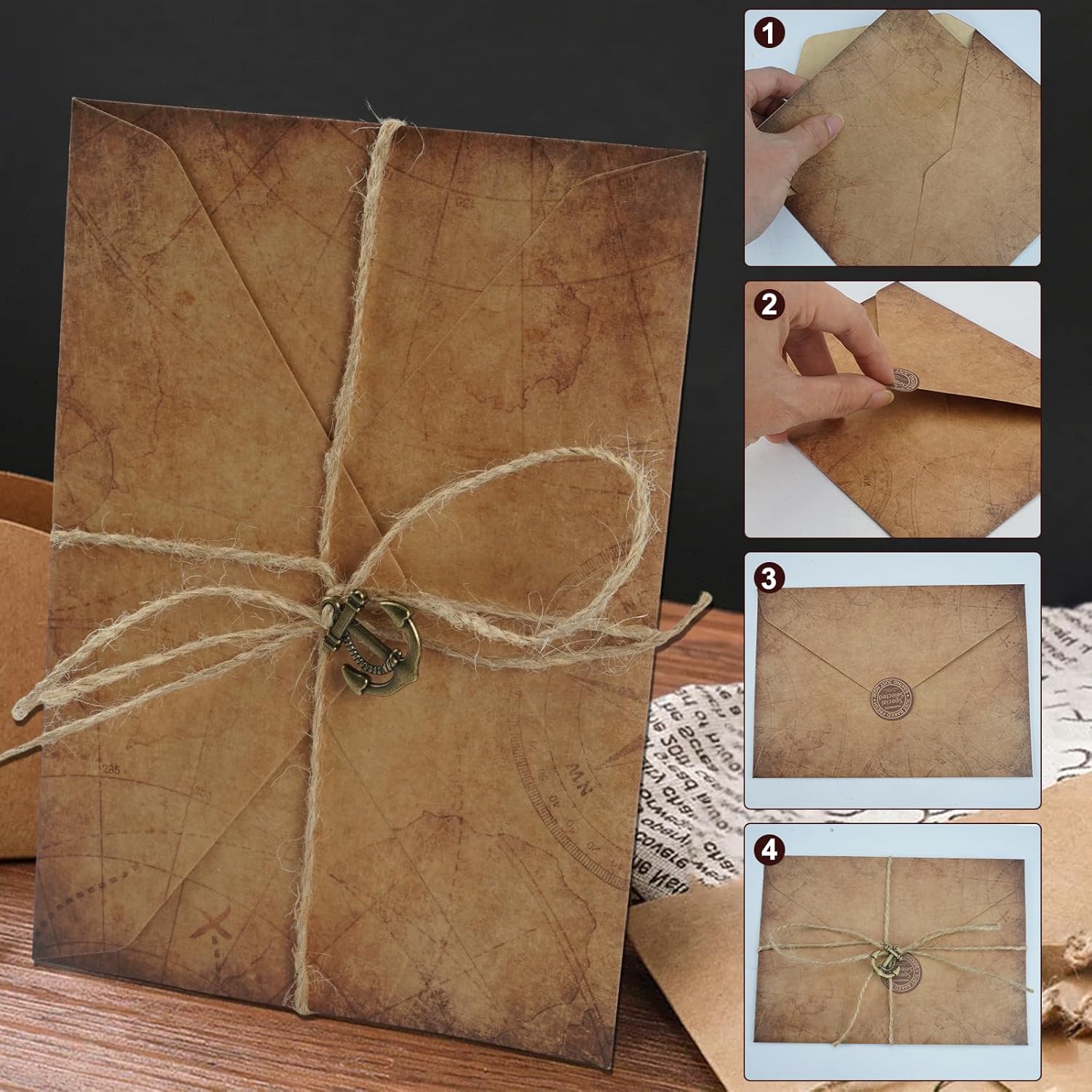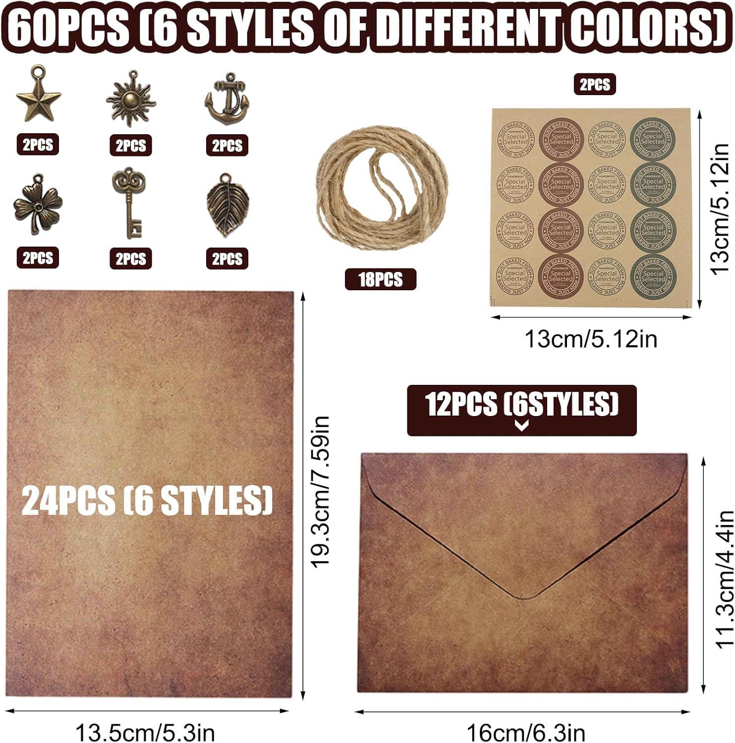 ✅【Set di carta intestata e buste vintage】 Contiene 24 fogli di carta intestata, 12 buste in pelle di mucca, 12 chiavi d'epoca, 18 pezzi di spago e 2 adesivi sigillanti d'epoca. Carta intestata: 19,4x13,5 cm; buste: 16x11,3 cm; spago: 100 cm di lunghezza. Adatto a diverse occasioni ed esigenze. ✅【Materiale di alta qualità】Carta da lettere con busta Realizzato in robusta carta kraft con texture classica, piatta e liscia, spessa e robusta, non facile da strappare e comoda da scrivere. I motivi e i colori vintage aggiungono un tocco elegante a ogni busta e biglietto. ✅【Stile vintage】Set carta da lettera Progettato con sei diversi stili vintage, tra cui foglie, ancore, chiavi, soli, stelle e quadrifogli, che rendono le vostre lettere più attraenti. I ciondoli vintage sono realizzati in metallo di alta qualità per garantire stabilità e durata. ✅【Multi-uso】Pergamena da scrivere Perfette per lettere di ringraziamento a parenti e amici, inviti a feste, decorazioni vintage, finte lettere antiche, lettere d'amore, mappe del tesoro, dipinti classici, lettere di anniversario o di laurea. ✅【Regalo eccellente】Questa cancelleria vintage carta da lettera con busta ha un significato straordinario e fa un grande regalo affascinante per amici, parenti e familiari per compleanni, vacanze e altre occasioni speciali.