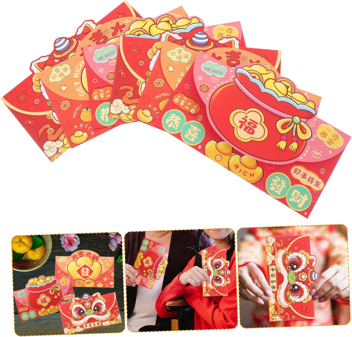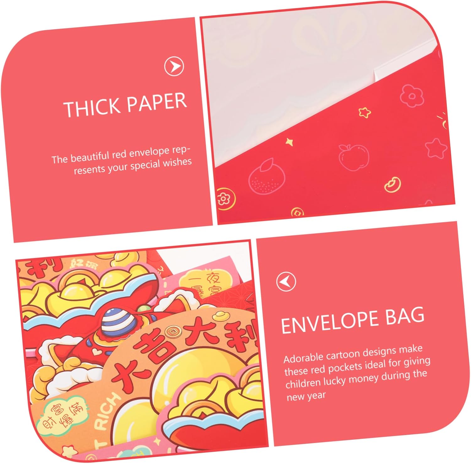 Simboli cinesi: caratterizzate da simboli cinesi, queste buste decorative sono ideali per esprimere buone benedizioni ai propri cari Ideale per molte occasioni: adatto per Capodanno cinese, Capodanno lunare, compleanni, matrimoni, Natale e altre celebrazioni speciali Materiale addensato: realizzato in carta robusta e resistente, che previene strappi e sbiadimento del Disegni carini e festosi: gli adorabili disegni dei cartoni animati rendono queste buste tascabili rosse particolarmente attraenti per i bambini, aggiungendo un tocco festoso alla tradizione di soldi fortunati Spazio : ogni sacchetto porta soldi portafortuna può contenere comodamente a banconote, rendendolo ideale per generosi regali in contanti
