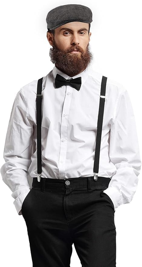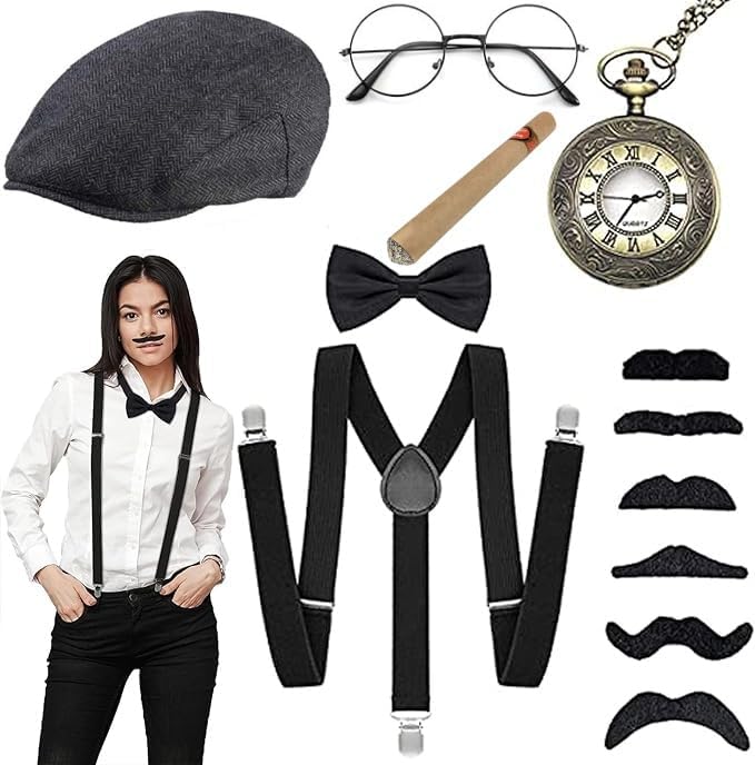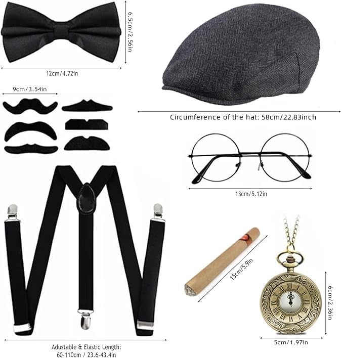 Descrizione prodotto Costume anni '20, accessori da uomo, costume da mafia da uomo, Peaky Blinders Costume Descrizione: - Il nostro set di costumi da uomo anni '20 da 7 pezzi renderà il tuo outfit ancora più divertente, vintage ed elegante. - Il popolare costume vintage da uomo degli anni '20 è perfetto per una varietà di feste a tema, Halloween, carnevale, balli vintage del 20° Specifiche: Materiale: poliestere, lana, metallo. Colore: nero Dimensioni: come mostrato nell'immagine. La confezione include: 1 papillon. 1 paio di bretelle. 1 barba (6 stili). 1 paio di occhiali decorativi. 1 cappello da gangster panamense. 1 x puntelli decorativi (solo accessori decorativi) 1 orologio da tasca (non solo oggetti di scena). È possibile inserire le proprie batterie e utilizzarle secondo necessità.) Note: dopo aver riempito l'orologio da tasca con le batterie, è necessario tirare il pulsante superiore verso l'alto, impostare l'ora e premere di nuovo per utilizzarlo. Avviso di sicurezza 1