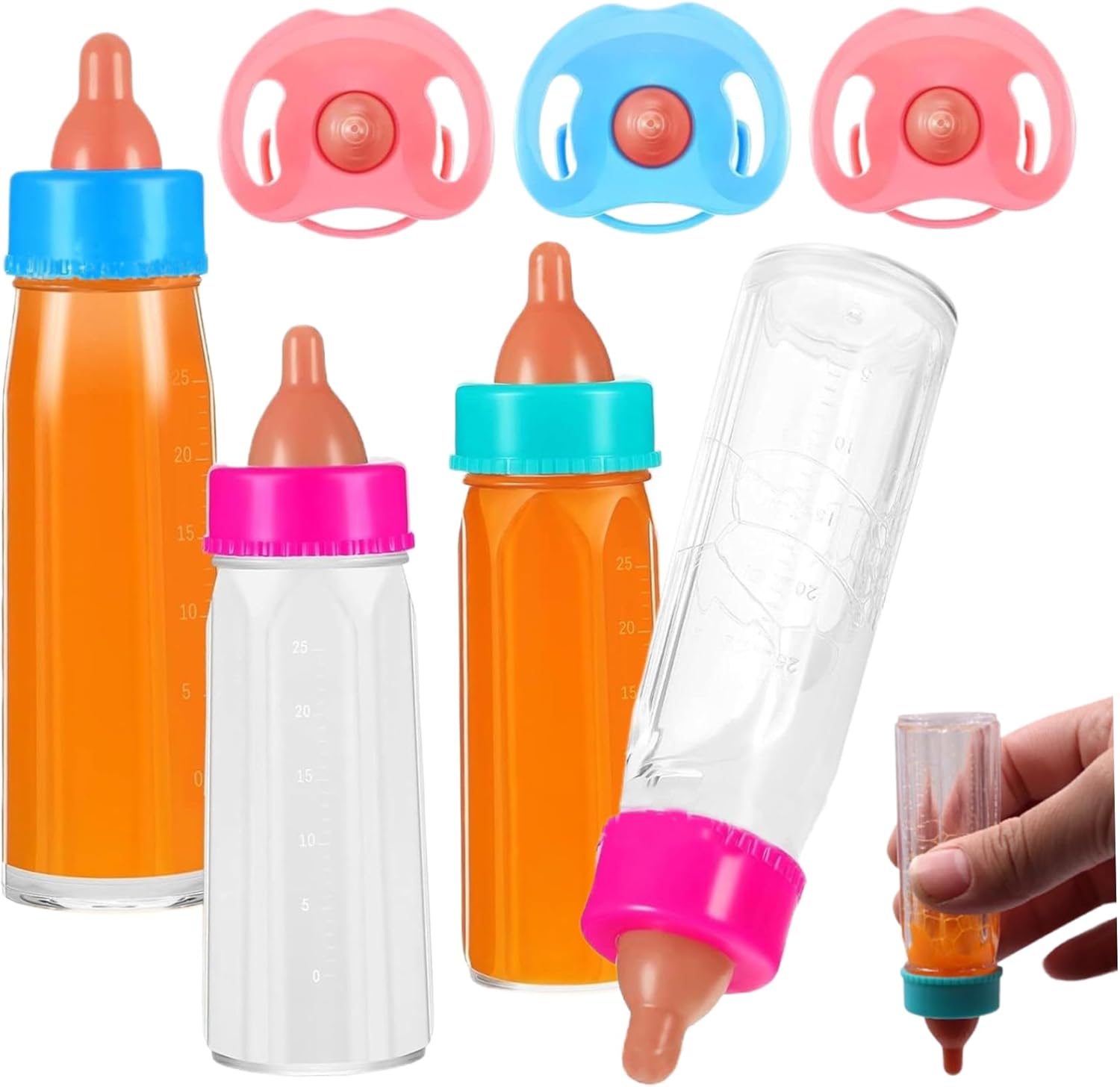 PERFETTO PER PICCOLI badanti: delizia il piccolo badante della tua vita con questo delizioso set di biberon per bambole. Ideale per compleanni, vacanze o qualsiasi altra occasione speciale, incoraggia comportamenti premurosi e apre le porte al gioco fantasioso. Set completo per bambole: questo set da 7 pezzi include 4 adorabili biberon giocattolo e 3 graziosi ciucci, fornendo tutto ciò di cui il tuo bambino ha bisogno per un gioco fantasioso. Perfetti per nutrire e prendersi cura delle loro bambole preferite, questi accessori stimolano la creatività e migliorano la narrazione. Materiali sicuri: realizzati in PP atossico di qualità, questi biberon e ciucci per bambole sono progettati per resistere a giochi difficili. I genitori possono sentirsi sicuri di lasciare che i loro piccoli scatenino le loro capacità fantasiose con accessori sicuri e robusti. Divertente funzione di liquido che scompare: ogni bottiglia presenta un divertente effetto di latte o succo che scompare, catturando l'immaginazione del tuo bambino durante il gioco. I bambini possono far finta di dare da mangiare alle loro bambole mentre scoprono la magia della bevanda che scompare, migliorando le loro avventure di gioco di ruolo. Migliora l'apprendimento e lo sviluppo: il coinvolgimento con questo set di biberon per bambole supporta le abilità sociali, l'intelligenza emotiva e le capacità motorie dei bambini. Prendendosi cura delle loro bambole, i bambini imparano importanti lezioni sulla responsabilità in modo divertente e interattivo.