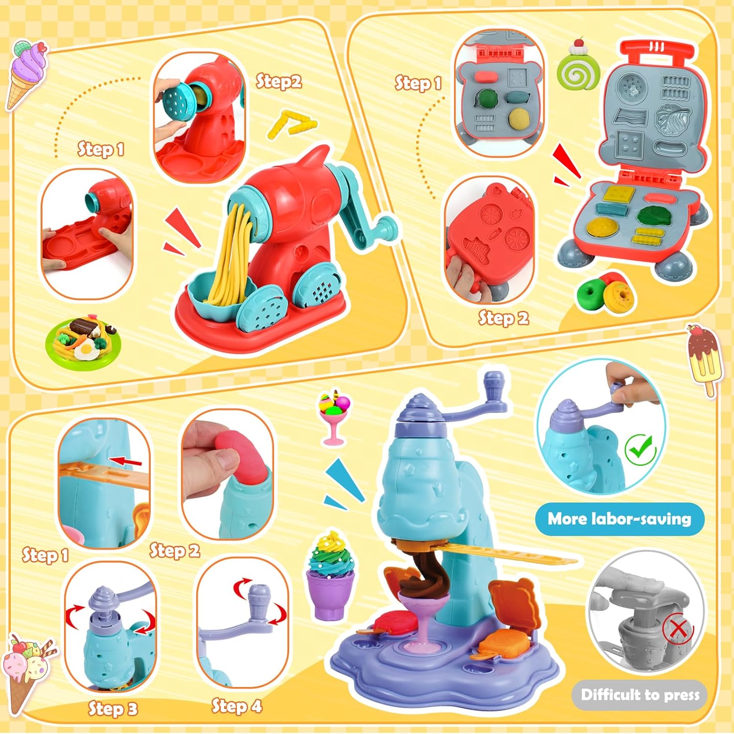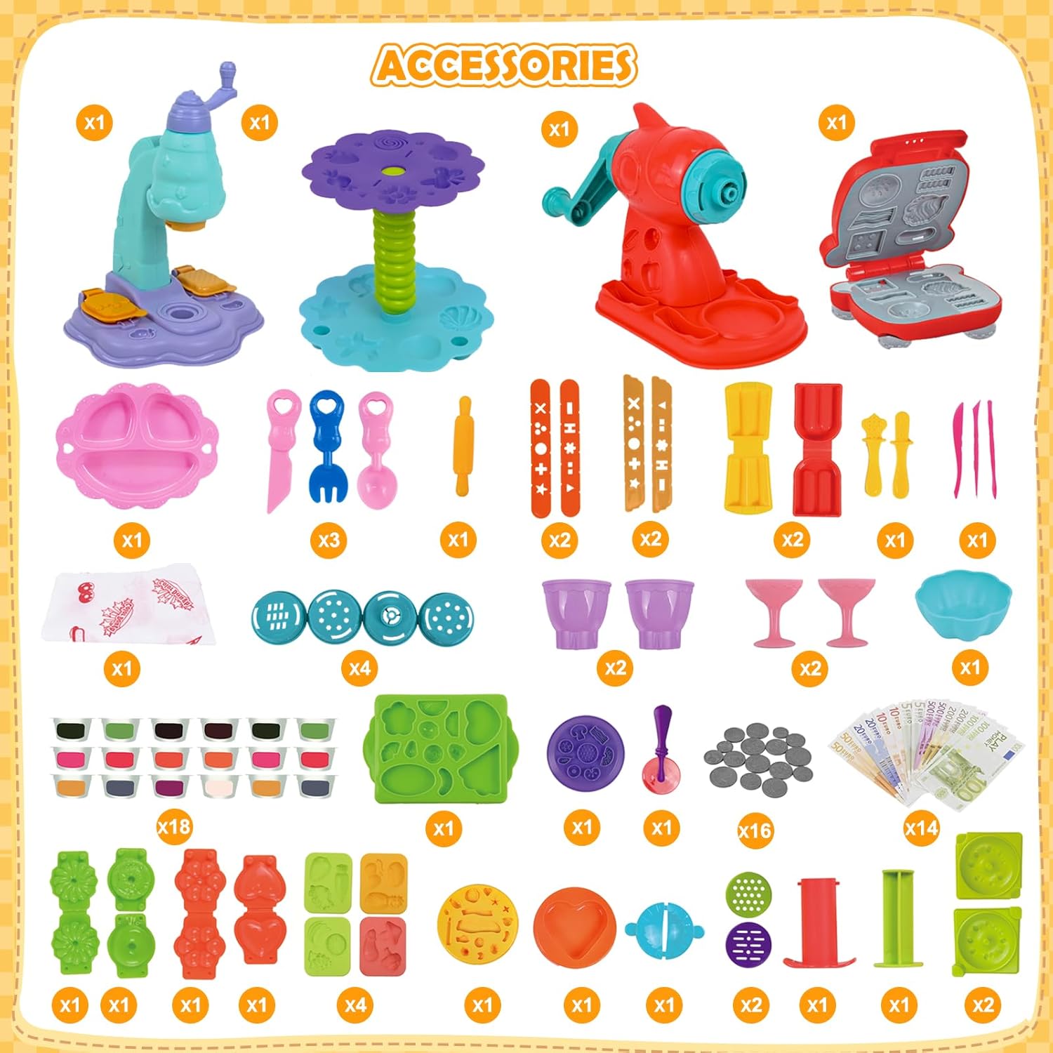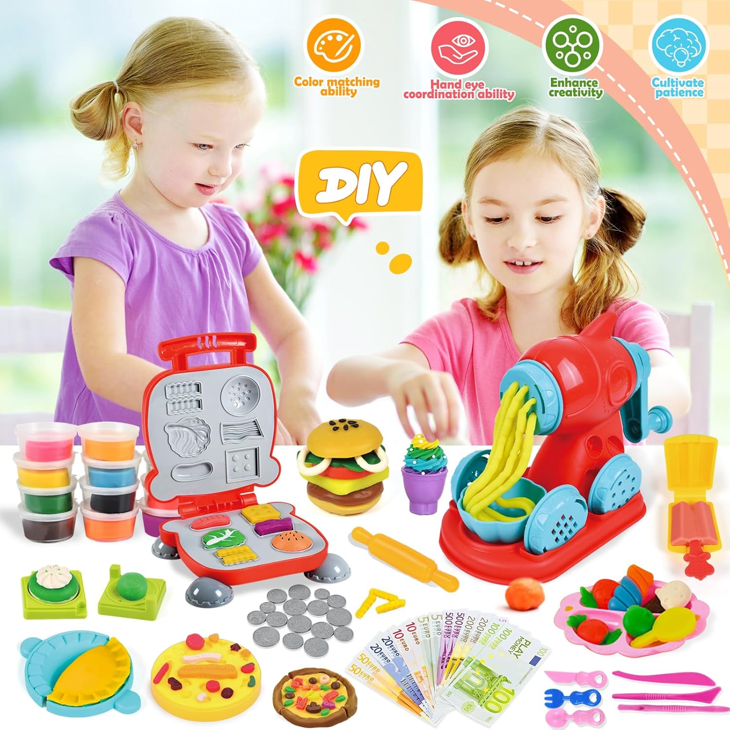 🎉🎉[Set di Pasta da Gioco per Bambini] Questo set di pasta da gioco contiene: Gelatiera, hamburgerera, spaghettatrice, stand per dolci, 18 scatole di pasta da gioco colorata, soldi per giocare e vari accessori per la pasta da gioco come tagliabiscotti per bambini, stampi per gelati, tagliagnocche e così via. Si tratta di un set da cucina completo che non richiede l'acquisto di accessori aggiuntivi, così il bambino potrà cucinare in modo creativo a casa! 🎨🎨[Set di Argilla da Modellare per Bambini] Argilla da modellare dai colori vivaci con tutti gli strumenti per modellare, perfetta per i bambini. Gli stampi da spremere rendono facile modellare la creta da modellare in qualsiasi forma. Fornisce ai bambini strumenti per tagliare, modellare, pressare, plasmare e rotolare, oltre a una varietà di monete da gioco per infinite creazioni a casa o a scuola. 🛡️🛡️[Materiale Sicuro] Ogni modellatore e strumento di modellazione, così come gli accessori di modellazione, sono realizzati in plastica sicura e di alta qualità, molto resistente e non tossica. La pasta da gioco è realizzata con farina di grano commestibile, sicura e non appiccicosa, può essere riutilizzata più volte. 🧠🧠[Promuovere la Creatività] Il set di pasta da modellare offre ai bambini una varietà di opzioni di gioco creativo. I ricchi strumenti di modellazione a tema cucina offrono ai bambini una varietà di opportunità di gioco creativo. Attraverso il gioco di ruolo e la cucina creativa, i bambini possono non solo migliorare le loro abilità manuali, ma anche realizzare pienamente la loro immaginazione e sviluppare la creatività e la capacità di risolvere i problemi. 🎁🎁[Regalo Perfetto] Il set di pasta da gioco si presenta in una bella confezione esterna ed è un regalo ideale per i bambini in occasione di compleanni, Natale e Capodanno, ma anche per feste, assemblee ed eventi scolastici. Che si tratti di un appassionato di cucina o di un fan dei giochi di ruolo, con questo set il divertimento sarà infinito.