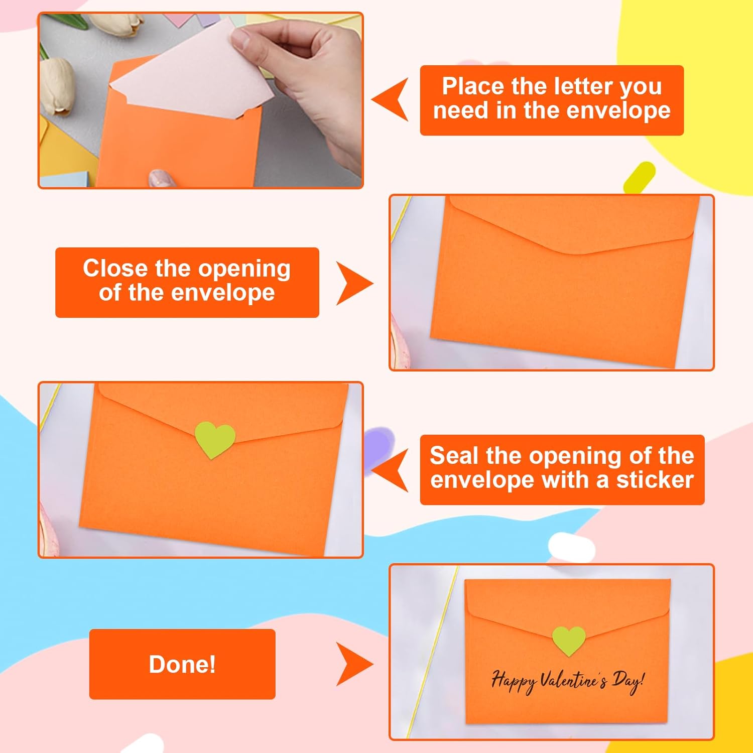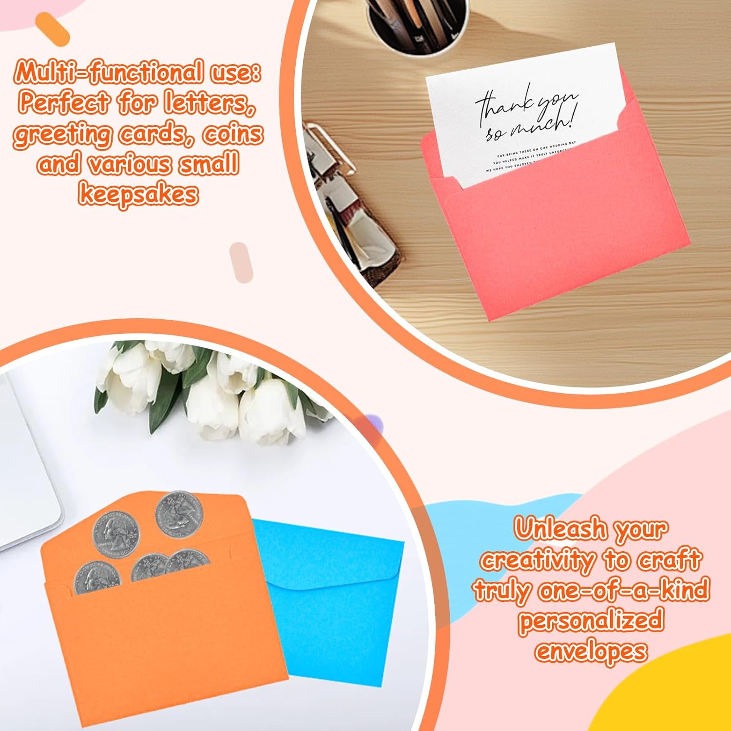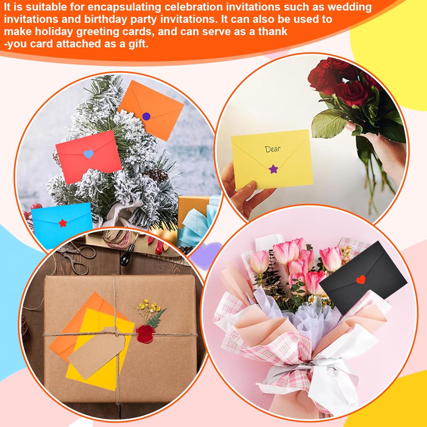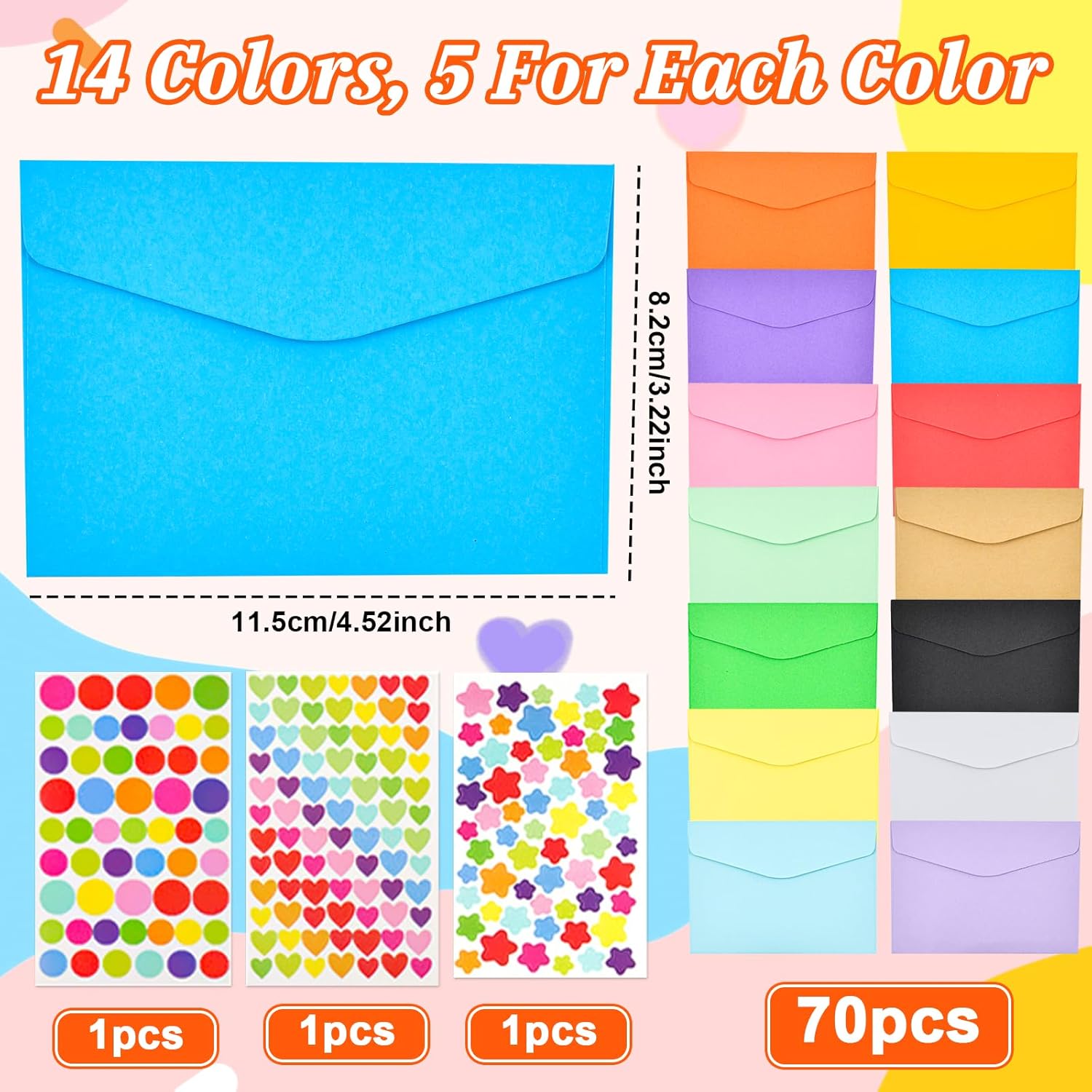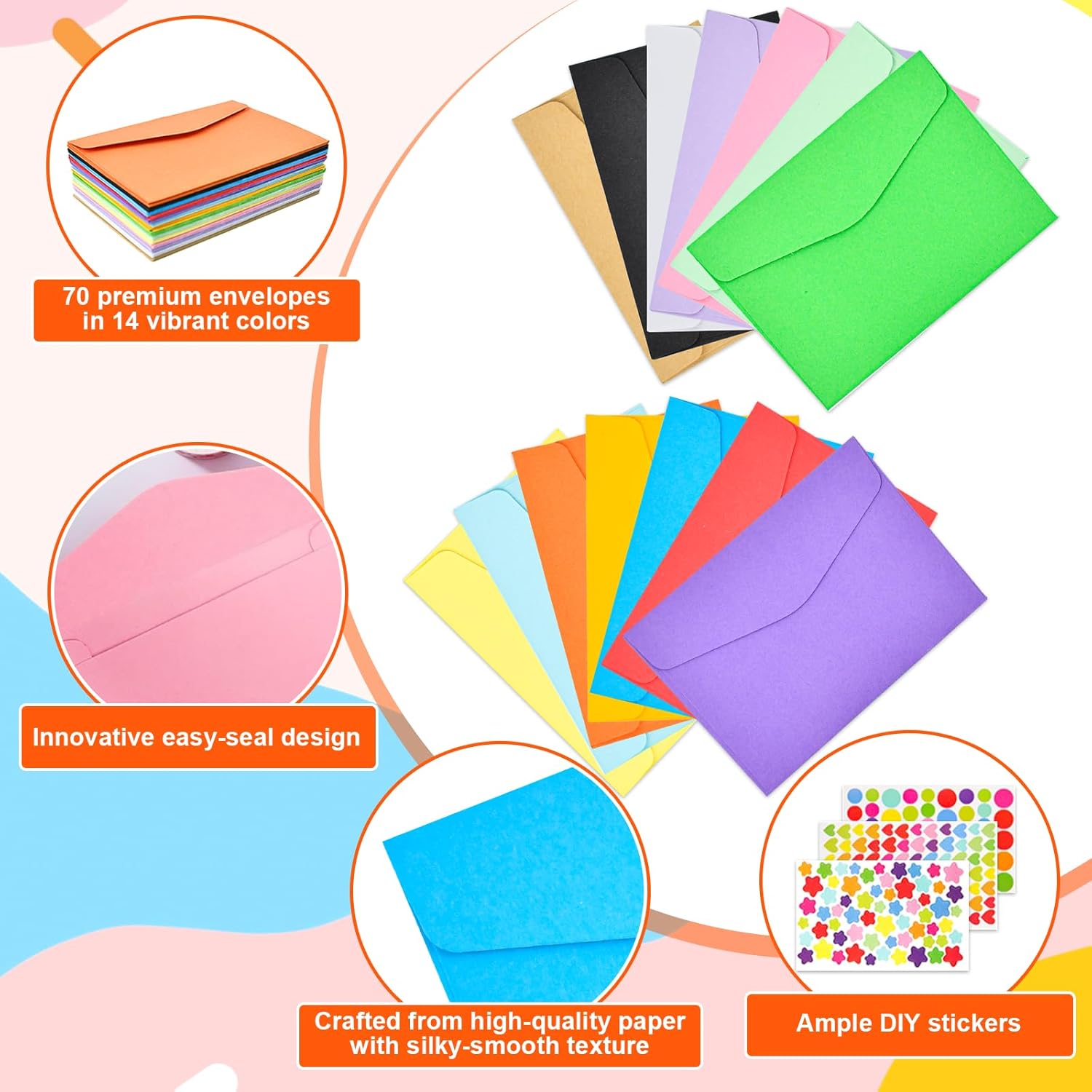 【Varietà di colori】Questo set di buste include 14 colori diversi, ciascuno con 5 buste (70 pezzi in totale). Che si tratti di corrispondenza commerciale, auguri di buone feste o lettere private, le diverse opzioni di colore consentono un design personalizzato per ogni occasione e conferiscono ai vostri invii postali un fascino speciale 【Carta di alta qualità】Realizzata in carta di prima qualità dalla consistenza vellutata e dai colori brillanti. Queste buste non solo colpiscono per il loro aspetto elegante, ma anche per la loro eccezionale durata: perfette per gli inviti di nozze e per la posta di tutti i giorni 【Adesivi creativi fai da te】Contiene 3 grandi fogli di adesivi decorativi per un design personalizzato. Ideale per gli amanti del bricolage o per chiunque voglia dare un tocco personale alle proprie lettere. Combina gli adesivi in base al contenuto o all'occasione: in questo modo ogni lettera diventa unica 【Formato lettera standard】Grazie alle pratiche dimensioni di 11,5×8,2 cm, queste buste sono perfette per biglietti o lettere standard. Risparmio di spazio e spazio sufficiente per i tuoi messaggi: una soluzione estremamente pratica 【Facili da usare】Il design semplice rende queste buste particolarmente facili da usare: basta inserire il contenuto, piegare la linguetta e sigillare con gli adesivi inclusi. La spedizione diventa un gioco da ragazzi, sia che si tratti di spedizioni in grandi quantità che di singole lettere