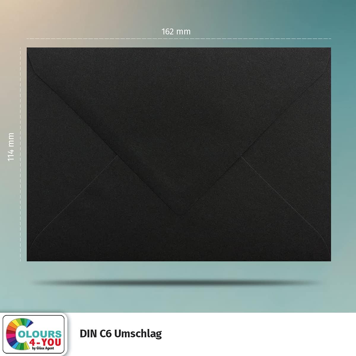 Formato: DIN C6 - 114 x 162 mm (11,4 x 16,2 cm), con incollaggio a umido e rivestimento in gomma, senza finestra Colore e classe di peso: nero - 80 g/m². Haptik: sensazione piacevolmente morbida con superficie opaca, bella profondità di colore Ideale per diverse occasioni: matrimonio, lettera standard, Natale, lutto, lettere d'amore, inviti, compleanno, nascita e artigianato (fai da te) Contenuto: 700 buste della serie - COLOURS-4-YOU.