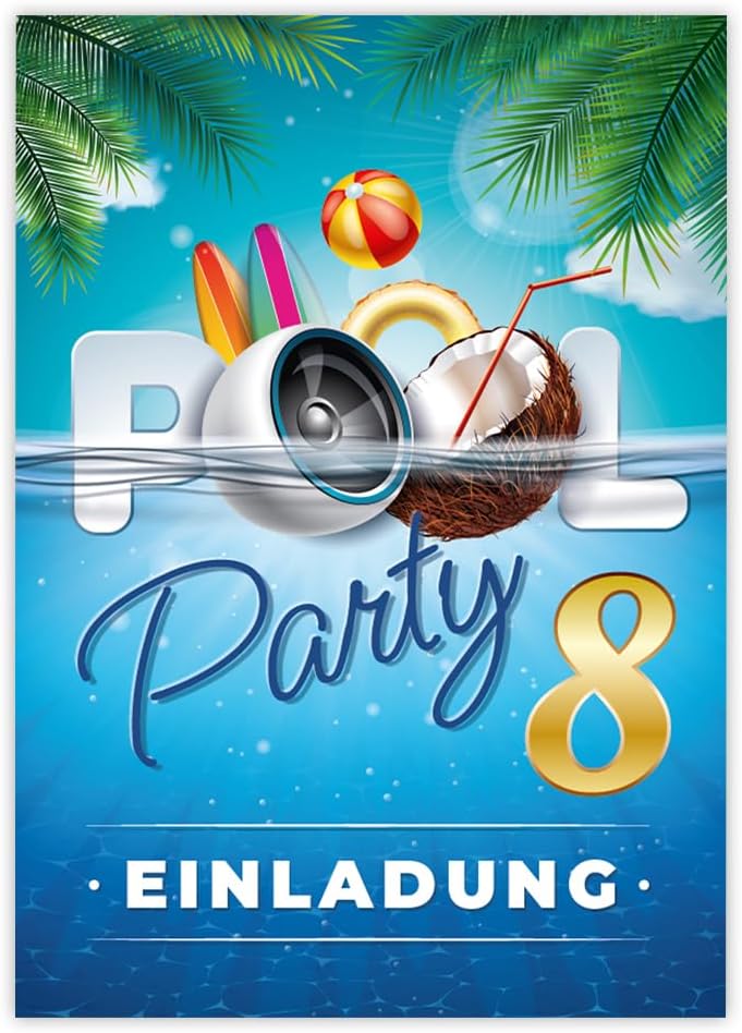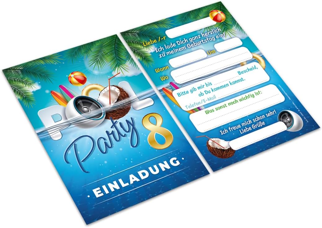 8 biglietti d'invito con 8 buste, 8° compleanno per bambini, piscina, nuoto, ragazzi, ragazze, inviti per l'ottavo compleanno