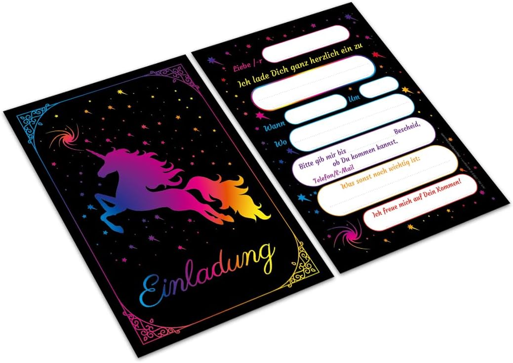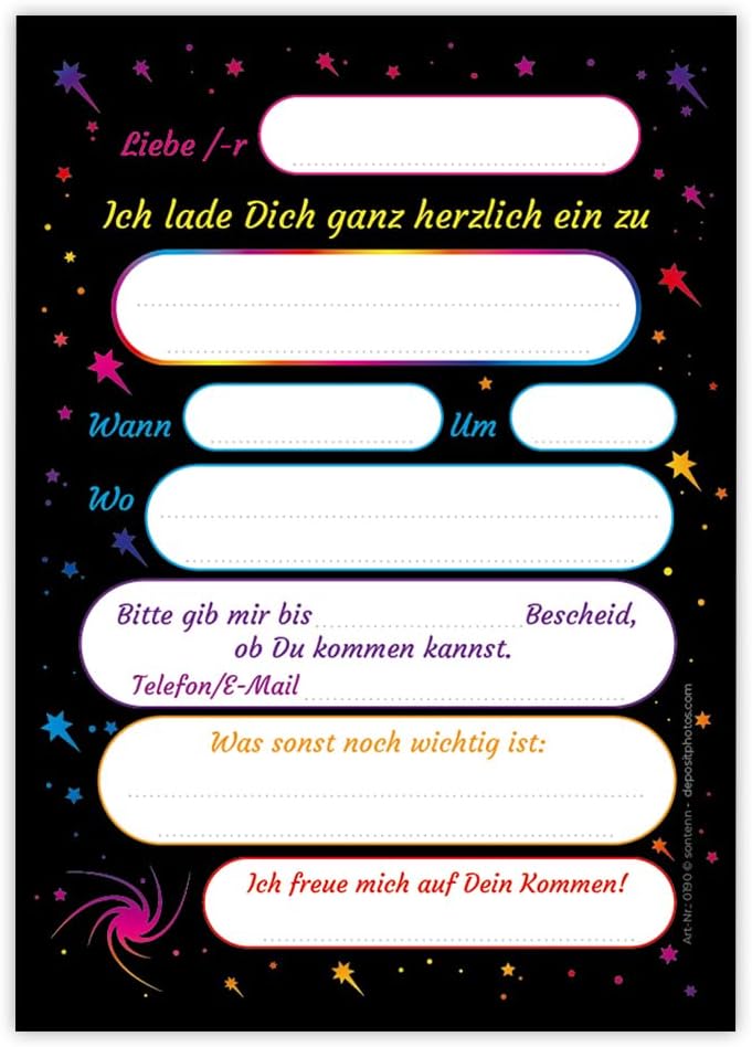 Contenuto: 8 biglietti d'invito + 8 buste Pratico: gli inviti sono moderni e progettati con molti dettagli. Sul retro troverete i campi prestampati da compilare. Biglietti: i biglietti d'invito sono molto robusti, hanno formato A6 (10,50 cm x 14,80 cm), stampa di alta qualità 300 g/m e sono rivestiti con vernice UV per la finitura. Buste autoadesive: la busta ha una dimensione di 11,40 cm x 16,20 cm, stampa da 80 g/m ed è adesiva (con striscia adesiva). Occasioni: i biglietti di invito sono molto adatti per una festa di compleanno o una festa di compleanno. È possibile utilizzare questi biglietti anche come inviti per battesimi, feste a tema, feste al cinema o feste in piscina. HAI BISOGNO DI UN ALTRO NUMERO? : da noi troverete anche biglietti e buste in set da 6, 10 o 12 pezzi. Altri motivi: nel nostro negozio troverete anche molti altri motivi di inviti, come lama, sirena, calcio, cinema, piscina, bowling. Prodotto in Germania: i biglietti e le buste sono stati prodotti in una tipografia tedesca.