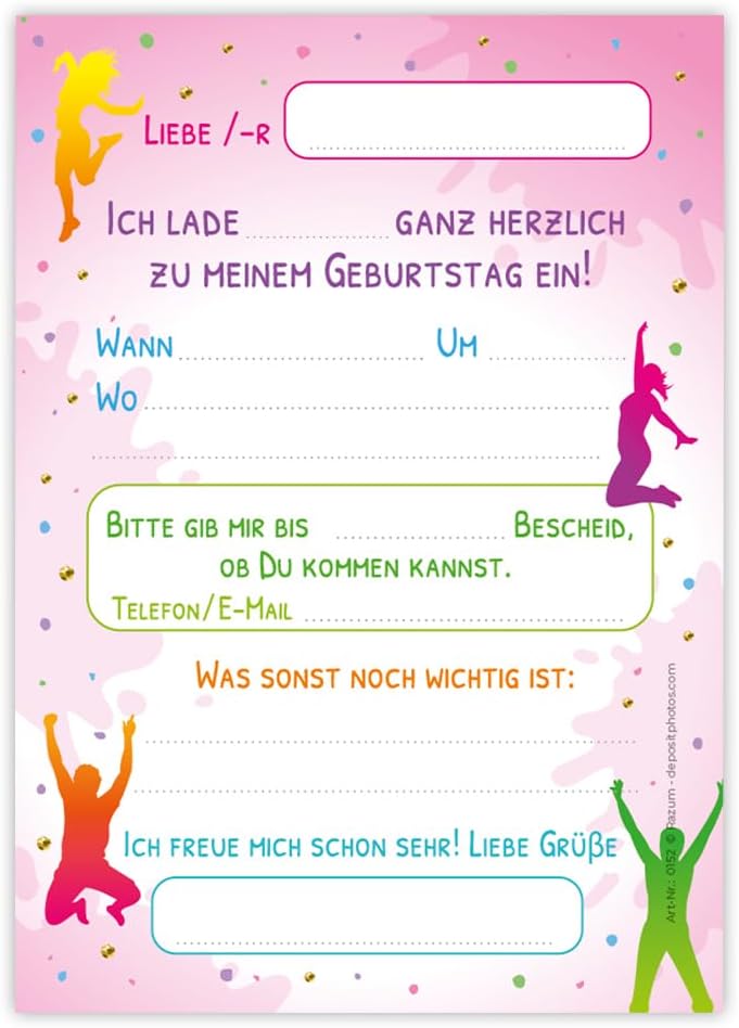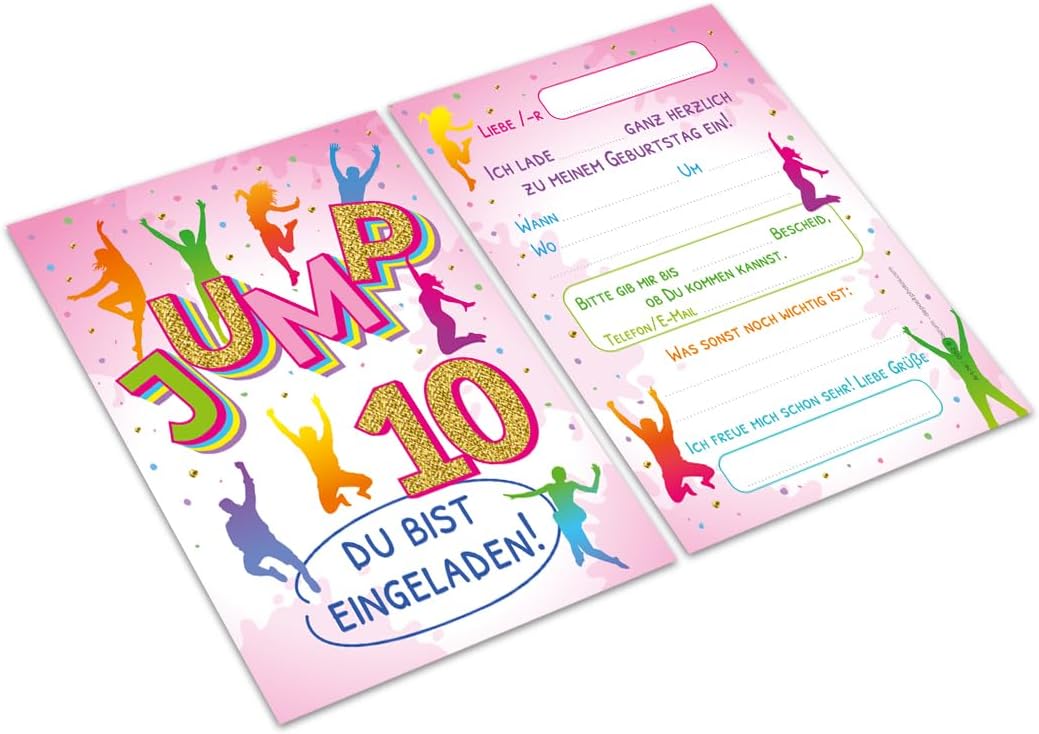 Contenuto: 8 biglietti d'invito + 8 buste Pratico: gli inviti sono moderni e progettati con molti dettagli. Sul retro troverete i campi prestampati da compilare. Biglietti: i biglietti d'invito sono molto robusti, hanno formato A6 (10,50 cm x 14,80 cm), stampa di alta qualità 300 g/m e sono rivestiti con vernice UV per la finitura. Buste autoadesive: la busta ha una dimensione di 11,40 cm x 16,20 cm, stampa da 80 g/m ed è adesiva (con striscia adesiva). Occasioni: i biglietti di invito sono molto adatti per una festa di compleanno o una festa di compleanno. È possibile utilizzare questi biglietti anche come inviti per battesimi, feste a tema, feste al cinema o feste in piscina. HAI BISOGNO DI UN ALTRO NUMERO? : da noi troverete anche biglietti e buste in set da 6, 10 o 12 pezzi. Altri motivi: nel nostro negozio troverete anche molti altri motivi di inviti, come lama, sirena, calcio, cinema, piscina, bowling. Prodotto in Germania: i biglietti e le buste sono stati prodotti in una tipografia tedesca.