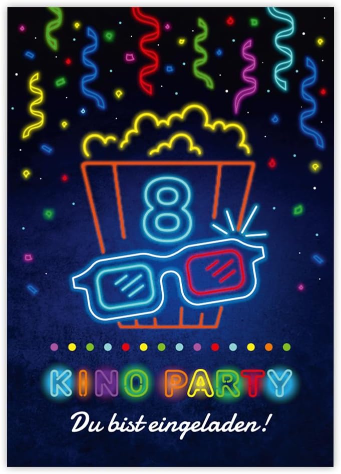 Contenuto: 8 biglietti d'invito + 8 buste Pratico: gli inviti sono moderni e progettati con molti dettagli. Sul retro troverete i campi prestampati da compilare. Biglietti: i biglietti d'invito sono molto robusti, hanno formato A6 (10,50 cm x 14,80 cm), stampa di alta qualità 300 g/m e sono rivestiti con vernice UV per la finitura. Buste autoadesive: la busta ha una dimensione di 11,40 cm x 16,20 cm, stampa da 80 g/m ed è adesiva (con striscia adesiva). Occasioni: i biglietti di invito sono molto adatti per una festa di compleanno o una festa di compleanno. È possibile utilizzare questi biglietti anche come inviti per battesimi, feste a tema, feste al cinema o feste in piscina. HAI BISOGNO DI UN ALTRO NUMERO? : da noi troverete anche biglietti e buste in set da 6, 10 o 12 pezzi. Altri motivi: nel nostro negozio troverete anche molti altri motivi di inviti, come lama, sirena, calcio, cinema, piscina, bowling. Prodotto in Germania: i biglietti e le buste sono stati prodotti in una tipografia tedesca.