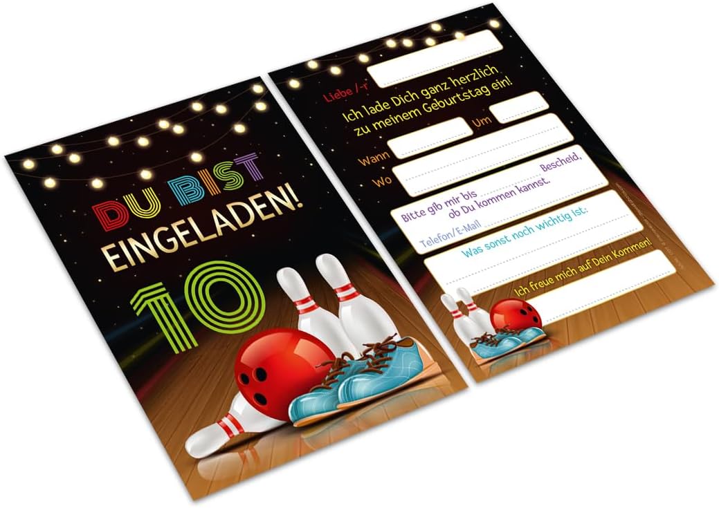 8 biglietti d'invito con 8 buste per il 10° compleanno per bambini, coni, bowling, ragazze, ragazzi, inviti, decimo compleanno, set di inviti per bambini