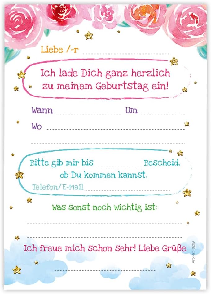 Contenuto: 8 biglietti d'invito + 8 buste Pratico: gli inviti sono moderni e progettati con molti dettagli. Sul retro troverete i campi prestampati da compilare. Biglietti: i biglietti d'invito sono molto robusti, hanno formato A6 (10,50 cm x 14,80 cm), stampa di alta qualità 300 g/m e sono rivestiti con vernice UV per la finitura. Buste autoadesive: la busta ha una dimensione di 11,40 cm x 16,20 cm, stampa da 80 g/m ed è adesiva (con striscia adesiva). Occasioni: i biglietti di invito sono molto adatti per una festa di compleanno o una festa di compleanno. È possibile utilizzare questi biglietti anche come inviti per battesimi, feste a tema, feste al cinema o feste in piscina. HAI BISOGNO DI UN ALTRO NUMERO? : da noi troverete anche biglietti e buste in set da 6, 10 o 12 pezzi. Altri motivi: nel nostro negozio troverete anche molti altri motivi di inviti, come lama, sirena, calcio, cinema, piscina, bowling. Prodotto in Germania: i biglietti e le buste sono stati prodotti in una tipografia tedesca.