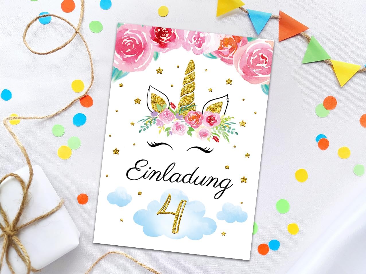 8 biglietti d'invito con 8 buste per il 4° compleanno dei bambini, motivo unicorno, invito, quarto compleanno, ragazza