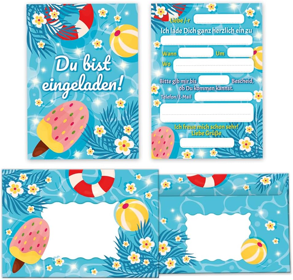 CONTENUTO: 8 biglietti d'invito + 8 buste + 8 sacchetti regalo/rosa + 8 adesivi PRATICO: con questo set avrai non solo inviti con buste abbinate, ma anche sacchetti regalo per bomboniere e fantastici adesivi regalo da etichettare. CARTE: gli inviti sono moderni e curati nei dettagli. Sul retro troverai i campi prestampati da compilare. I biglietti d'invito sono molto stabili, hanno formato A6 (10,50 cm x 14,80 cm), stampa di immagini di alta qualità da 300 g/m² e sono rivestiti con vernice UV per la finitura. BUSTE AUTOADESIVE: la busta ha una dimensione di 11,40 cm x 16,20 cm, stampa 80 g/m ed è autoadesiva (con strisce staccabili). BUSTE REGALO: le buste di carta misurano 12 x 19 cm. I sacchetti per feste sono molto adatti per confezionare piccole bomboniere o dolci per gli ospiti. ADESIVI: gli adesivi misurano 5,2 x 14,8 cm. Tu o tuo figlio potete scrivere "Grazie" e "Piacere che tu fossi lì!" sugli adesivi. oppure scrivi il nome dell'ospite. OCCASIONE: il set da festa è molto adatto per una festa di compleanno o una festa di compleanno. Puoi utilizzare questi biglietti anche come inviti a battesimi, feste notturne, feste a tema, cinema o feste in piscina.