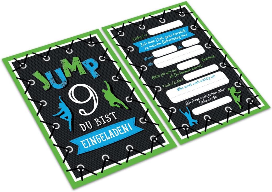 Contenuto: 8 biglietti d'invito + 8 buste Pratico: gli inviti sono moderni e progettati con molti dettagli. Sul retro troverete i campi prestampati da compilare. Biglietti: i biglietti d'invito sono molto robusti, hanno formato A6 (10,50 cm x 14,80 cm), stampa di alta qualità 300 g/m e sono rivestiti con vernice UV per la finitura. Buste autoadesive: la busta ha una dimensione di 11,40 cm x 16,20 cm, stampa da 80 g/m ed è adesiva (con striscia adesiva). Occasioni: i biglietti di invito sono molto adatti per una festa di compleanno o una festa di compleanno. È possibile utilizzare questi biglietti anche come inviti per battesimi, feste a tema, feste al cinema o feste in piscina. HAI BISOGNO DI UN ALTRO NUMERO? : da noi troverete anche biglietti e buste in set da 6, 10 o 12 pezzi. Altri motivi: nel nostro negozio troverete anche molti altri motivi di inviti, come lama, sirena, calcio, cinema, piscina, bowling. Prodotto in Germania: i biglietti e le buste sono stati prodotti in una tipografia tedesca.