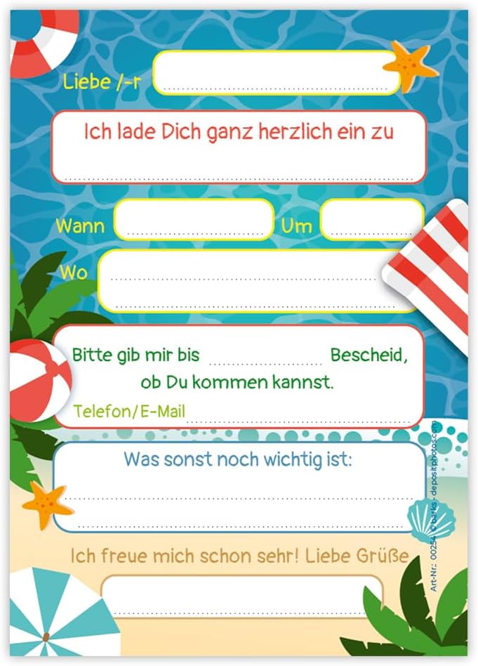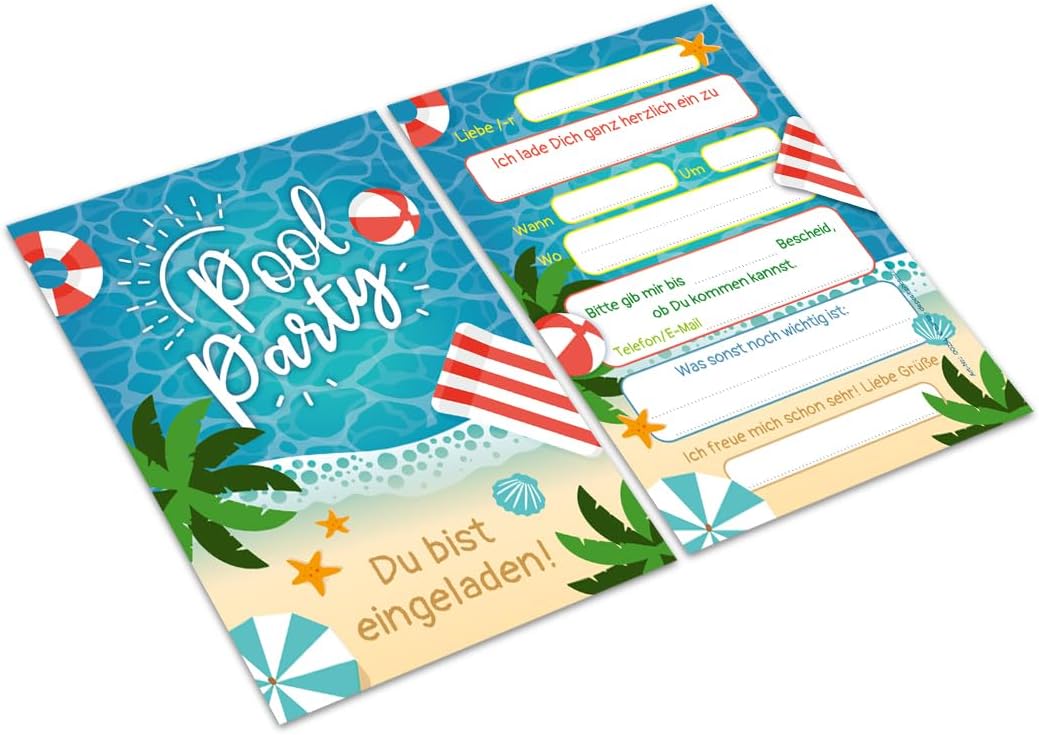 Contenuto: 8 biglietti d'invito + 8 buste Pratico: gli inviti sono moderni e progettati con molti dettagli. Sul retro troverete i campi prestampati da compilare. Biglietti: i biglietti d'invito sono molto robusti, hanno formato A6 (10,50 cm x 14,80 cm), stampa di alta qualità 300 g/m e sono rivestiti con vernice UV per la finitura. Buste autoadesive: la busta ha una dimensione di 11,40 cm x 16,20 cm, stampa da 80 g/m ed è adesiva (con striscia adesiva). Occasioni: i biglietti di invito sono molto adatti per una festa di compleanno o una festa di compleanno. È possibile utilizzare questi biglietti anche come inviti per battesimi, feste a tema, feste al cinema o feste in piscina. HAI BISOGNO DI UN ALTRO NUMERO? : da noi troverete anche biglietti e buste in set da 6, 10 o 12 pezzi. Altri motivi: nel nostro negozio troverete anche molti altri motivi di inviti, come lama, sirena, calcio, cinema, piscina, bowling. Prodotto in Germania: i biglietti e le buste sono stati prodotti in una tipografia tedesca.