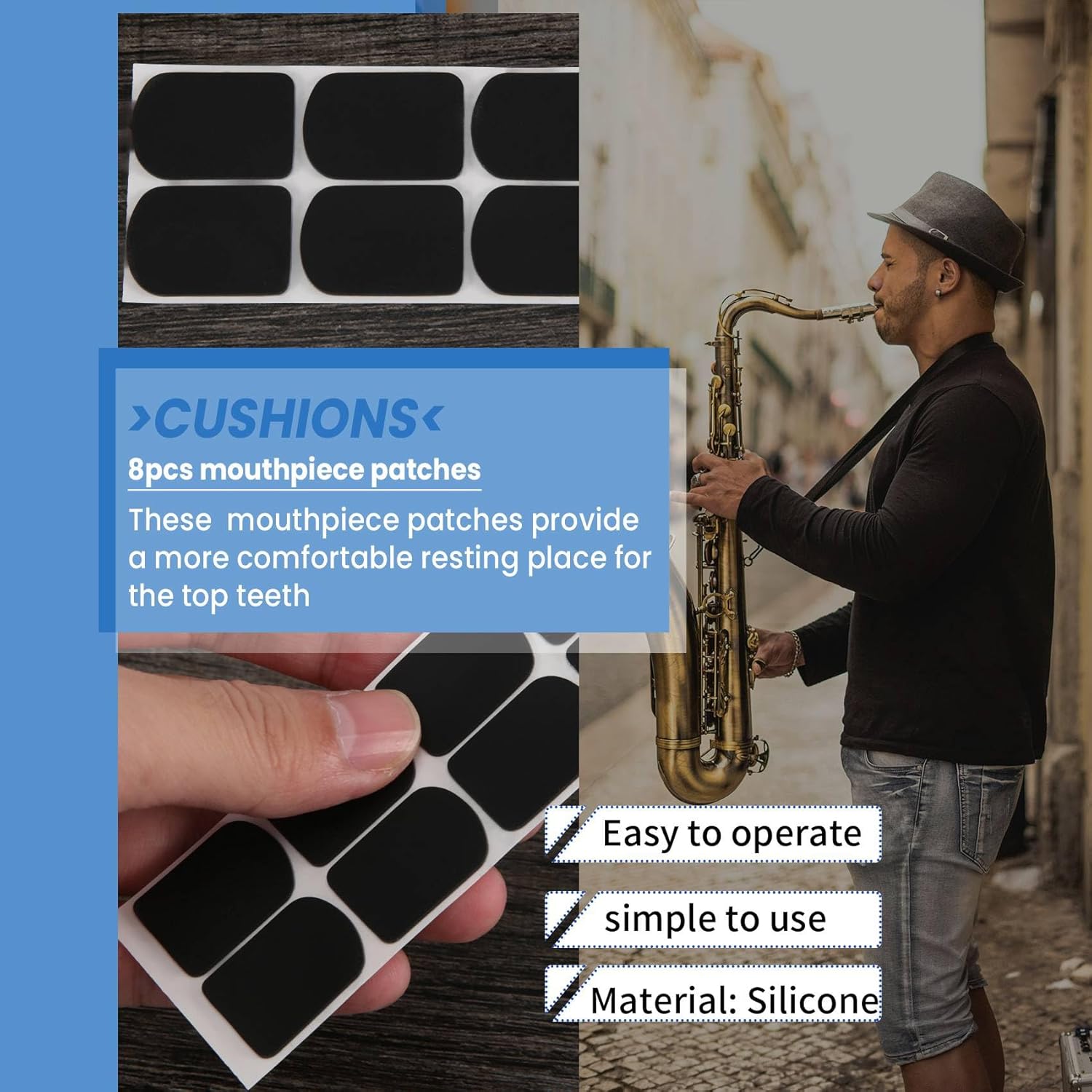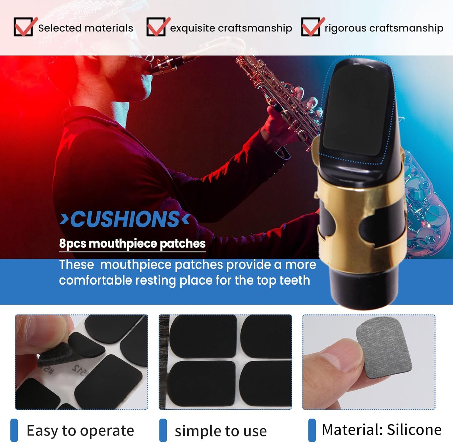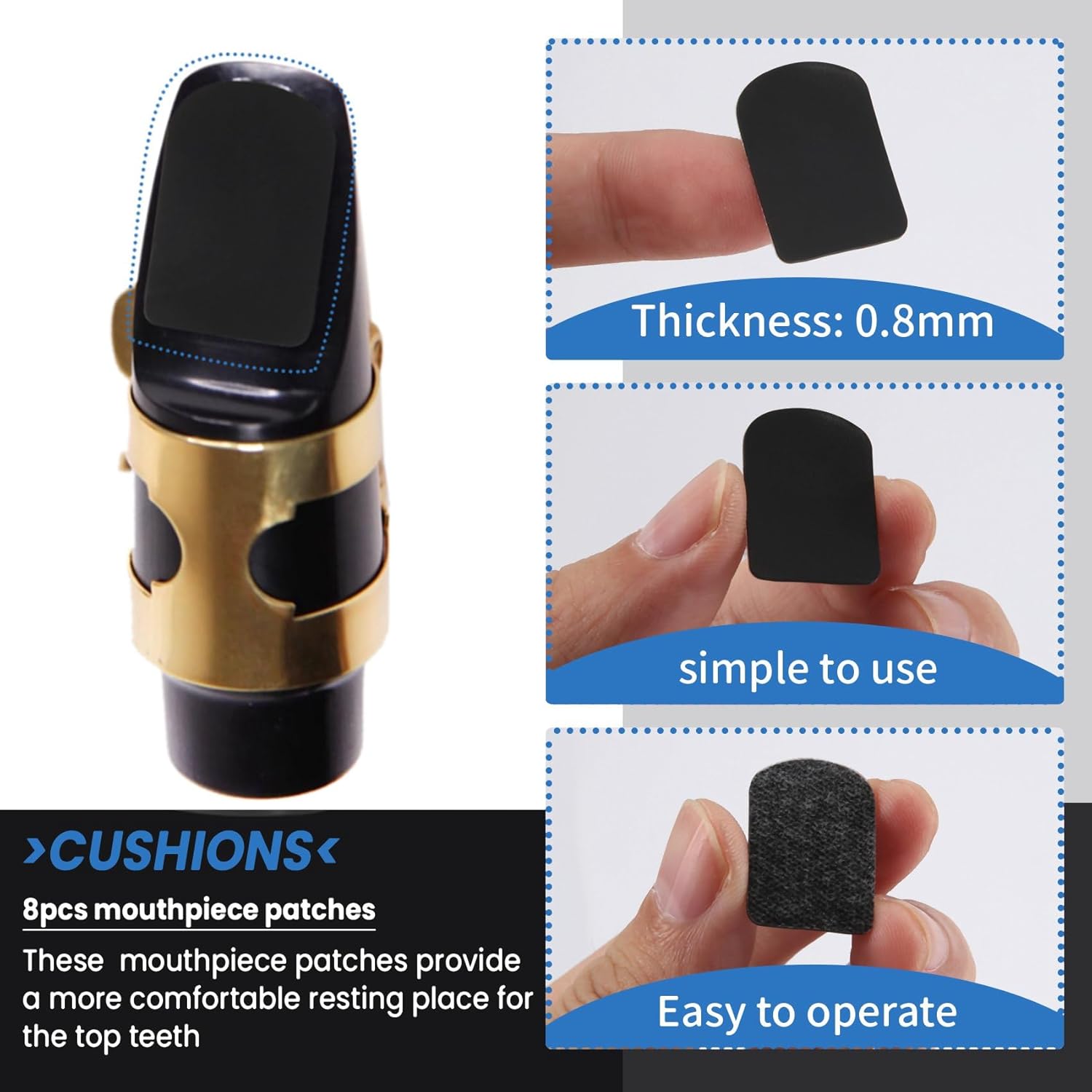 Spessore: 0,8 mm Queste toppe per boccaglio di alta qualità offrono un luogo di riposo più per i denti superiori ed eliminano le fastidiose vibrazioni. Montare il becco del sassofono soprano Il colore nero Materiale: silicone