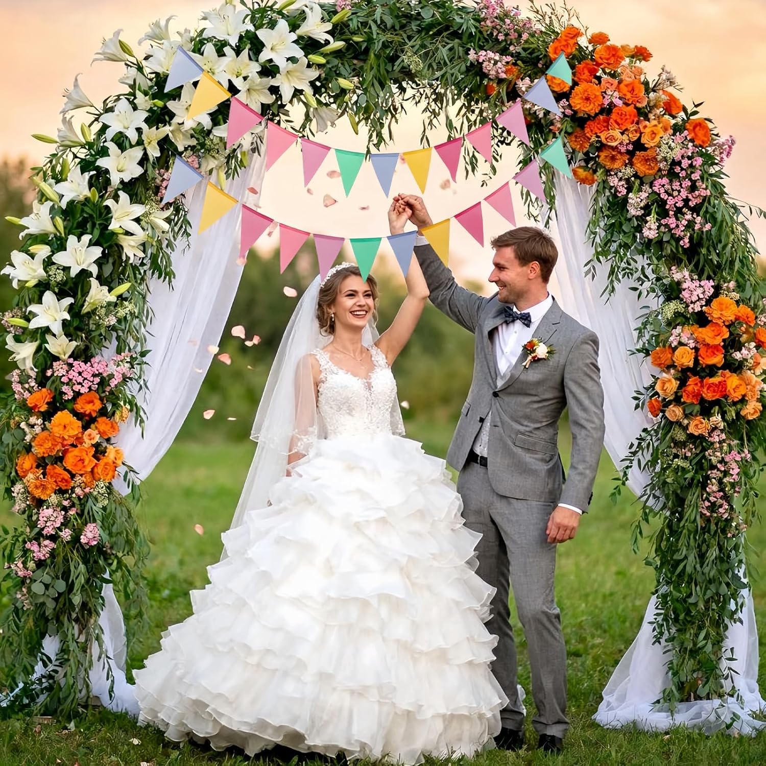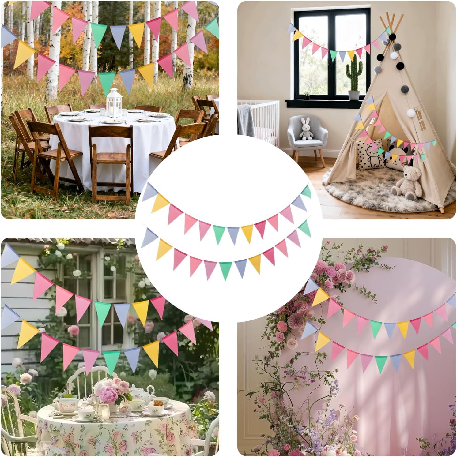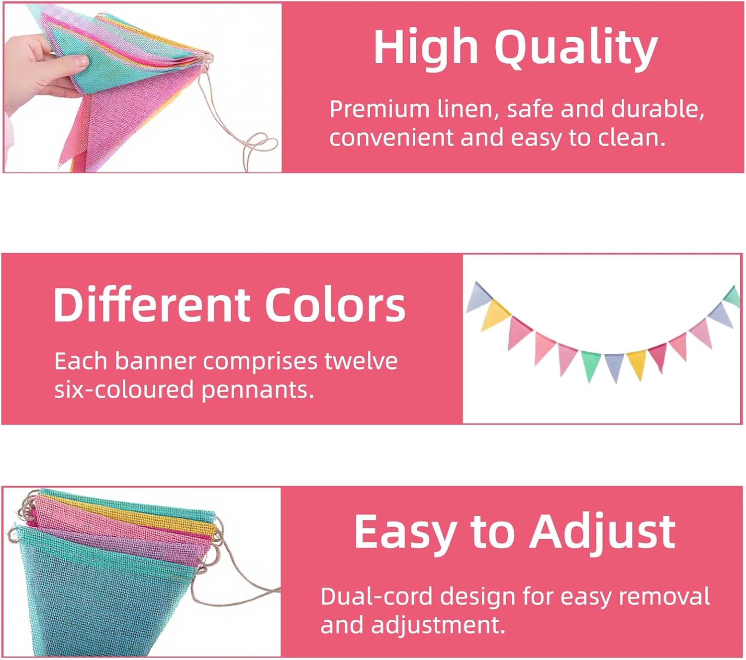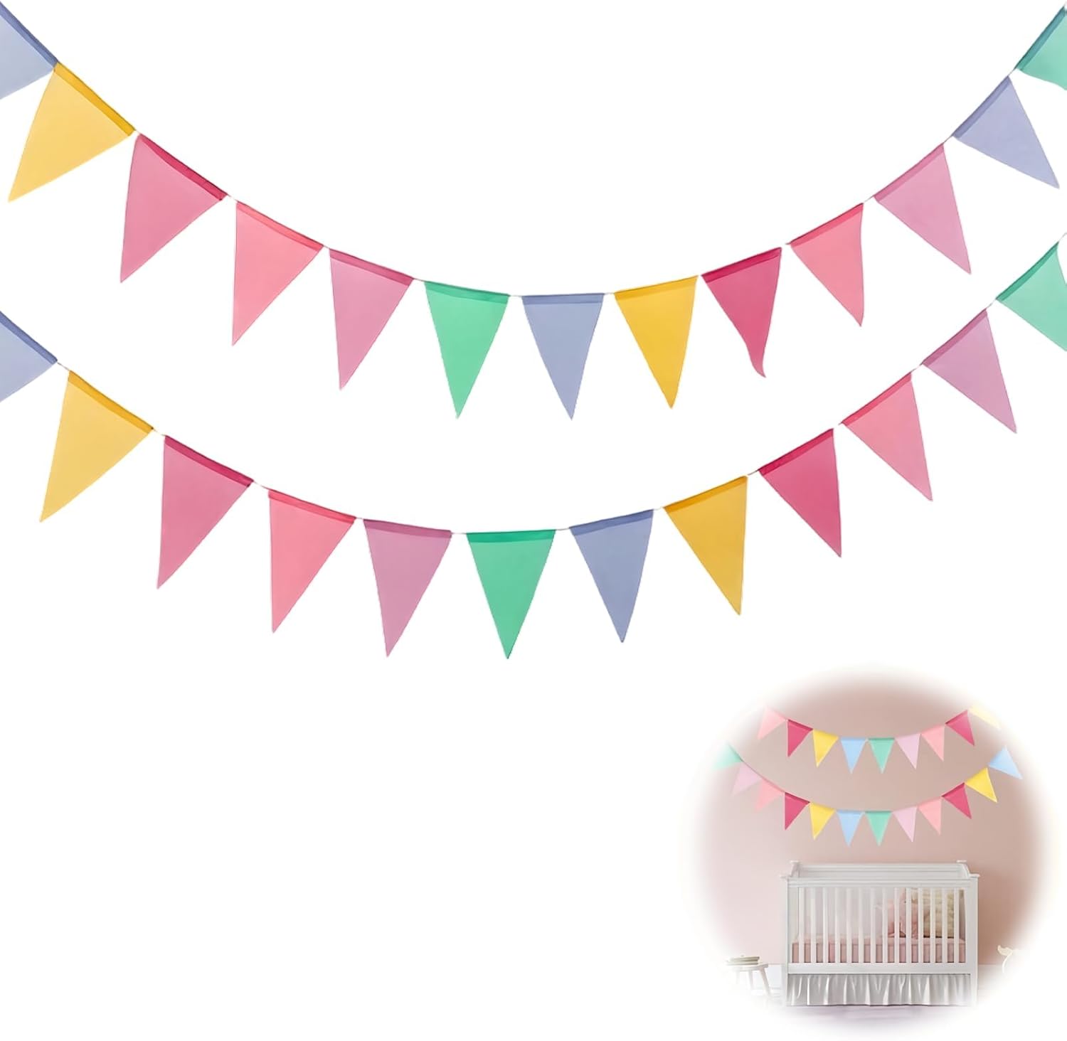 Materiali ecologici: questa ghirlanda di bandierine riutilizzabili è realizzata in tessuto di lino artificiale di alta qualità, ecologico. Facili da pulire, questi gagliardetti offrono una bella estetica con bordi nitidi, garantendo una piacevole esperienza visiva durante i tuoi eventi. 【Design colorato e festivo】: composta da sei colori vivaci - blu, giallo, rosa, arancione, viola e verde - questa ghirlanda di bandierine crea un'atmosfera accogliente. Ideale per interni ed esterni, galleggia con grazia nel vento, aggiungendo un tocco festivo alle tue decorazioni. 【Installazione facile】 Con corde aggiuntive su entrambi i lati, appendere questa ghirlanda facilmente in qualsiasi spazio. Che si tratti di un soffitto, di una classe o di un giardino, è perfetto per creare un'atmosfera allegra alle tue celebrazioni. 【Versatile per tutte le occasioni】 Questi gagliardetti colorati sono perfetti per celebrare vari eventi, come compleanni, matrimoni, feste di matricola o qualsiasi altro evento festivo. Dona un tocco di allegria a tutte le occasioni. Dettagli pratici: ogni set contiene 2 ghirlande da 4 metri, ciascuna composta da 12 bandierine che misurano 13 cm x 17 cm. La spaziatura dei gagliardetti è regolabile, consentendo di personalizzare la tua decorazione in base alle tue preferenze per ogni evento.