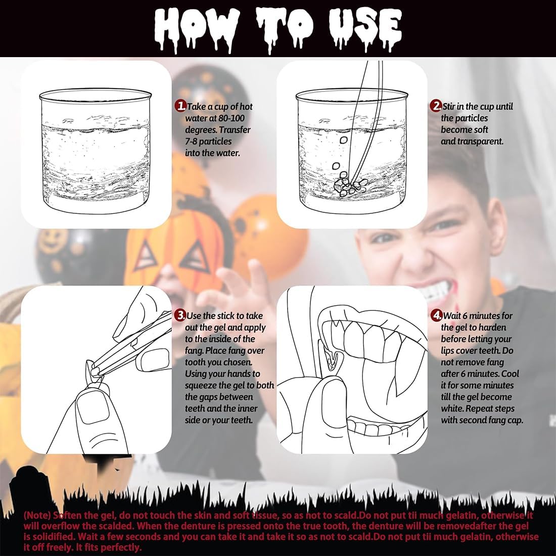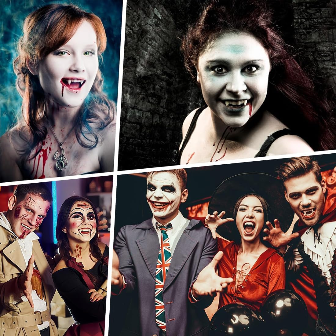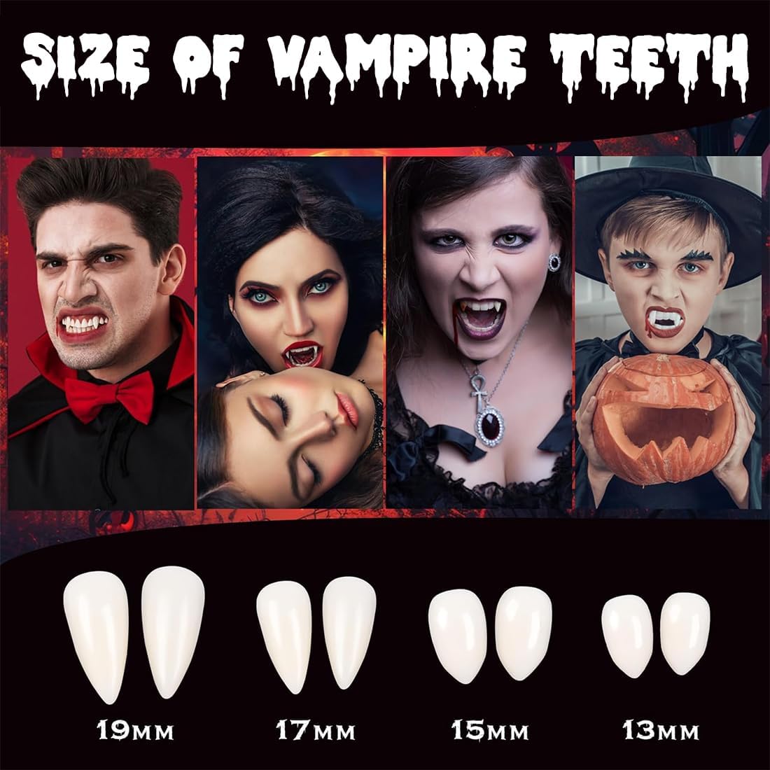 Diverse misure: disponibili nelle misure 13 mm, 15 mm, 17 mm e 19 mm, queste zanne da vampiro soddisfano le diverse preferenze. Che tu stia cercando un effetto visivo drammatico o una vestibilità più naturale e confortevole, troverai la misura perfetta per ottenere il look da vampiro che desideri. Adatte a tutti gli utenti. Applicazione semplice: sono incluse istruzioni dettagliate e facili da seguire. Basta ammorbidire il gel con acqua calda, mescolarlo, applicarlo sulla superficie interna delle zanne e modellarle sui denti. Non richiede competenze specifiche, questo processo rapido e semplice consente agli utenti di creare senza sforzo un look da vampiro realistico, risparmiando tempo e fatica. Effetto realistico: le zanne hanno un design realistico, che riproduce fedelmente il colore e la forma dei denti dei vampiri. Una volta indossate, aumentano immediatamente l'autenticità e l'atmosfera inquietante di qualsiasi costume. Che si tratti di feste di Halloween, eventi cosplay a tema o raduni a tema horror, ti assicurano di diventare il centro dell'attenzione, completando perfettamente qualsiasi scenario di costume a tema vampiro. Materiali sicuri: realizzate con materiali sicuri, queste zanne causano un'irritazione minima alla bocca e alle zone circostanti se indossate correttamente secondo le istruzioni. Ciò consente agli utenti di godersi il proprio costume senza preoccuparsi della sicurezza dei materiali, garantendo la massima tranquillità durante l'uso. Set di design: il kit include più set di zanne insieme ad accessori complementari come il gel, per un uso ripetuto o simultaneo da parte di più persone. Rispetto all'acquisto separato dei singoli componenti, questo offre un miglior rapporto qualità-prezzo, fornendo agli utenti una soluzione più economica per i loro costumi.