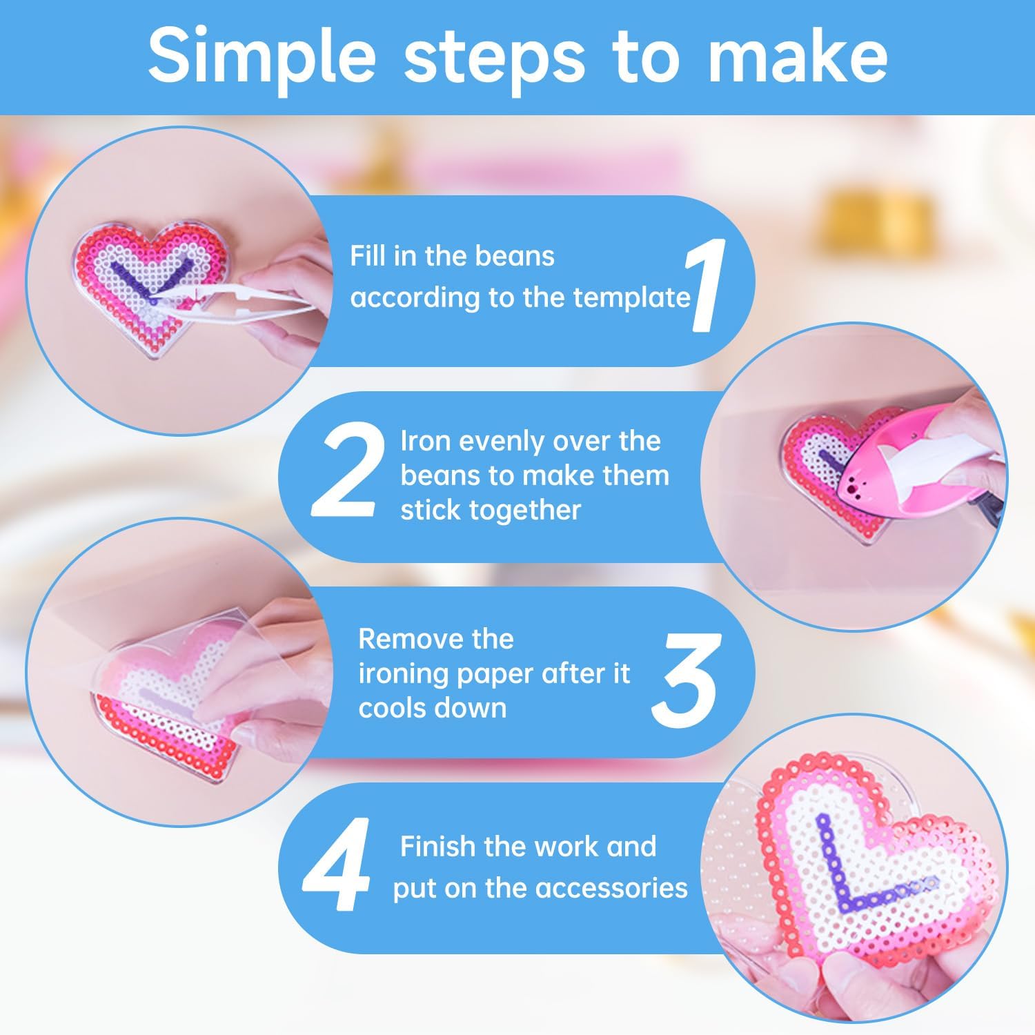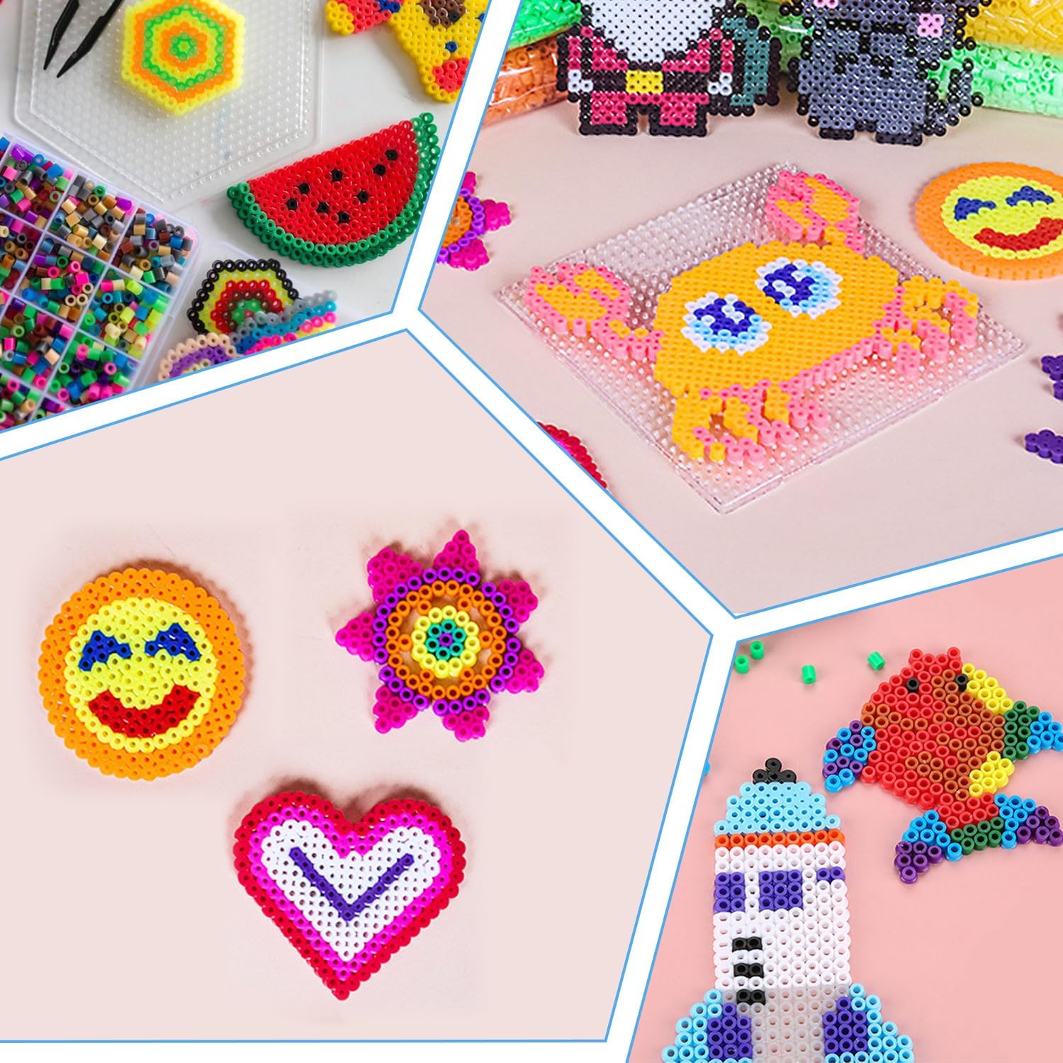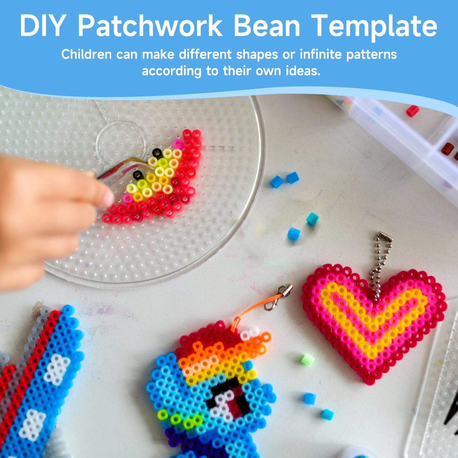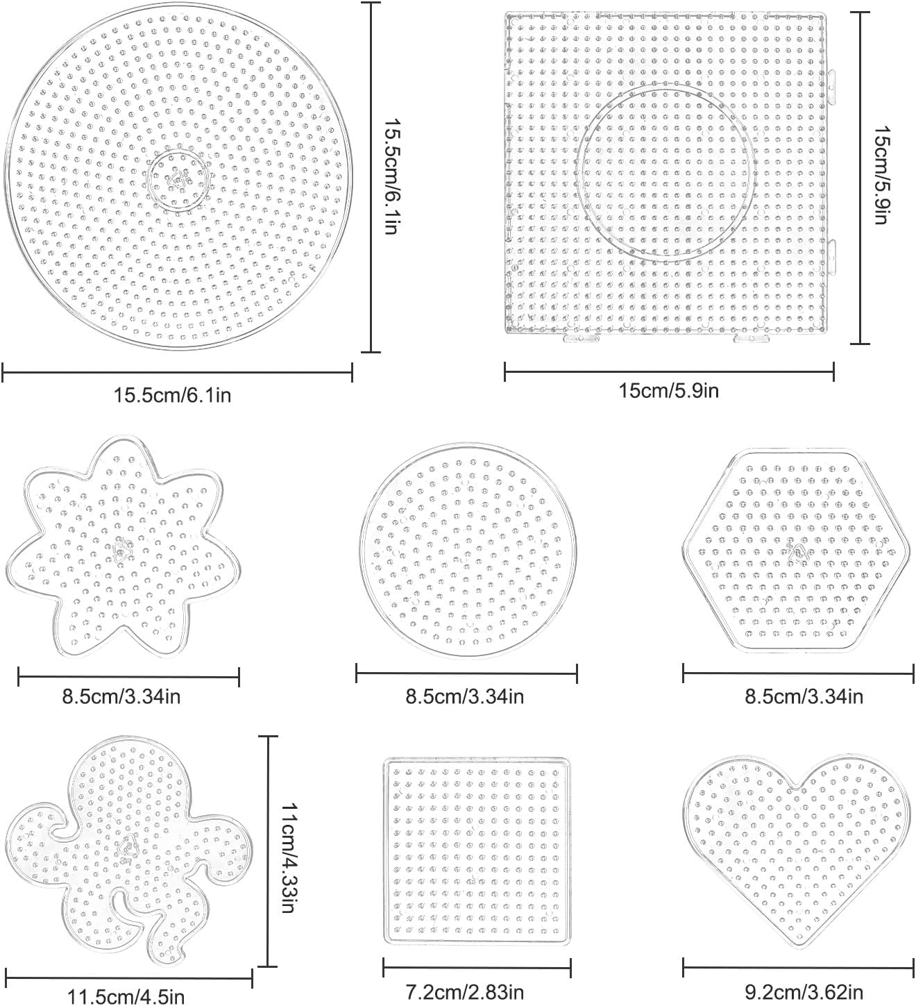 Set di piastre di perline da stirare: contiene 8 diverse forme e dimensioni di piastre di perline da stirare. come ad esempio quadrilatero, rotondo, esagono, fiore, stella, cuore. Le piastre in diverse forme consentono ai bambini di identificare una varietà di forme e nomi. Ampia gamma di applicazioni: le perline da stirare Fuse in diverse forme consentono ai bambini di identificare una varietà di forme e nomi. I bambini possono creare modelli illimitati secondo le proprie idee, migliorare il controllo, la coordinazione e la capacità di pensiero tridimensionale dei bambini e aumentare la creatività e l'immaginazione dei bambini. Regalo perfetto: il set di piastre con perline da stirare consente non solo agli appassionati di perline da stirare, ma anche a tutti di creare regali personalizzati per la famiglia, i bambini e gli amici. La piastra con perline da stirare è super adatta per bambini piccoli e grandi. Adatto per compleanni, Natale, feste, attività indoor/outdoor e tutte le festività. Facile da usare: basta posizionare le perline sulla lamina ungueale, coprire con carta da stiro e unire le perline con un ferro da stiro. Trascorri del tempo fai da te con la tua famiglia. Materiale premium: la piastra per perline da stirare trasparente è realizzata in plastica di alta qualità, molto sicura, i perni di plastica non si sciolgono e non si piegano durante la stiratura. I bambini possono creare forme diverse o modelli illimitati secondo le proprie idee.