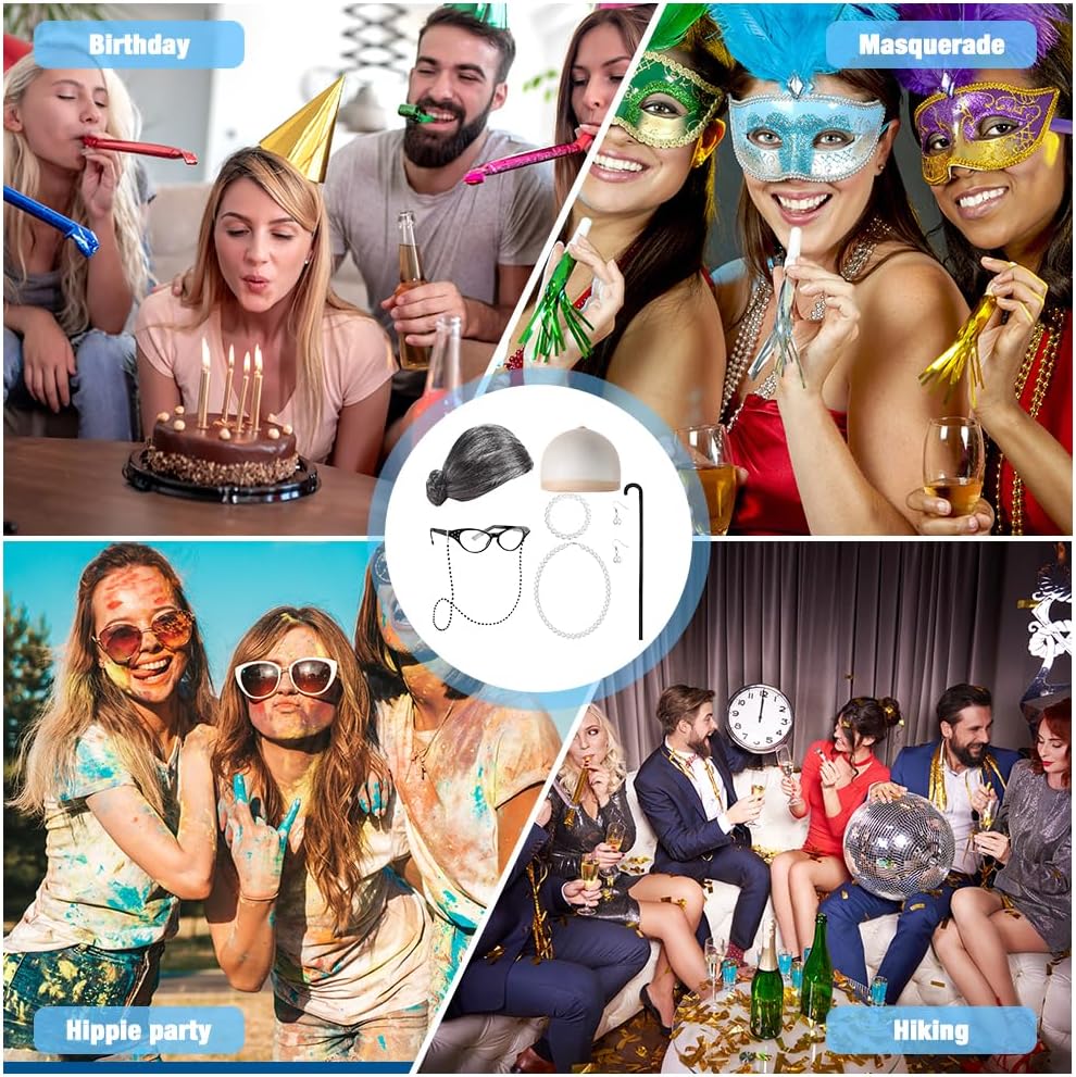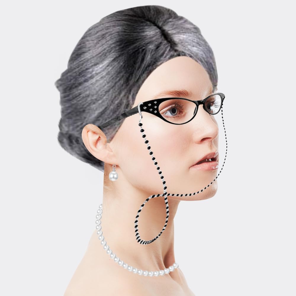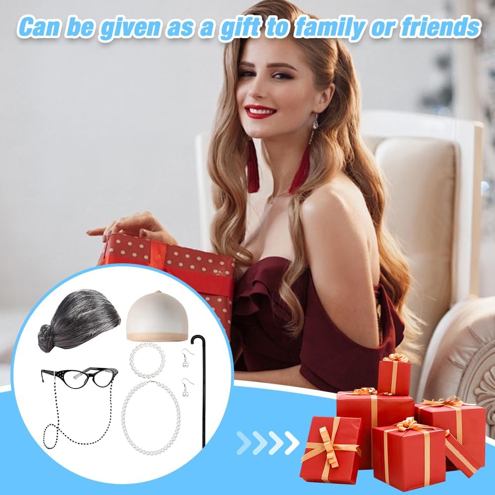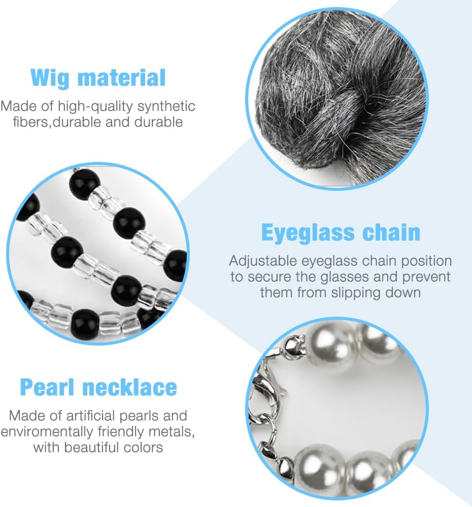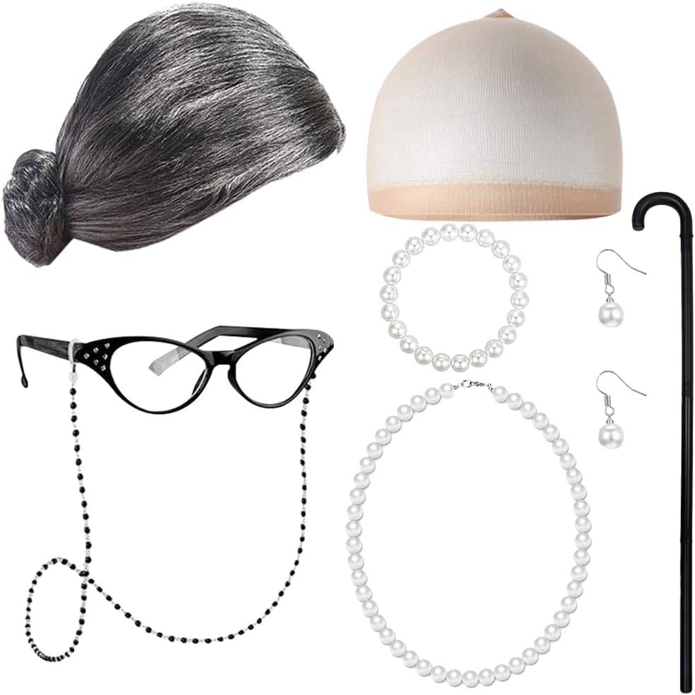 Costume da Vecchia Signora da 8 Pezzi: il set di accessori cosplay della nonna include parrucca della nonna, cappucci per parrucca, occhiali da nonna con catena, bastone della nonna, collane di perle artificiali, orecchini, set di braccialetti. Set costume parrucca da nonna Indossandolo, puoi cambiare il tuo look all'istante, ottimi accessori per la vecchia signora Materiali di Alta Qualità: la parrucca della nonna è realizzata con fibre sintetiche di alta qualità e una cuffia in nylon, comoda e morbida al tatto. Il costume da Vecchia Signora è durevole, non si danneggia facilmente e non perde l'intensità del colore. Accessorio cosplay per vecchia signora dal suo aspetto realistico, questa parrucca da nonna è perfetta per completare il tuo look da festa Design Elegante e Vintage: gli accessori per costumi da vecchia signora presentano un'elegante collana di perle e occhiali vintage perfetti per le feste. La collana di perle finte con chiusura in metallo è resistente e non sbiadisce facilmente. Set di accessori per cosplay della nonna Ideale per balli in maschera, feste a tema e giochi di ruolo Facile da Indossare: questo set di costumi per parrucca da nonna è facile da indossare, può essere indossato correttamente in meno di un minuto. Se hai i capelli lunghi, ti consigliamo di indossare il berretto della parrucca davanti alla parrucca grigia. Con un set di accessori cosplay della nonna, puoi imitare rapidamente una persona anziana, non importa quanti anni hai Varie Occasioni a Tema: questo set cosplay in costume da nonna è comodo e facile da indossare. Il costume da Vecchia Signora è perfetto per travestirsi per carnevale, feste in costume di Natale, feste a tema e tante altre occasioni. Che tu ti vesta da vecchia signora, dal personaggio di un libro, da Babbo Natale o da altri personaggi, questo costume garantisce un divertimento senza fine