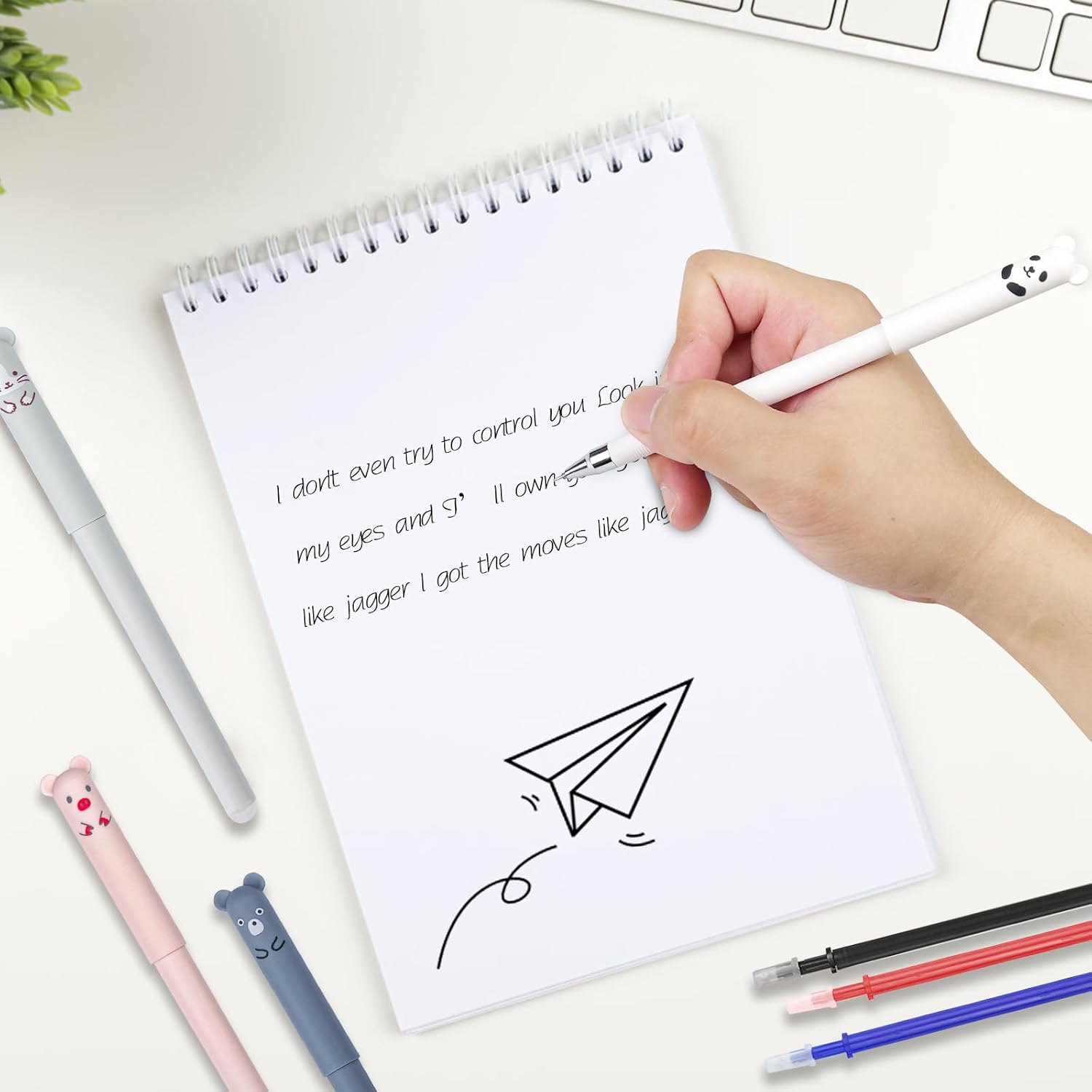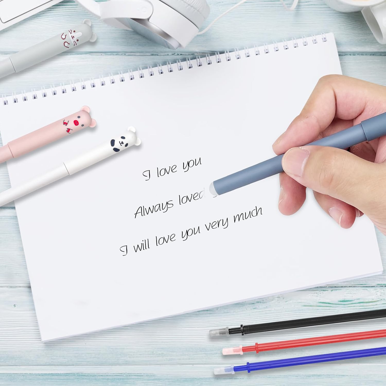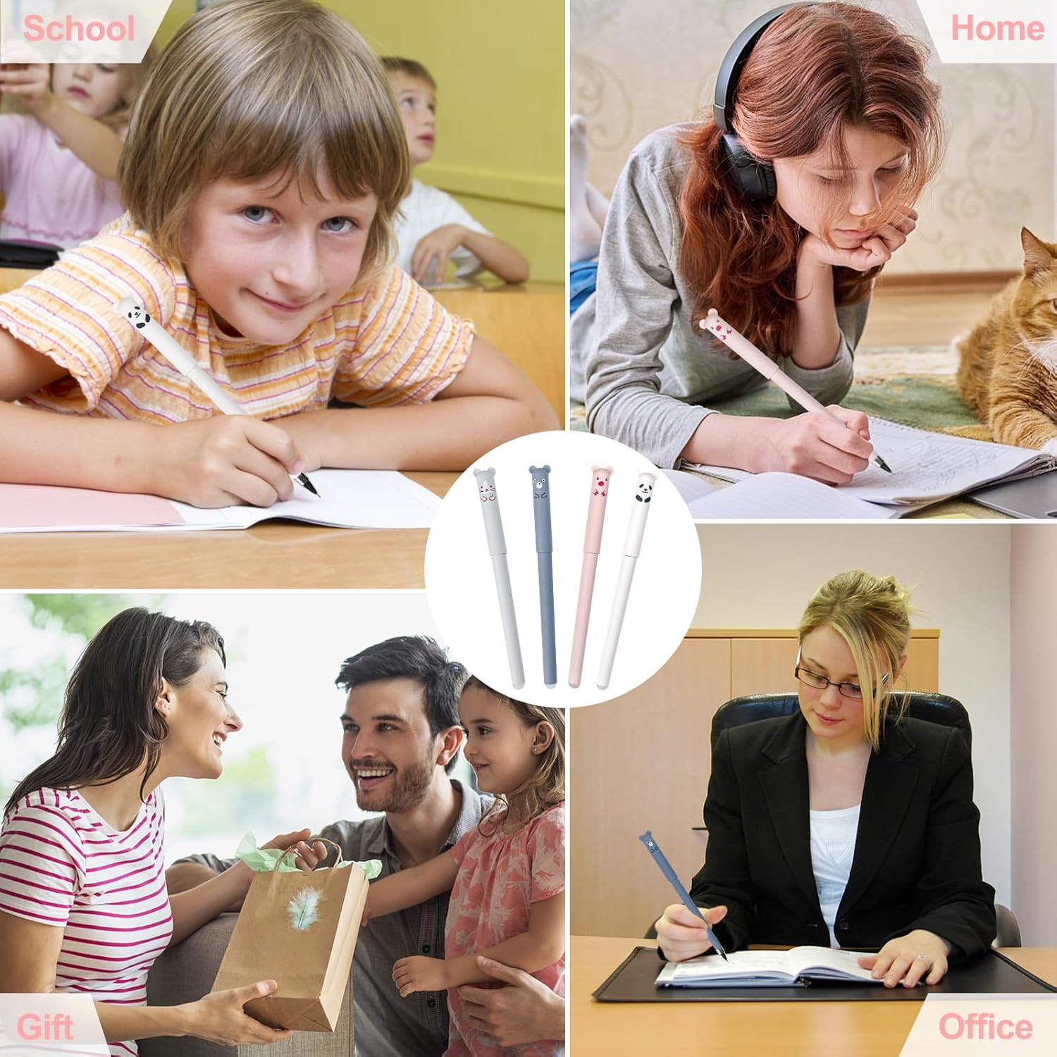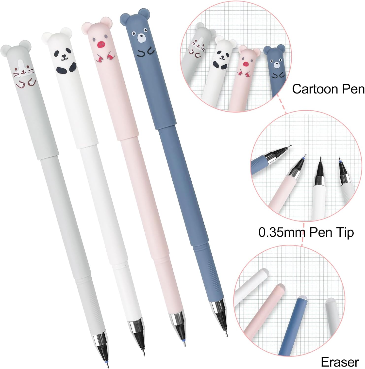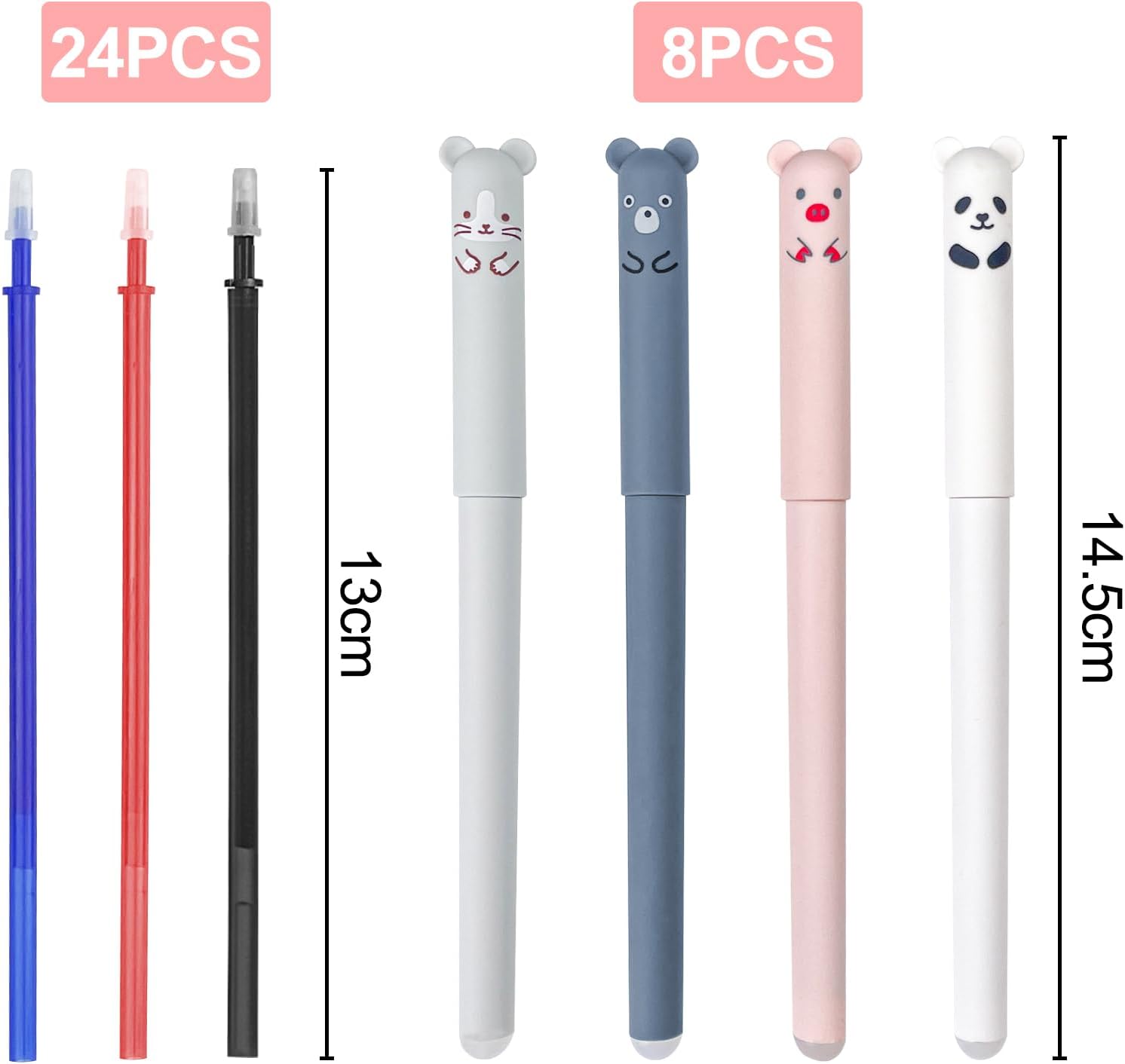 【Set di penne a sfera cancellabili】 Il set include 8 penne cancellabili e 24 ricariche in totale. Ci sono tre colori di ricariche nere, blu e rosse, la quantità è sufficiente e i colori sono diversi e il set di super capacità soddisfa le tue esigenze e sostituzioni quotidiane 【Facile da scrivere】 Penna cancellabile con punta fine da 0,35 mm, flusso di inchiostro stabile, scarico uniforme dell'inchiostro, scrittura fluida, la custodia della penna è in plastica, resistente e facile da tenere 【Design cancellabile】 La penna gel adotta inchiostro cancellabile e ha una gomma all'estremità, se commetti un errore durante la scrittura, puoi facilmente cancellare la calligrafia e non danneggerà la carta 【Cartoon Design】 Il cappuccio della penna cancellabile ha quattro simpatiche forme di animali dei cartoni animati di gatto, maiale, orso e panda, l'esclusivo design dei cartoni animati ti aiuta ad aggiungere più divertimento al processo di scrittura e disegno 【Multiuso】 Il set di penne cancellabili è adatto per scrivere appunti, compiti a casa, firmare, disegnare, ecc., può essere utilizzato a scuola, in ufficio e a casa ed è anche una scelta perfetta come regalo per i bambini