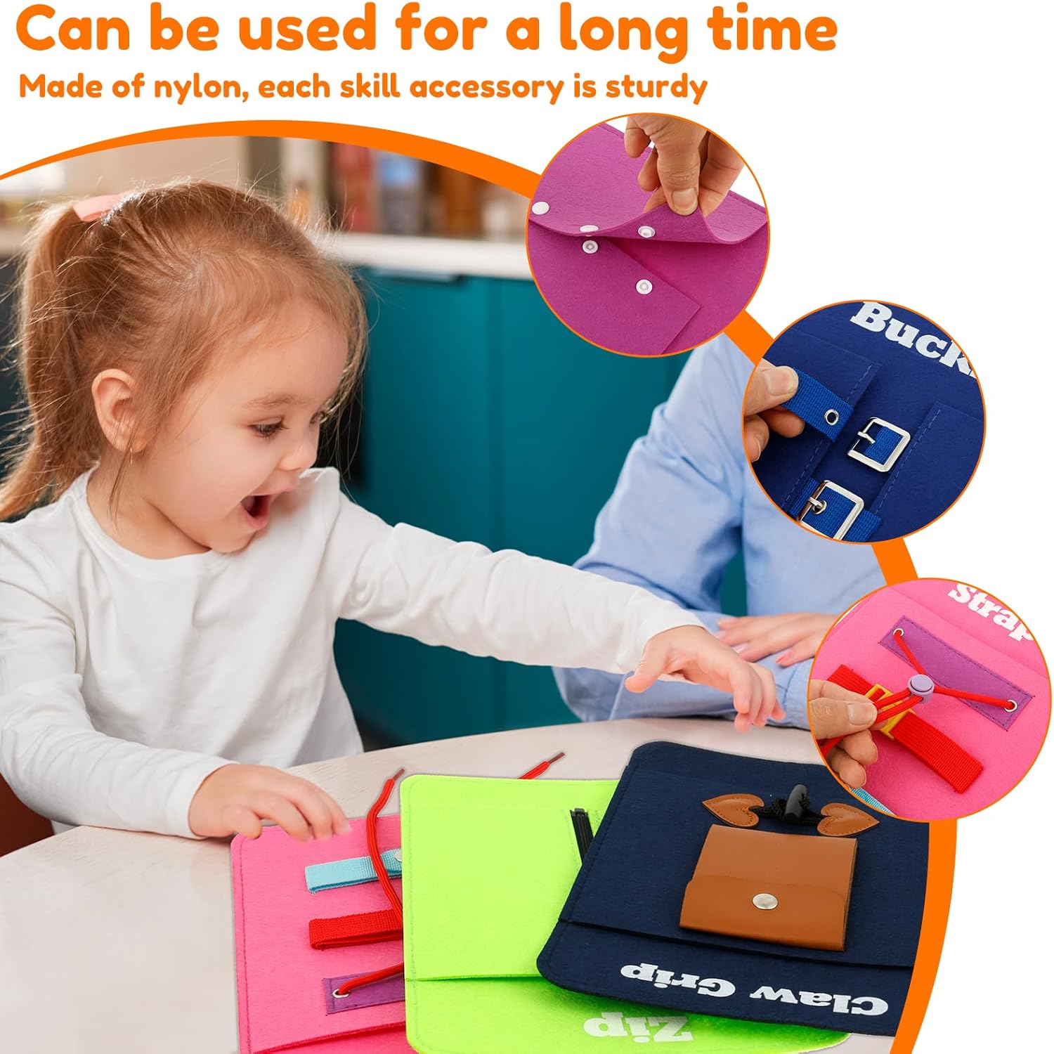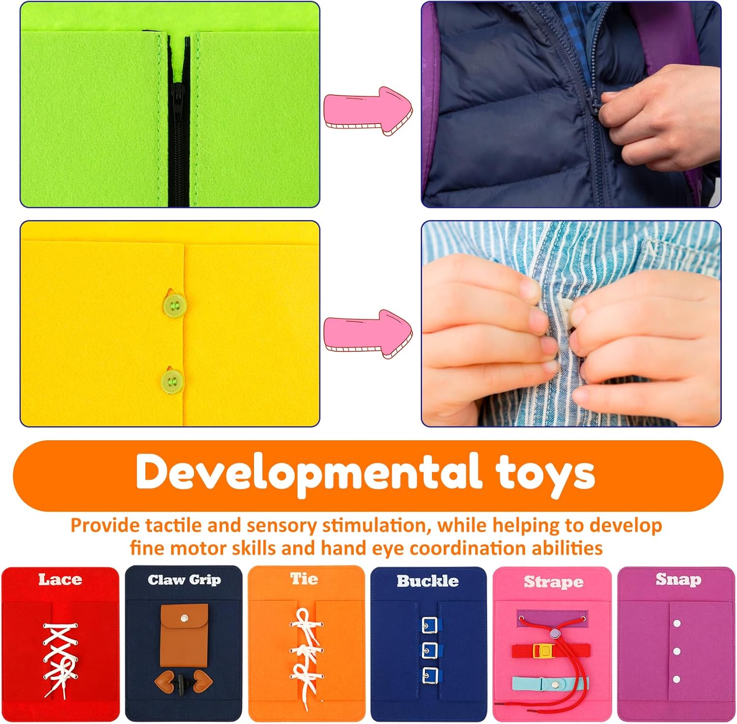 Tessuto in feltro di alta qualità: questa tavola Montessori per bambini è realizzata in tessuto di feltro di alta qualità, resistente all'uso quotidiano, affidabile e durevole. Regalo creativo: questo giocattolo per abilità motorie è adatto a bambini dai 3 anni in su, adatto come regalo creativo per ragazzi e ragazze per compleanni, vacanze e occasioni speciali. Contenuto del set: questo set contiene 8 diversi colori di lastre di feltro a cui i bambini possono partecipare per promuovere l'indipendenza dei bambini e consentire ai bambini di apprendere le abilità di vita attraverso esercizi divertenti. Design portatile: questa tavola da allenamento per legare le scarpe è leggera, portatile e adatta per le mani piccole per tenere e trasportare. Può essere portato ovunque, sia a casa, in auto o in aereo. Giocattolo di sviluppo: questo giocattolo educativo da indossare fornisce una stimolazione tattile e sensoriale, mentre il bambino lega fibbie, cerniere e scarpe, aiutando a sviluppare abilità motorie fini e coordinazione occhio-mano.