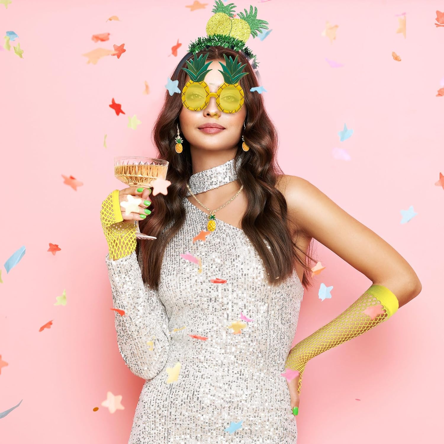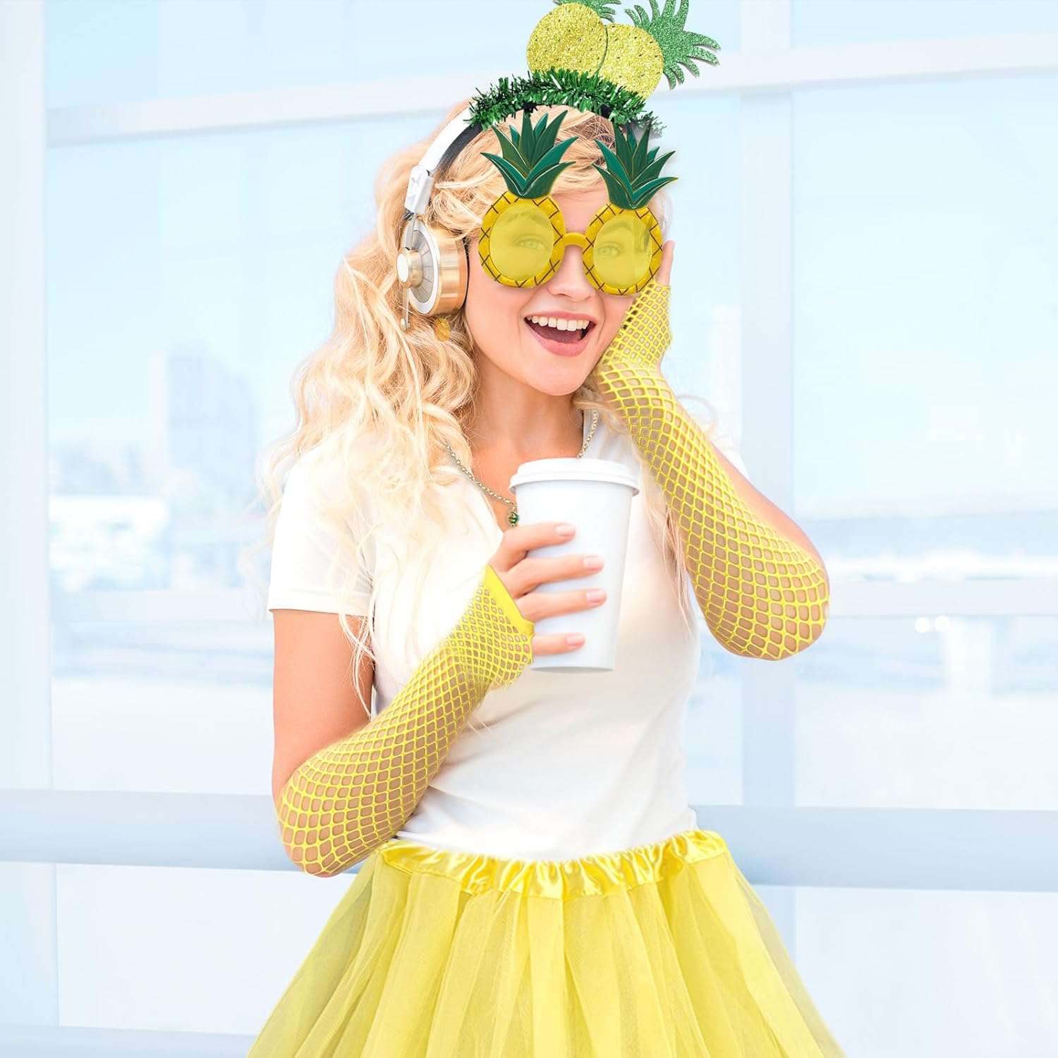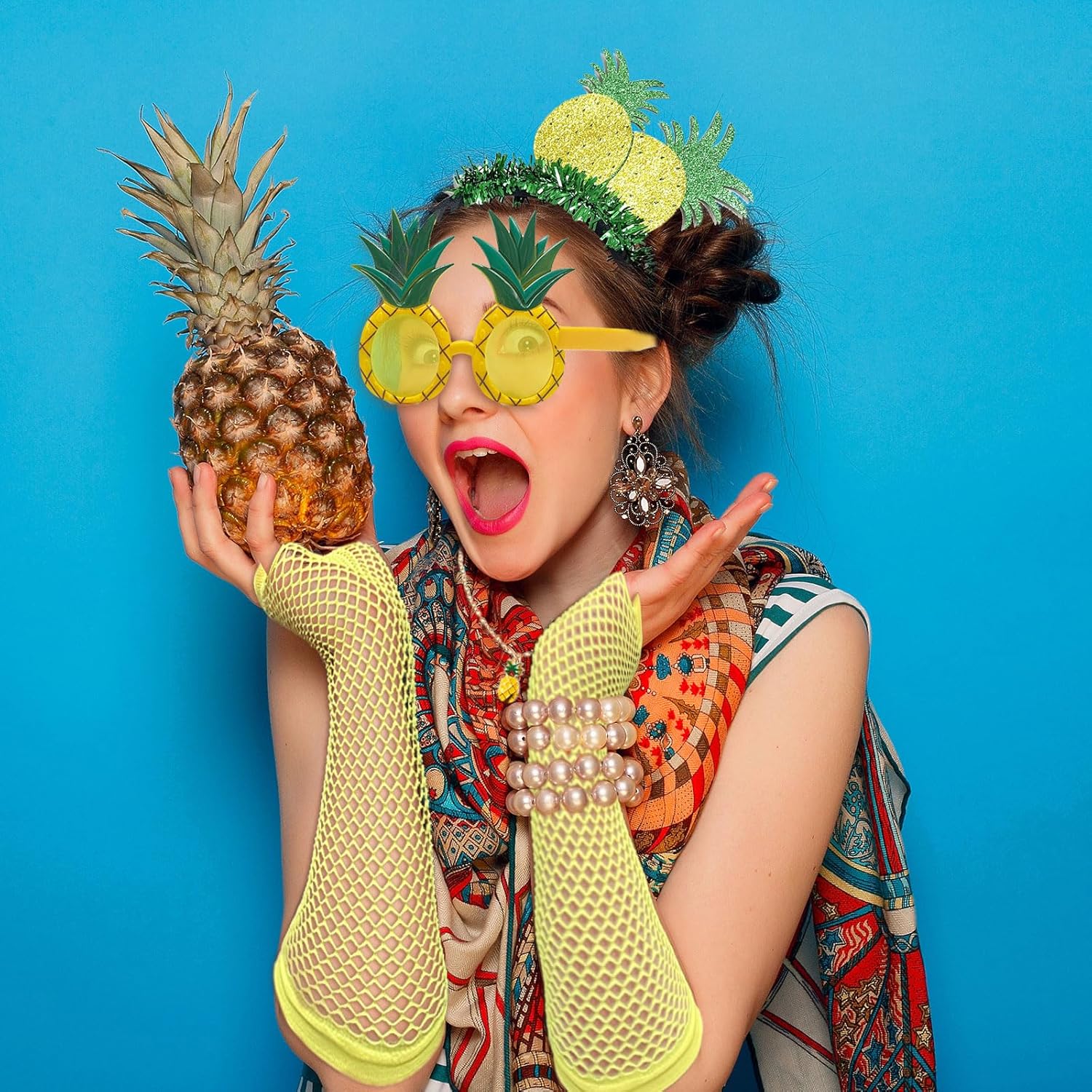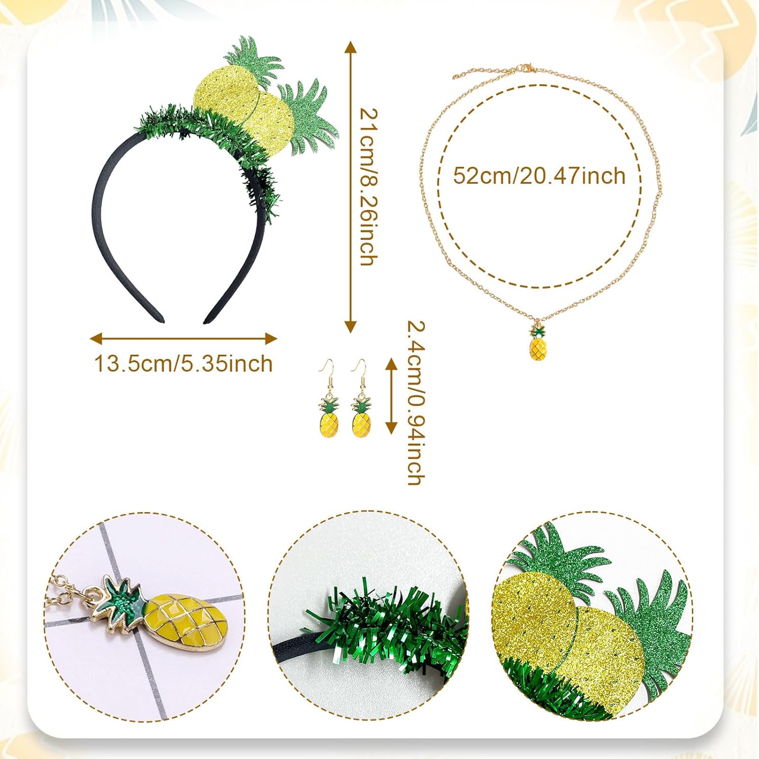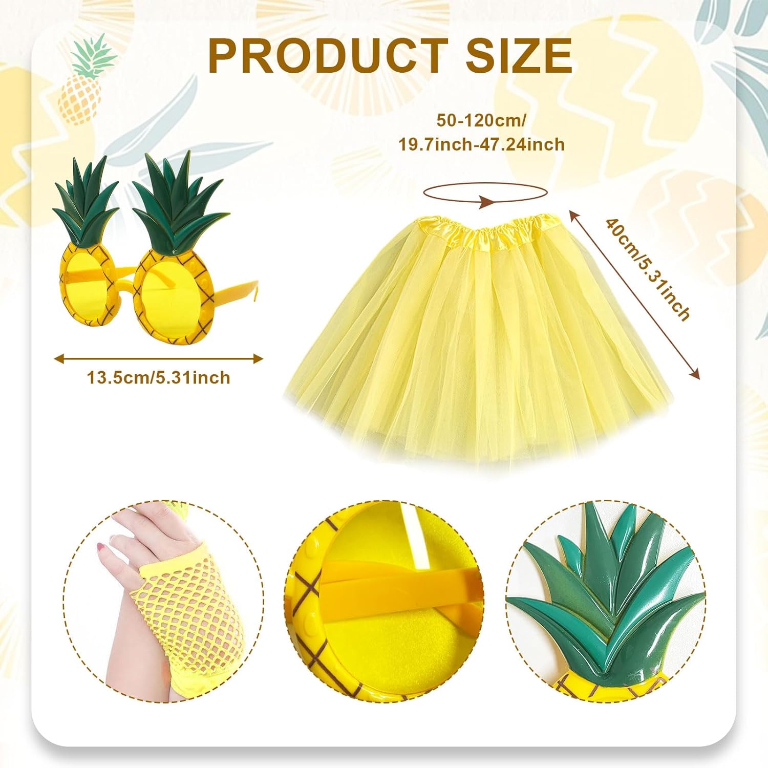 Descrizione prodotto Pacchetto: 1 Diadema di ananas 1 Occhiali da Sole Ananas1 paio di guanti corti gialli 1 collana di ananas 1 paio di orecchini con ananas 1 gonna tutù Dimensioni: fascia ananas 20*14 cm/7,87*5,51 pollici, guanti a rete 12*4,72 pollici, collana 51,5 cm/20,2 pollici, orecchini 2,4 cm/0,94 pollici, occhiali 14*13 cm/5,51*5,11 pollici, lunghezza gonna 40 cm/15,75 pollici Materiale: poliestere Colore: giallo Il nostro set completo di costumi da ananas presenta una collezione di accessori indispensabili per l'ananas per farti entrare nella vita della festa. Che tu stia partecipando a un carnevale, festeggiando il Natale o partecipando a un evento a tema hawaiano, questo set di ananas ha tutto ciò di cui hai bisogno per esprimere la tua personalità. Avviso di sicurezza no
