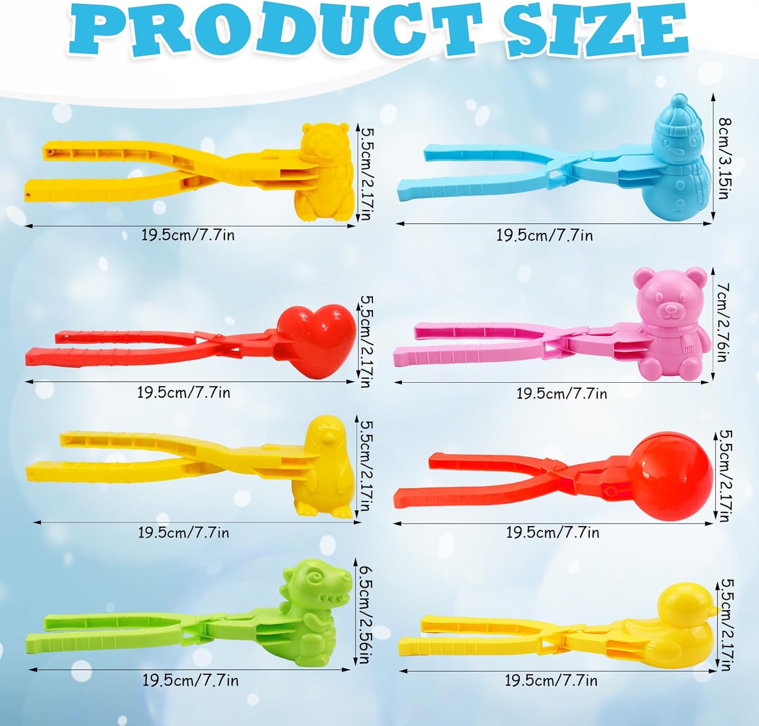 Contenuto e stile del set: il set include 8 clip a forma di palla di neve in diversi colori e stili. Gli stili includono orso polare, pinguino, dinosauro, orso, pupazzo di neve, palla, cuore d'amore, anatra. I colori sono blu, giallo, rosso. sono ideali per i bambini per creare molte forme carine sulla neve/spiaggia. Materiale di alta qualità: la clip per palla di neve è realizzata in materiale PVC di alta qualità, ecologico e durevole, con bordi lisci, non danneggia le mani, nessun odore particolare, è un ottimo giocattolo all'aperto. Facile da usare: utilizzare questa clip per palle di neve per evitare che le mani si sporchino o si bruciino il gelo. Quando crei stampi, taglia un po 'più di neve e poi apri le clip in modo che le forme tagliate sembrino piene e belle e non vuote. Dimensioni del prodotto: ogni clip a forma di palla di neve ha una dimensione di circa 19,5 x 6 cm. Le clip sono compatte ma accattivanti, perfette per piccoli e grandi progetti di decorazione. Forma carina, manico flessibile, basta un clic per ottenere una forma perfetta. Uso versatile: queste clip a sfera di neve sono ideali per decorazioni per albero di Natale, matrimoni invernali, decorazioni per feste, vetrine e molto altro ancora. Scatena la tua creatività e usa le clip per creare un'atmosfera calda e accogliente.