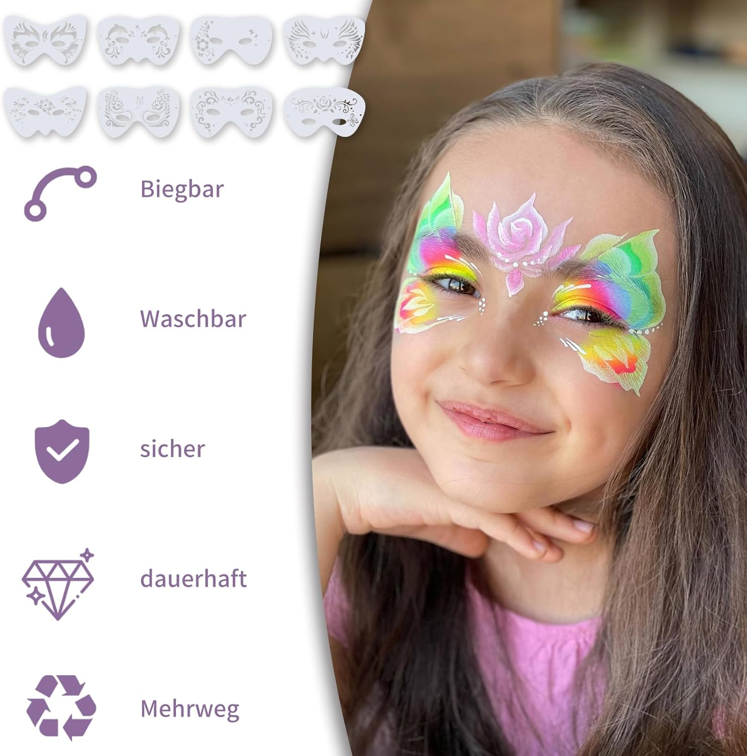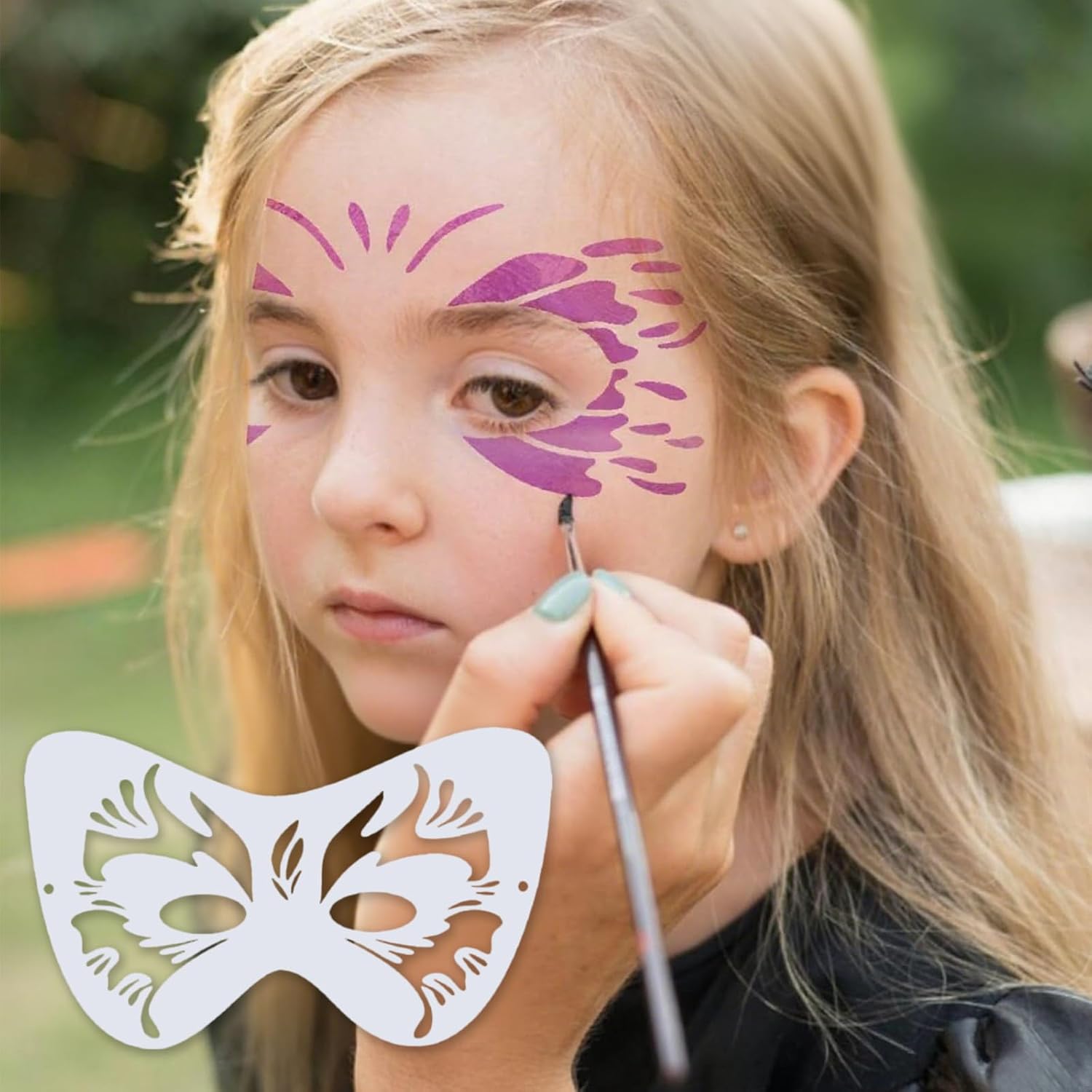 Contenuto della confezione: questo set di stencil per il trucco per bambini contiene 8 modelli di pittura del viso riutilizzabili con una varietà di disegni popolari come fiori, farfalle, delfini, stelle, fiori, cuori, questi modelli possono facilmente creare belle arti del viso e design del corpo per aiutarti a distinguerti a una festa o un evento, con una varietà di motivi, c'è uno stile per tutti Come si usa: posizionare il set di trucco riutilizzabile per bambini sulla pelle e mantenerlo stabile. Tamponare il colore desiderato sull'apertura con una spugna o un pennello e tirare delicatamente indietro lo stencil per ottenere un design vivace e complicato Riutilizzabili: realizzati in plastica PET flessibile e resistente, questi tappetini per bambini sono durevoli e possono essere facilmente puliti con acqua calda e sapone e asciugati dopo l'uso. Hanno bordi lisci e arrotondati che li rendono sicuri e comodi da usare Adatto per le occasioni: questo set di stencil per bambini è perfetto per scuola, chiesa, festival, carnevale, feste di compleanno, cosplay, trucco di Halloween, spettacoli e innumerevoli altri eventi Adatto per: questo set di stencil per bambini è molto facile da usare ed è perfetto per artisti, dilettanti, studenti, giovani, bambini e pittori, ecc. Goditi ore di divertimento creativo e dona ai tuoi look un tocco vivace e artistico