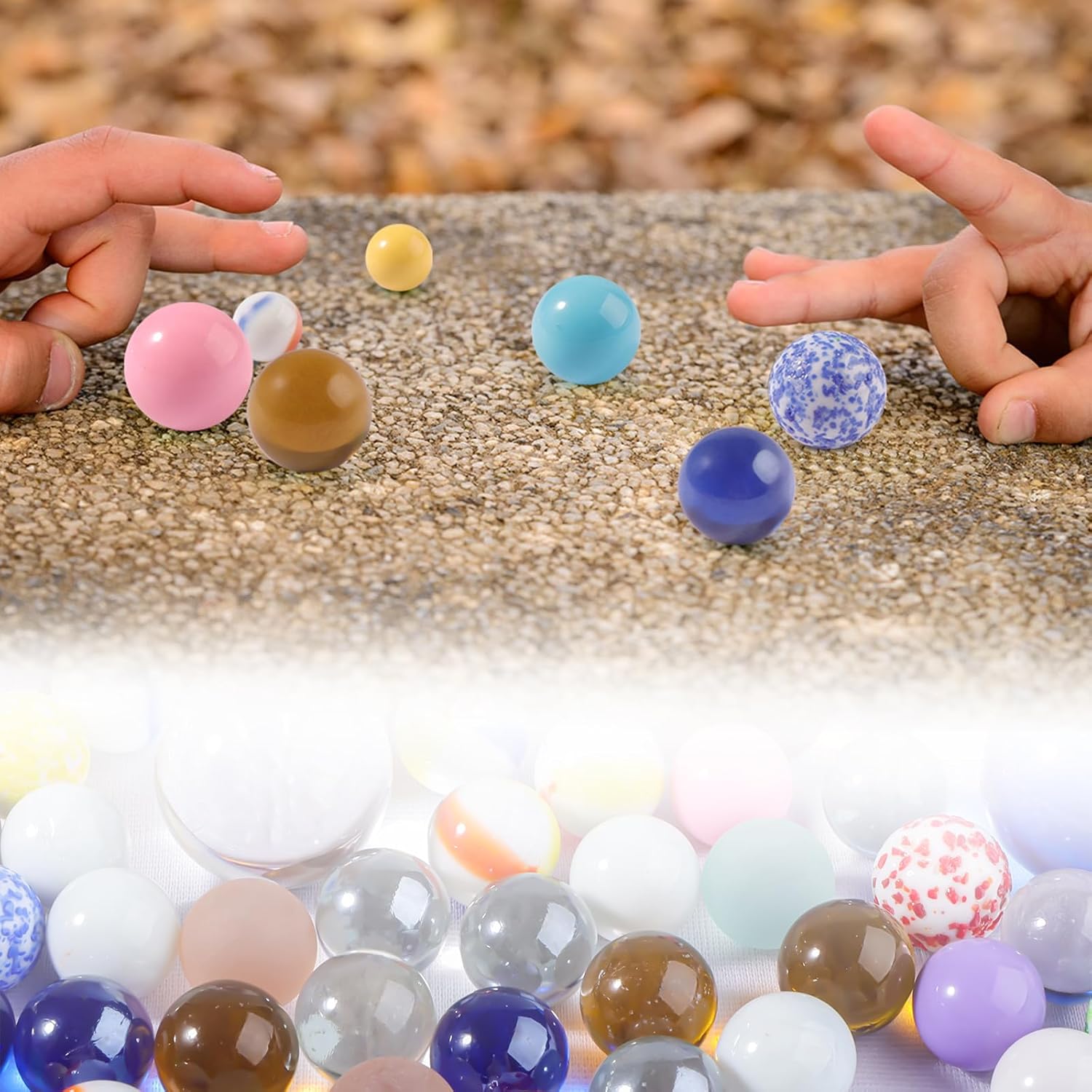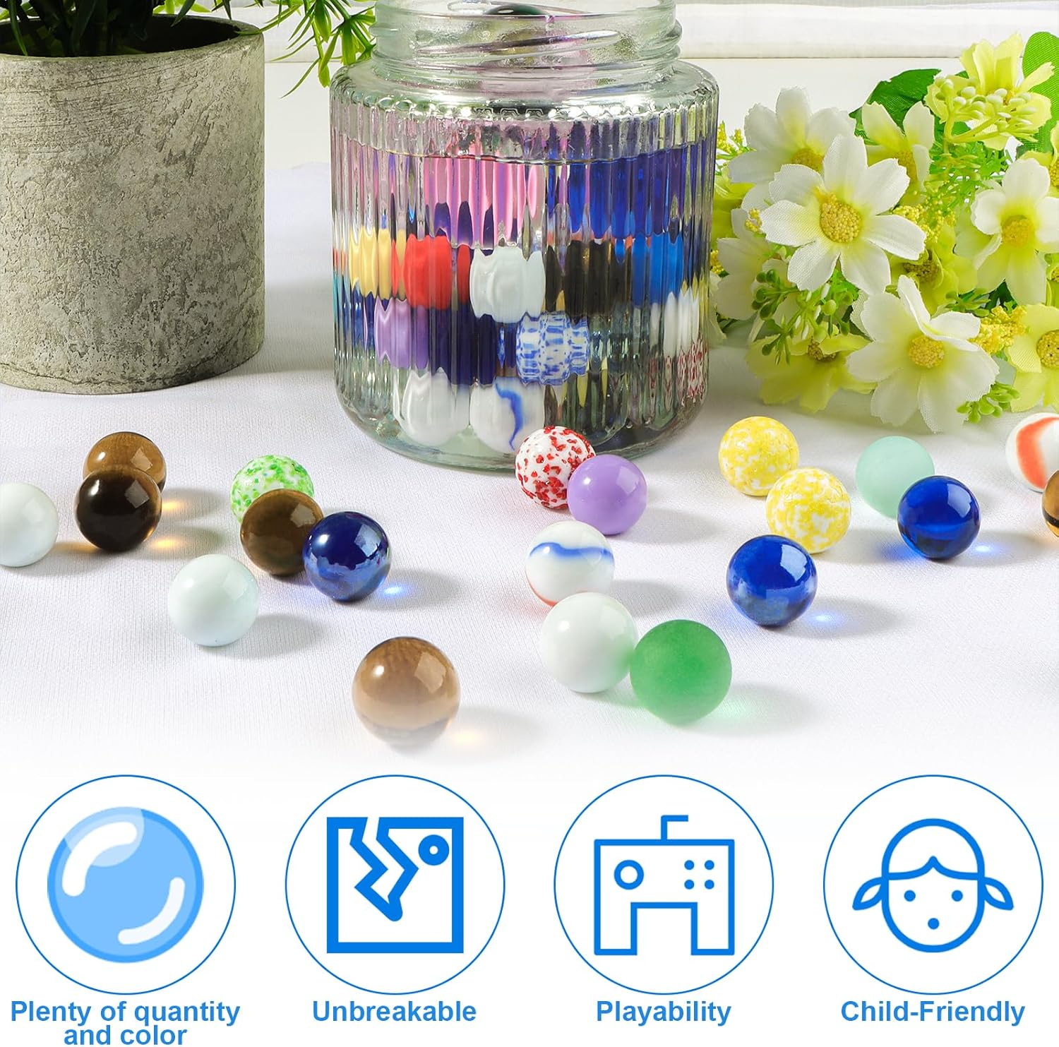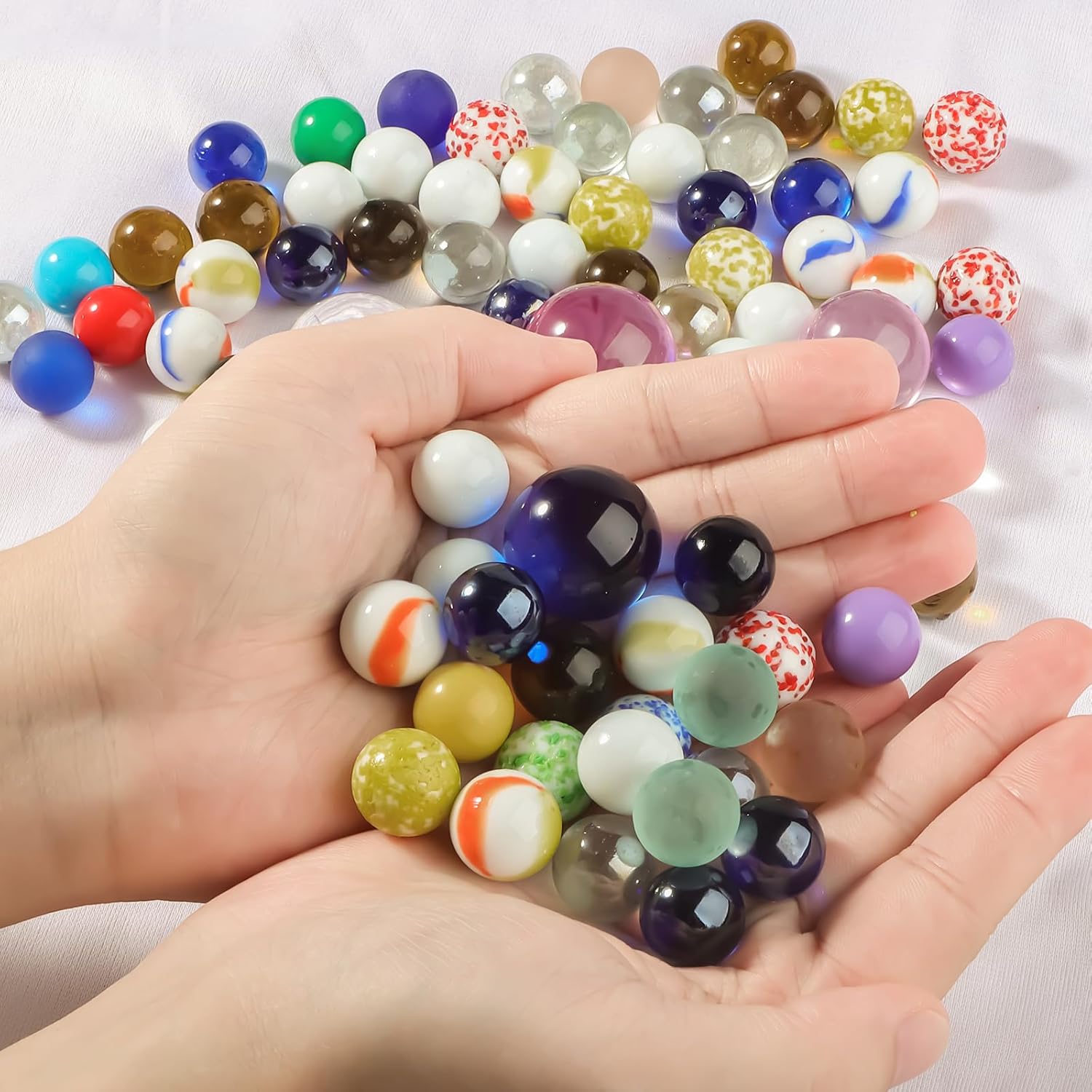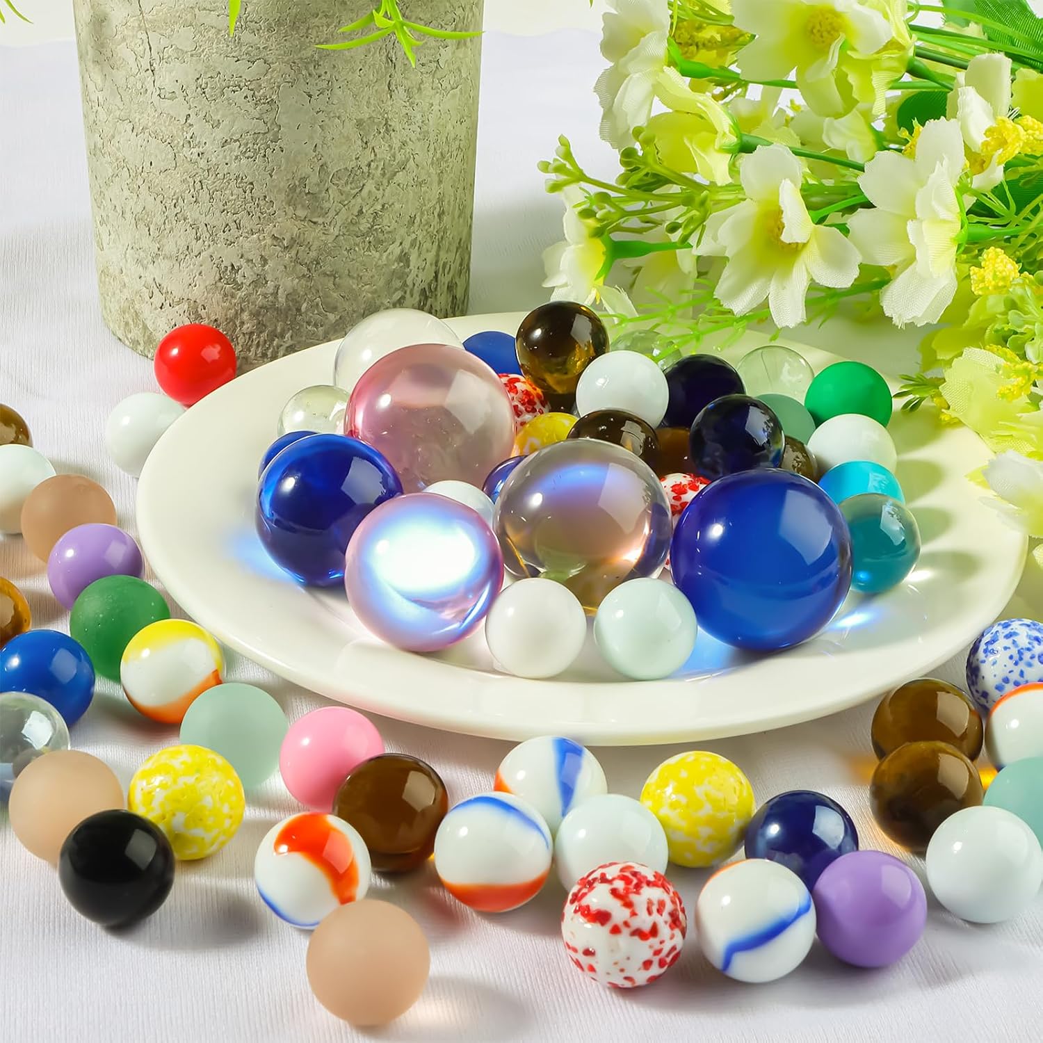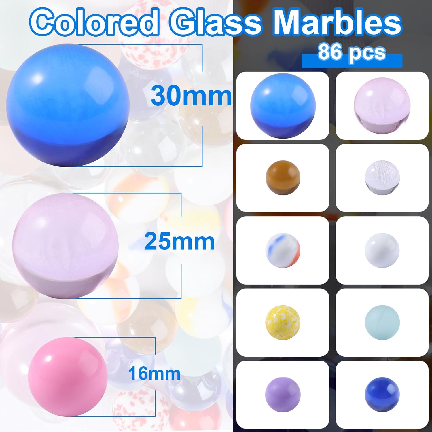 La Confezione Include - Un totale di 86 biglie di vetro colorate. Le biglie di vetro sono disponibili in tre diverse dimensioni: 3 biglie grandi da 30 mm e 3 da 25 mm, e 80 biglie piccole da 16 mm oltre a biglie fantasia, biglie di sesamo, biglie smerigliate e biglie acriliche Tranne il fatto che il colore non è fisso; , il resto delle biglie di vetro hanno colori fissi Materiale - Le biglie colorate sono in vetro, con una superficie liscia e rotonda senza crepe, possono rotolare bene su una superficie piana e sono molto adatte alle piccole mani dei bambini. Le biglie di vetro sono resistenti, brillano al sole e sono disponibili in colori vivaci. Non adatto all'uso da parte di bambini di età inferiore a 3 anni. I bambini devono giocare insieme sotto la supervisione di un adulto Gioco di Biglie - Questa biglia di vetro colorato è un classico gioco nostalgico dell'infanzia. Gioca a divertenti giochi di biglie con gli amici all'aperto o al chiuso, come i tradizionali giochi di biglie e la corsa di biglie, per esercitare la coordinazione occhio-mano dei bambini e la capacità di movimento fine, promuovere la crescita del pensiero cerebrale dei bambini. e ottieni la felicità Ampia Gamma di Usi - Oltre ad essere utilizzate come giochi con biglie, le biglie di vetro sono anche un valido aiuto per la decorazione della casa. Puoi usare queste biglie di vetro colorato per decorare vasi, acquari, acquari, ecc. Possono anche essere usate come giochi da tavolo e insegnare ai bambini a classificare, contare, imparare i colori e avere una varietà di modi di giocare Regalo Pratico - Queste biglie di vetro colorato sono disponibili in varie dimensioni, colori e quantità, rendendole un fantastico regalo di festa per i bambini. Se hai amici che amano il giardinaggio, la decorazione e l'artigianato, saranno felici di ricevere un regalo del genere