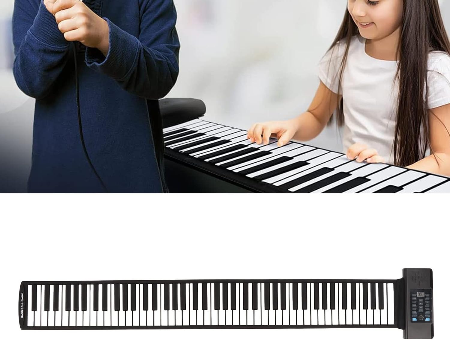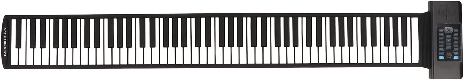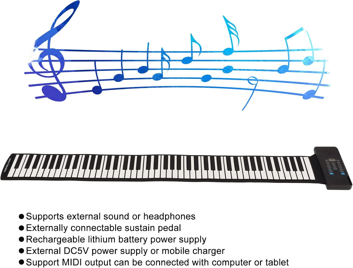 Universale da usare: pianoforte roll up portatile per tutte le età; con pianoforte standard a 88 tasti (LA1‑C9); con funzione Bluetooth MIDI per connessione APP. Impostazioni multiple: pianoforte digitale roll up con 128 toni, 128 ritmi, 14 brani dimostrativi con connessione Bluetooth. Multifunzione: pianoforte elettrico portatile con registrazione, editing, riproduzione, sustain, vibrato, insegnamento, accordi, ecc. Facile da usare: pianoforte portatile con display a tubo digitale a LED; suonare in modo con il proprio altoparlante; supporto audio esterno o cuffie; è disponibile un pedale sustain esterno. Alimentazione: il pianoforte digitale può essere alimentato da una batteria al litio ricaricabile, da un alimentatore esterno DC 5V o da un alimentatore di ricarica mobile; supporto L'uscita MIDI può essere utilizzata con la connessione a computer o tablet.