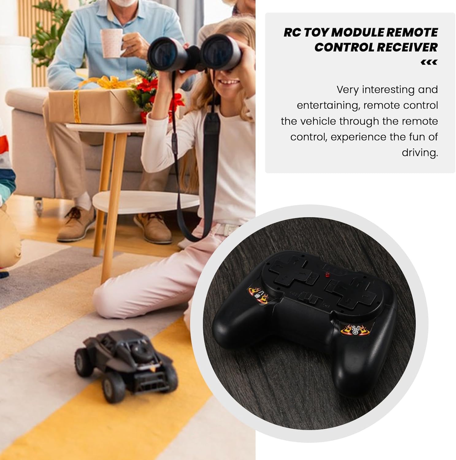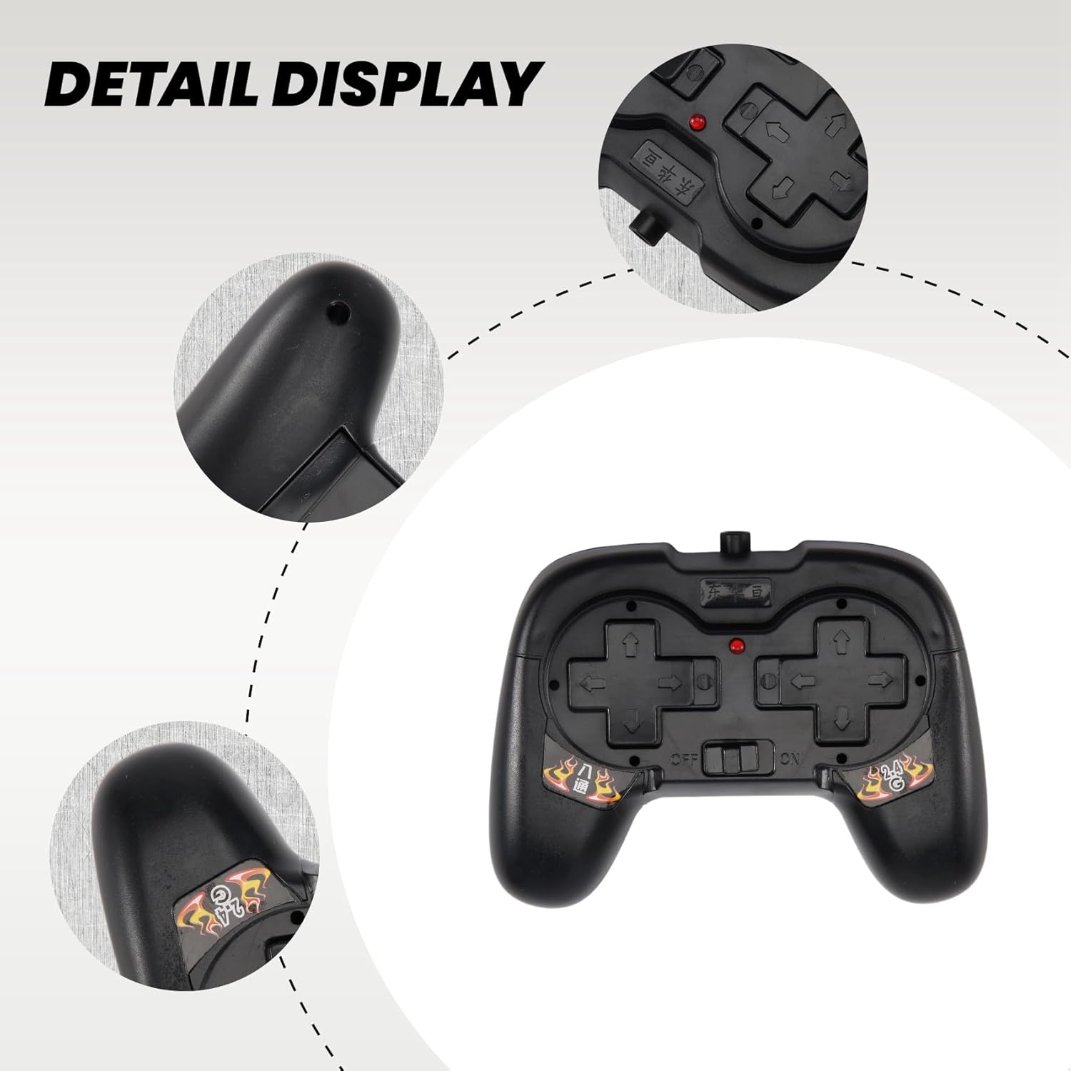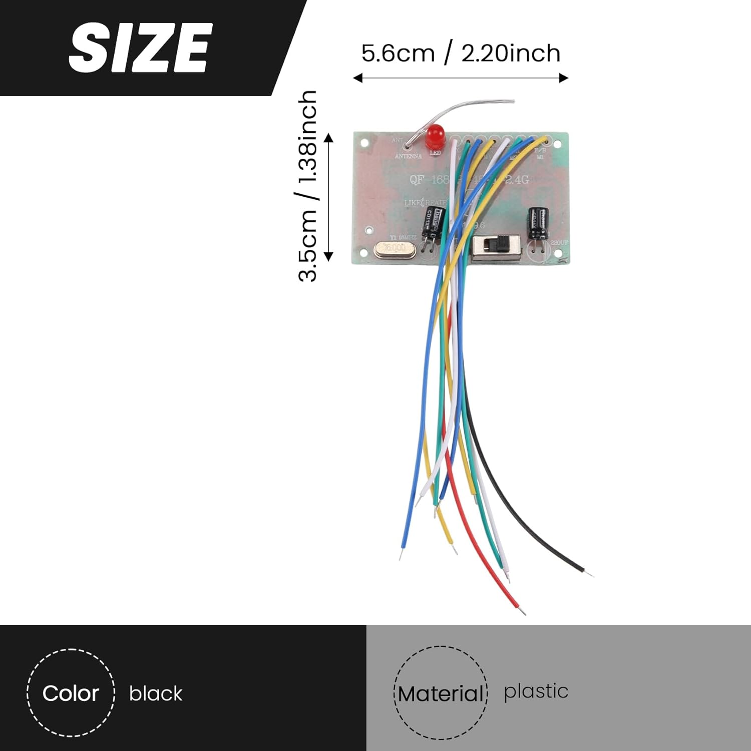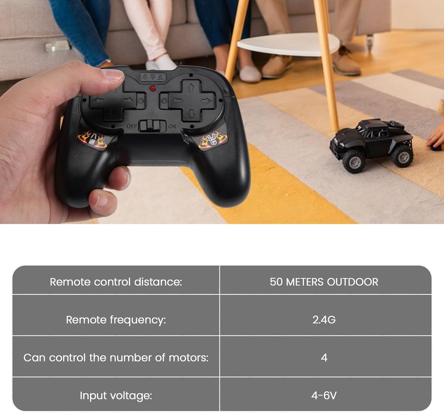 Tensione di ingresso: 4-6 V Frequenza a distanza: 2,4 G Può controllare il numero di motori: 4 Distanza di controllo remoto: 50 metri all'aperto Alimentazione : due batterie 5 (non incluse)