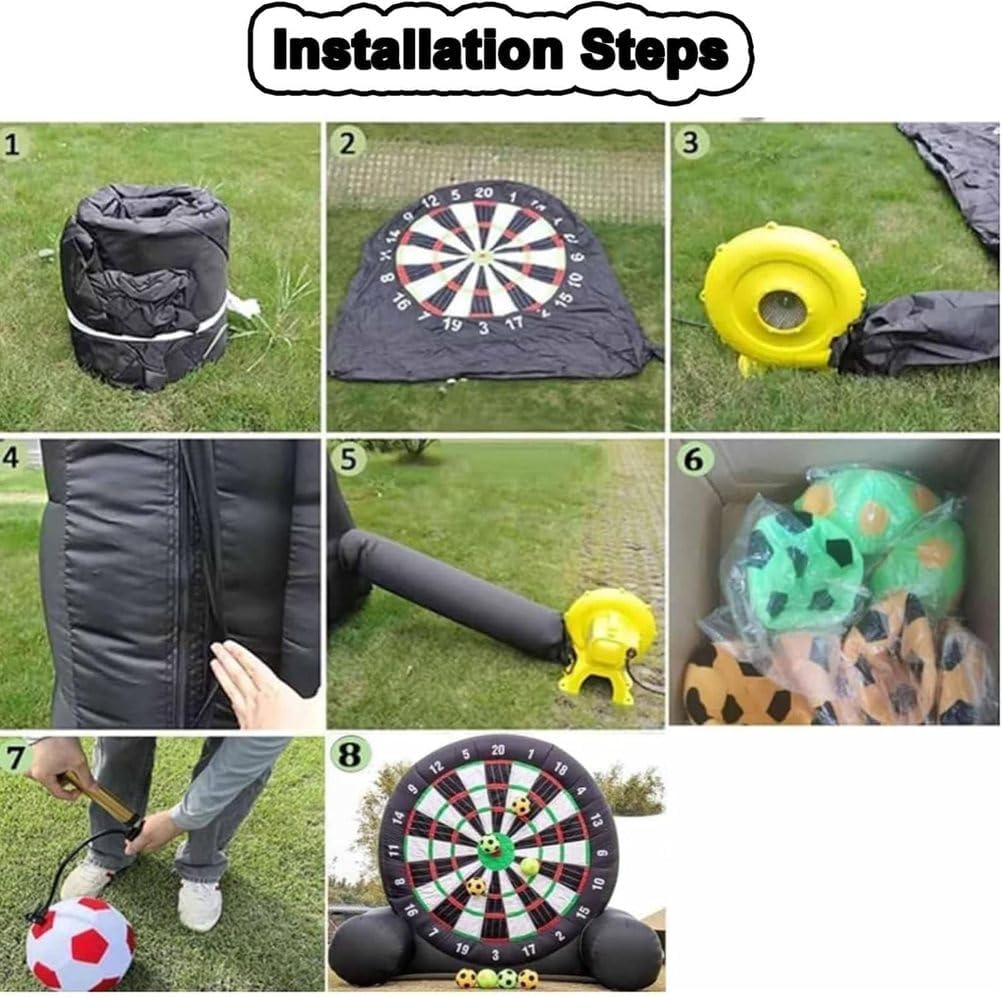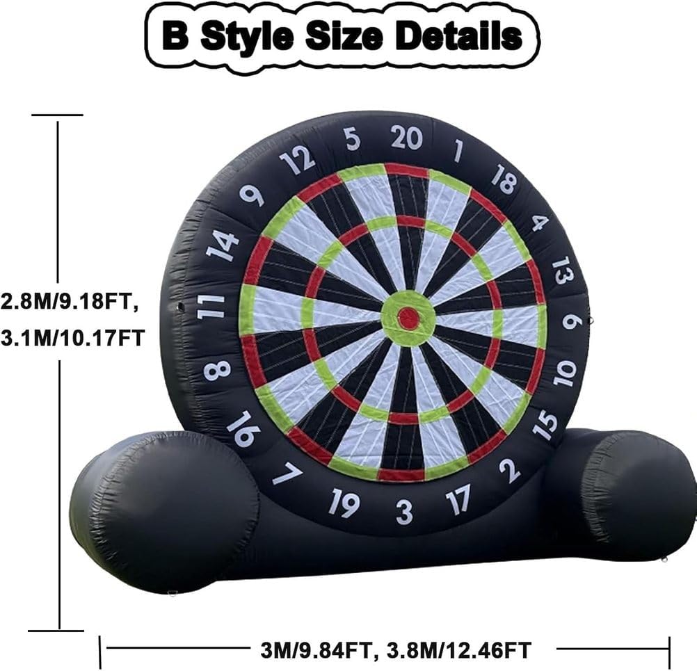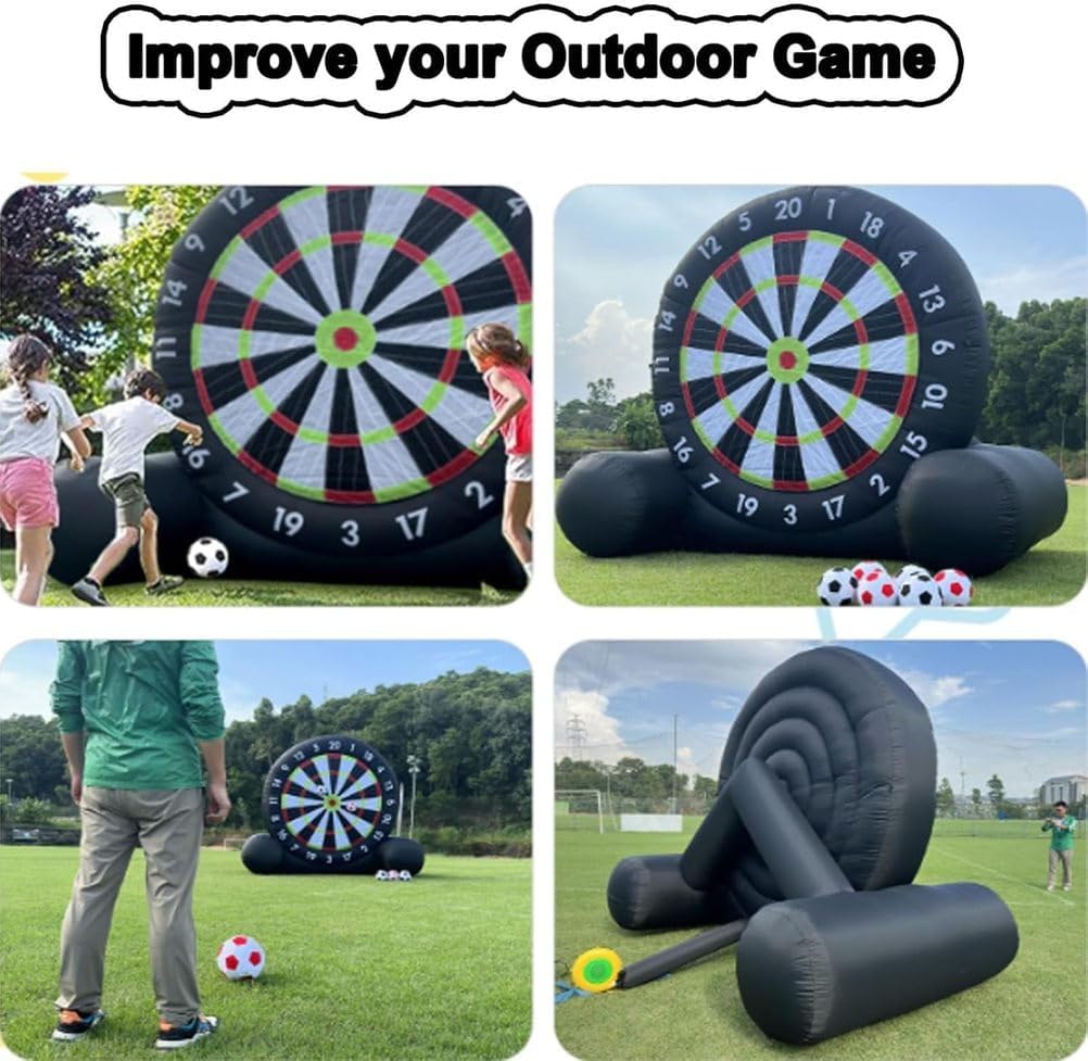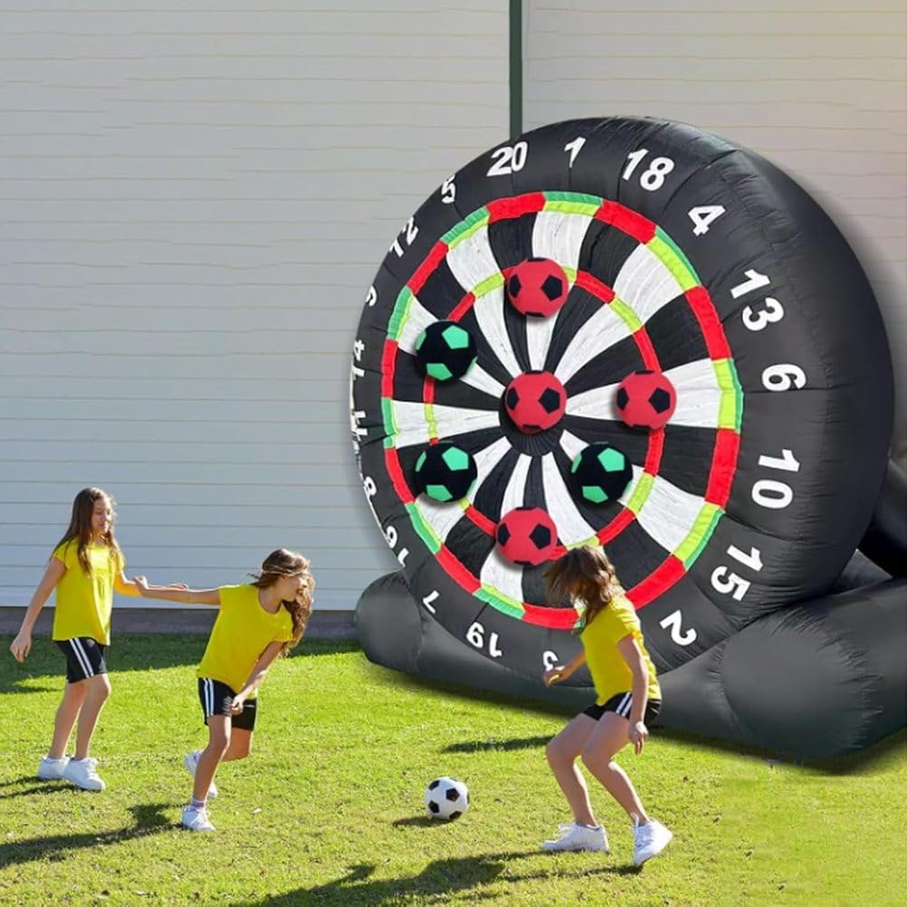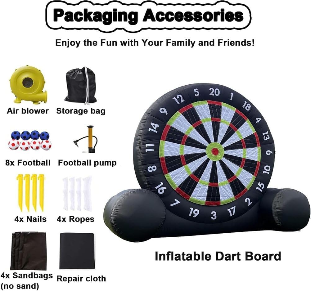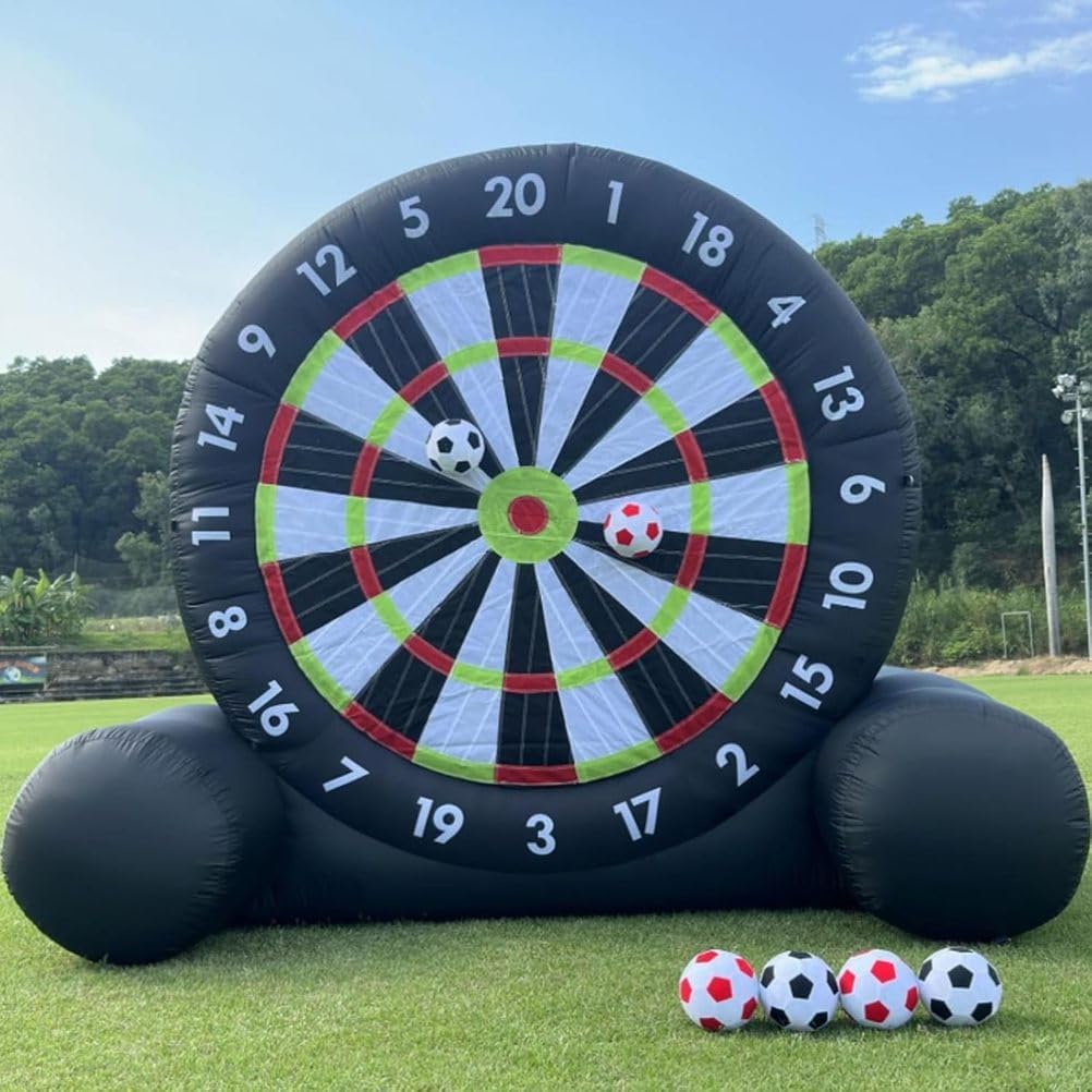 Grande Tavola da Dardo da Calcio Gonfiabile: Una volta gonfiata, l'altezza della tavola da dardo da calcio è uguale all'altezza della tavola da dardo da calcio. Vivi l'emozione di un enorme gioco di calcio combinato con le freccette. Come un oggetto competitivo per attività come giochi divertenti, le persone calciare palloni da calcio sulla tavola da dardo gonfiabile, e i punteggi vengono calcolati in base alla posizione o all'area di impatto. Pannello per freccette adesivo super resistente: Non ci saranno più palline frustranti che cadono dal bersaglio. Il pannello per freccette gonfiabile è costruito per una massima aderenza e una presa extra, ma può comunque essere facilmente rimosso anche dai giocatori più piccoli. Più durevoli e stabili: i nostri bersagli per freccette sono disponibili in due dimensioni; il bersaglio gonfiabile è realizzato in tessuto Oxford, che è antistatico e più resistente all'usura. Tutti i giunti del bersaglio per freccette a forma di calcio sono cuciti due volte per una maggiore tenuta ermetica e durata. Le freccette presentano un design a telaio triangolare, rendendole più stabili rispetto ad altri bersagli per freccette. Assembla rapidamente il pallone da calcio gonfiabile e il bersaglio: basta collegare un asciugacapelli da 350 watt, gonfiare il bersaglio, chiudere la valvola di sfiato e iniziare a giocare. Usa la pompa portatile per gonfiare rapidamente le otto palline da bersaglio incluse per un divertimento istantaneo. Assicurati che l'asciugacapelli rimanga collegato durante il gioco per mantenerle completamente gonfie. Occasioni multiple, divertimento multiplo: il nostro gioco con palla da calcio gonfiabile e bersaglio da freccette porta i tuoi giochi all'aperto a un livello superiore: una combinazione di calcio e freccette per divertirti con la famiglia, gli amici o chiunque desideri un brivido. Rendi i giochi di squadra ancora più emozionanti nel tuo giardino, in palestra o a scuola!
