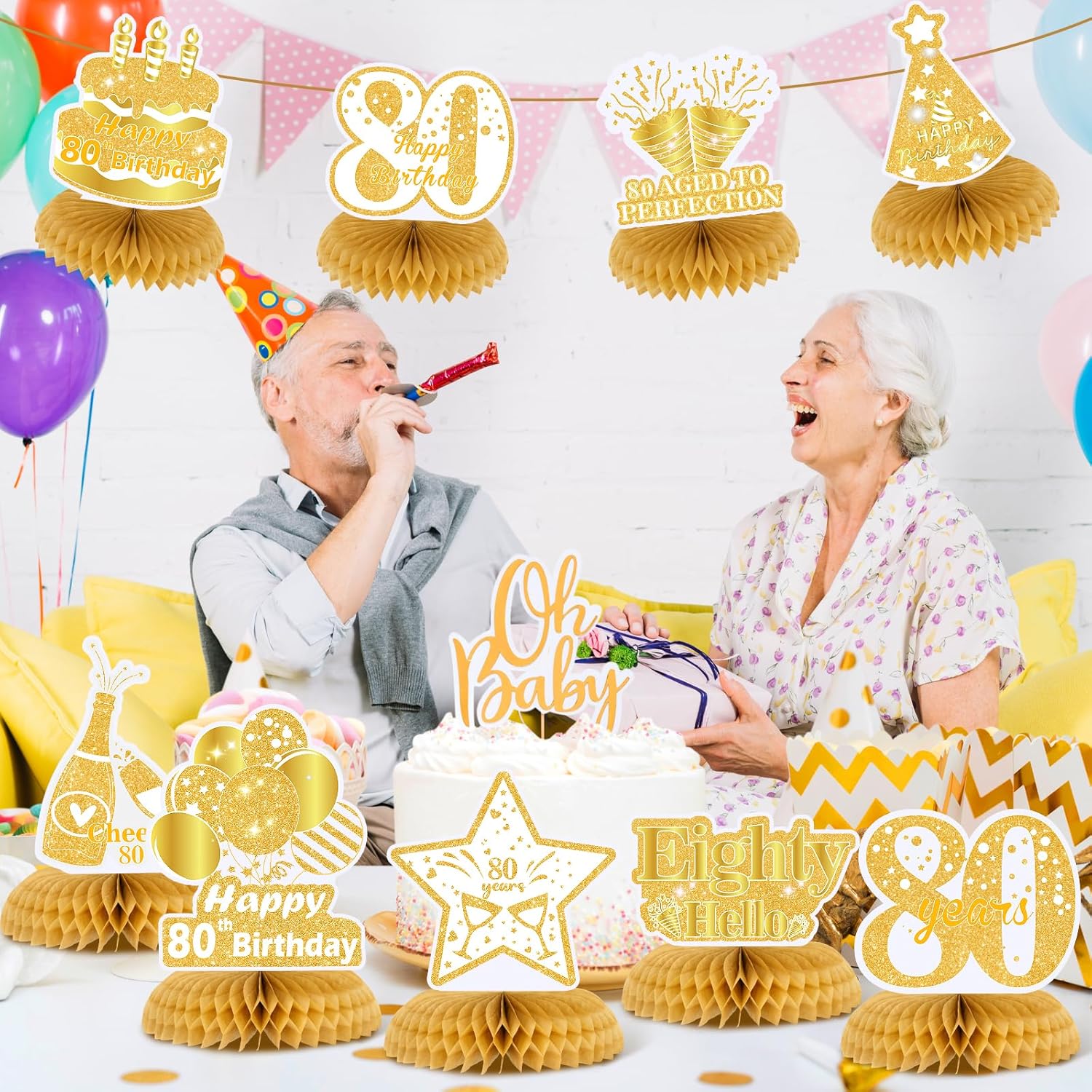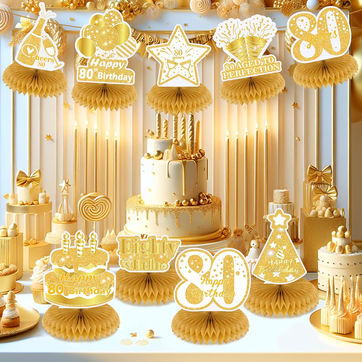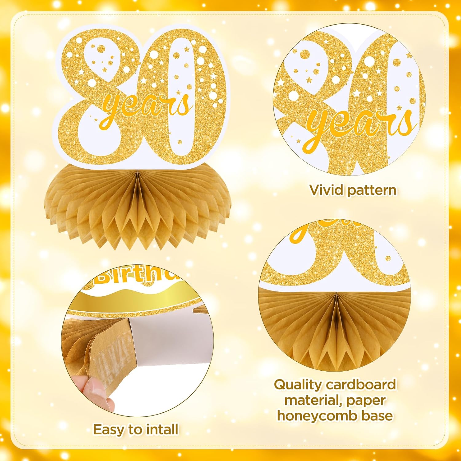 Decorazioni per 80° compleanno: ci sono 9 centrotavola a nido d'ape bianchi e oro per 80° compleanno in diversi stili. Queste fantastiche decorazioni sono adatte per una festa di 80° compleanno, decorazione per feste di 80° anniversario [Design squisito]: queste decorazioni da tavola per 80° compleanno sono progettate con diverse forme e motivi come palloncini, torte, stelle e accattivanti lettere "80 anni" "felice 80° compleanno", abbastanza adatte per la tua festa di 80° compleanno, festa di 80° anniversario Ampia applicazione: i centrotavola decorativi per 80° compleanno in oro bianco sono adatti per feste di 80° compleanno a tema oro bianco e feste di compleanno a tema vintage di 80 anni per tua madre, nonna o altre famiglie. Puoi metterli sul tavolo delle feste, o stringerli insieme con una corda e appenderli a parete, finestra, camino e altri luoghi che desideri decorare Materiale: questi favi per 80° compleanno bianco oro sono realizzati in cartone resistente e carta. Inoltre, questi centrotavola per 80° compleanno sono stampati con un motivo a doppia faccia Facile da montare: i centrotavola per 80° compleanno sono abbastanza facili da montare. In primo luogo, strappare l'adesivo della base a nido d'ape, quindi attaccarlo sull'area fissa del biglietto, e infine metterlo sul tavolo o appenderlo con clip per decorare il luogo che ti piace, aggiungendo più punti salienti per la festa di 80° compleanno