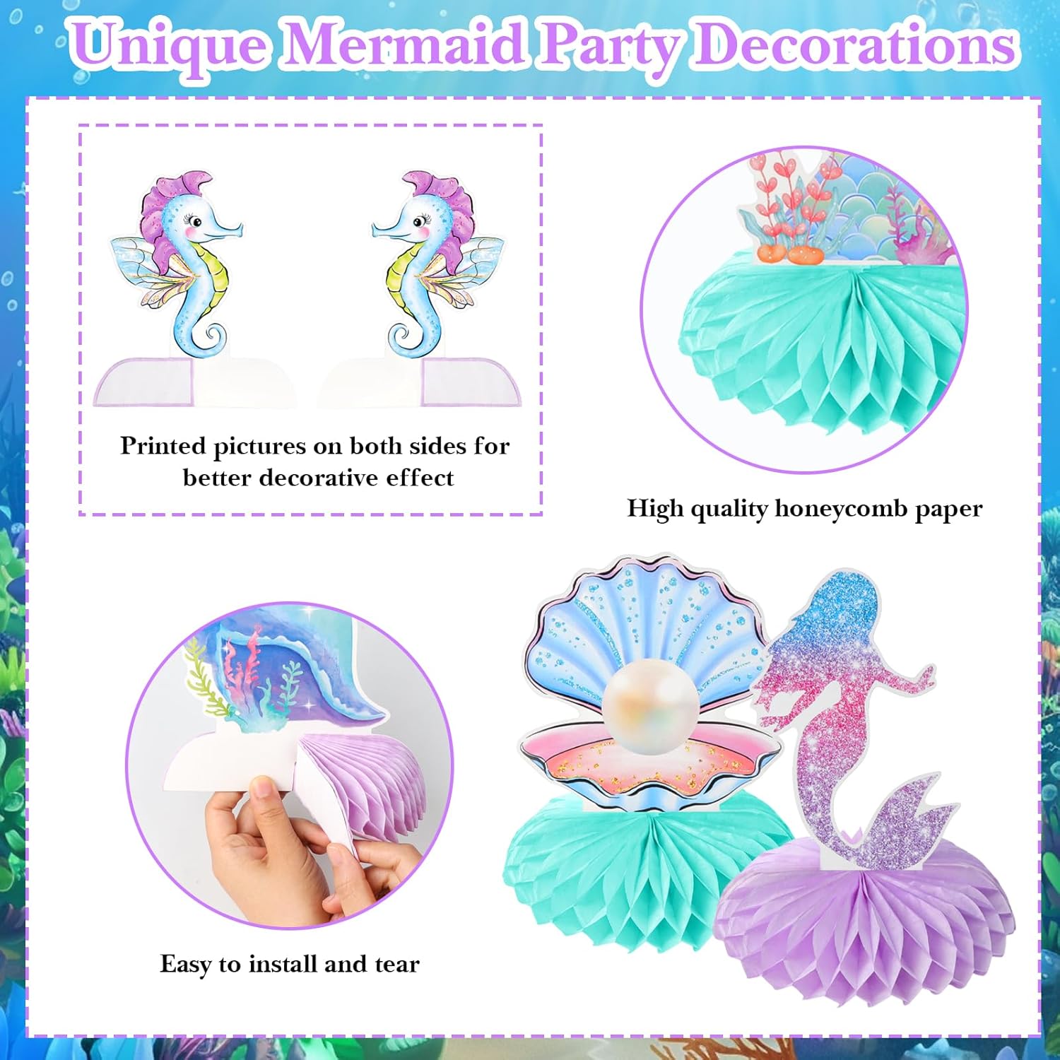 Decorazioni di compleanno a forma di sirena: trasforma la tua festa con le nostre 9 decorazioni per feste a tema sirena, con disegni vivaci e giocosi che incarnano la magia delle sirene, perfette per qualsiasi festa di compleanno a forma di sirena Decorazioni per torte a sirena di alta qualità: realizzate in cartone di alta qualità, la nostra decorazione a sirena garantisce sicurezza e durata senza odori sgradevoli. Queste decorazioni a nido d'ape resistono allo sbiadimento e alla rottura, rendendole perfette per decorazioni di compleanno a sirena di lunga durata o anche decorazioni per baby shower a sirena Decorazioni uniche per feste a sirena: crea un'atmosfera incantevole con il nostro arredamento diversificato e unico a forma di sirena! Queste accattivanti decorazioni a nido d'ape sono ideali sia per ragazzi che per ragazze, amplificando l'eccitazione in qualsiasi riunione a tema marino, festa di famiglia o festa a sirena Decorazioni a nido d'ape facili da installare: i nostri centrotavola a sirena per tavoli sono progettati per un montaggio rapido e senza sforzo. Segui le semplici istruzioni e in pochi secondi puoi elevare la tua festa a tema sirena, rendendola elegante e divertente per tutti i tuoi ospiti Uso versatile per ogni occasione: oltre alle celebrazioni di compleanno, le nostre decorazioni per feste a sirena sono perfette per vari eventi, tra cui baby shower a tema sirena o riunioni a tema oceano. Trasforma qualsiasi spazio in un paradiso sottomarino con il nostro incantevole arredamento a sirena e crea ricordi indimenticabili