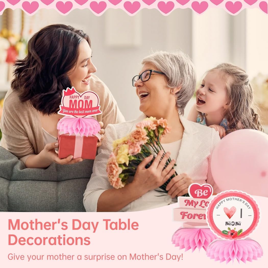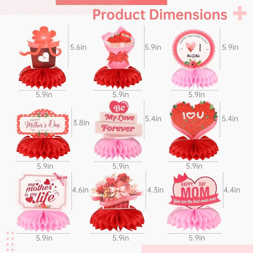 SET COMPLETO DA 9 PEZZI: Include nove decorazioni da tavola in stile nido d'ape con stampa fronte-retro; ognuno con simboli diversi per la festa della mamma; progettato per evidenziare l'amore e la celebrazione. Sorpresa sincera: aggiunge un tocco sentimentale alle riunioni; Rosso e colori abbinati a temi ponderati; crea un'atmosfera significativa per le madri, Assemblaggio senza attrezzi: Cuscinetti adesivi integrati a nido d'ape; Attacca direttamente sulle carte corrispondenti; Non sono necessari colla o accessori; Installazione rapida in pochi minuti Superficie in cartone spesso: realizzata in robusto cartone laminato; stampe vivaci resistono allo sbiadimento; mantiene colori nitidi durante tutto l'evento Arredamento versatile: per la festa della mamma, compleanno o brunch; sta in piedi su superfici piane; facile da appendere con clip (non incluse)