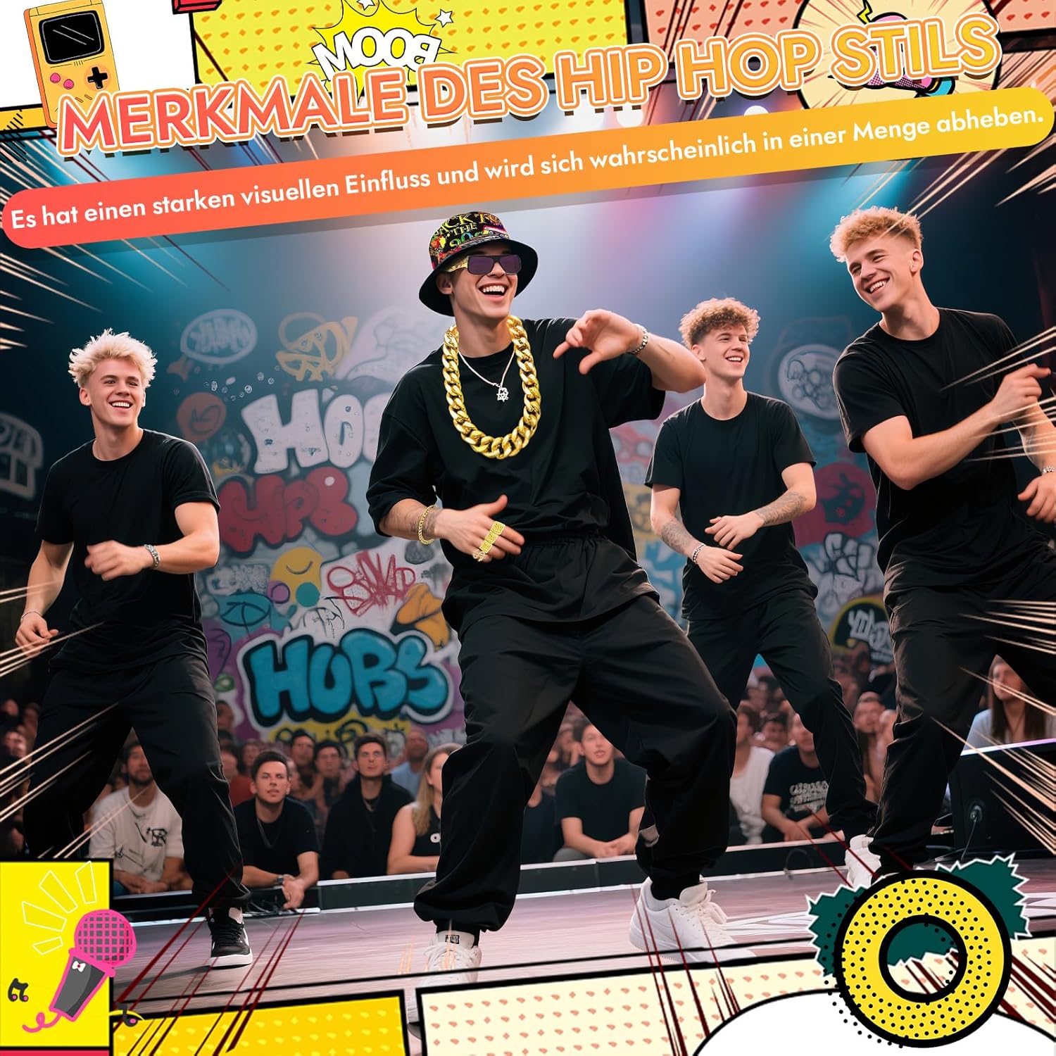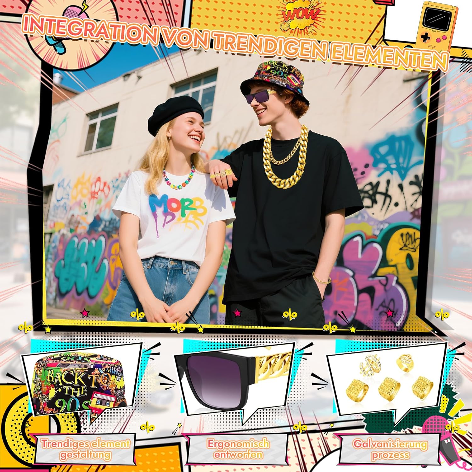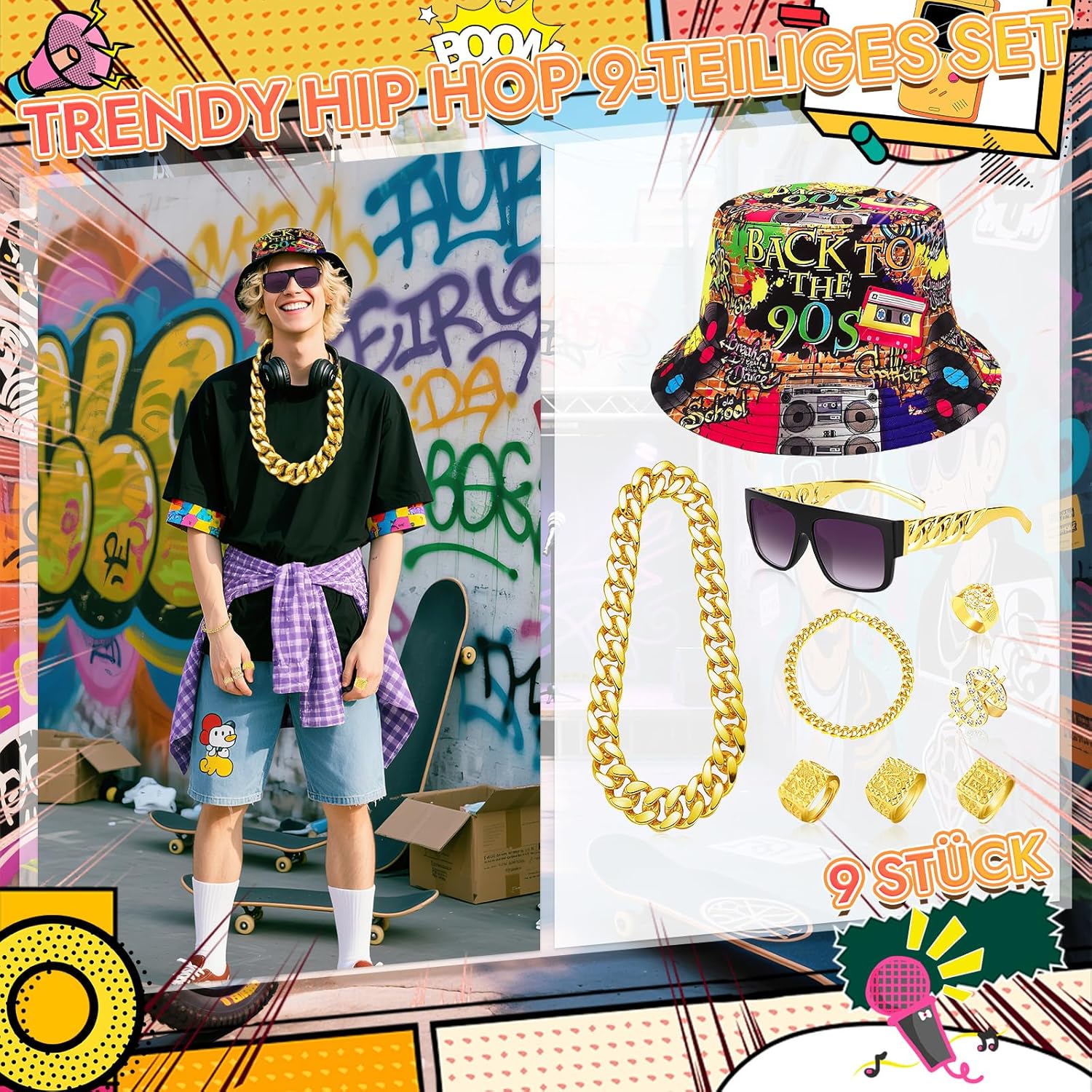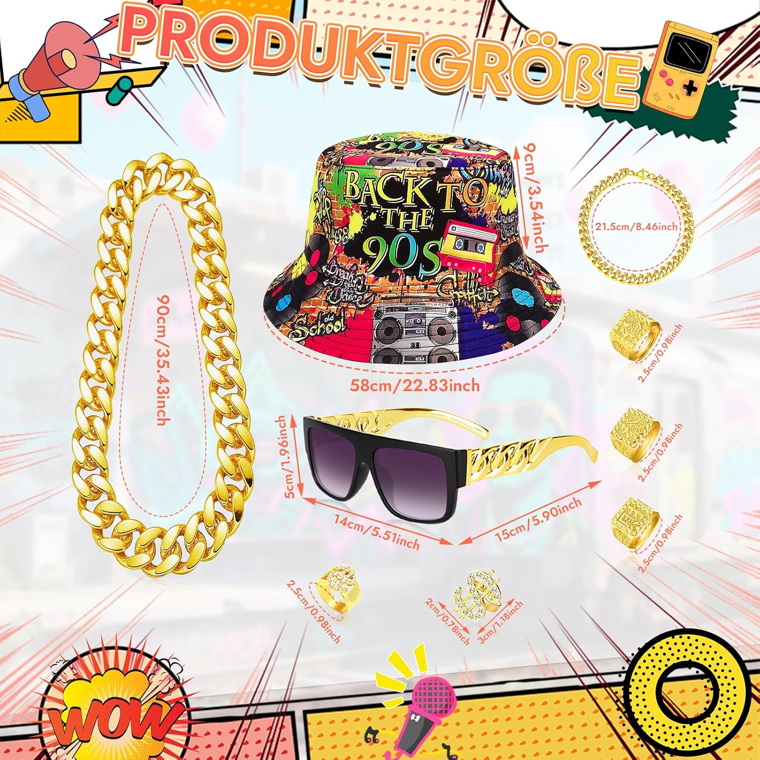 1. Con questo set di accessori hip hop mostrerai la tua personalità alla festa. 2. Il set di 90 collane con tatuaggi è perfetto per star rap, milionari e tutti coloro che sono appassionati di moda hip-hop. 9 pezzi. Contenuto della confezione: · 1 collana in oro da 90 cm. 1 bracciale: 20 cm. · 2 anelli per segno del dollaro. ·Anelli con i caratteri ""(fortuna), ""(ricchezza), ""(successo) x3 1 paio di occhiali da sole hip-hop. 1 cappello hip-hop. Adatto per: ·Amanti della cultura hip-hop Appassionati alla moda. ·I consumatori che apprezzano gli accessori individuali Si prega di prestare attenzione 1. A causa delle diverse impostazioni dei monitor, potrebbe esserci una differenza di colore tra i prodotti reali e le immagini del prodotto. 2. La dimensione del prodotto è misurata manualmente e ci sono alcune deviazioni. 3. Se avete domande, vi preghiamo di contattarci in qualsiasi momento. Indicazioni di sicurezza: Pericolo di soffocamento: piccole parti, non adatto a bambini di età inferiore a 3 anni. Da utilizzare sotto la supervisione di un adulto.