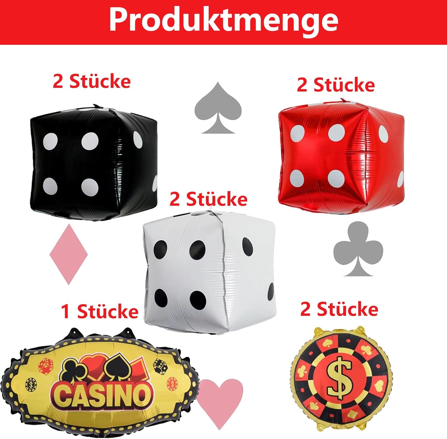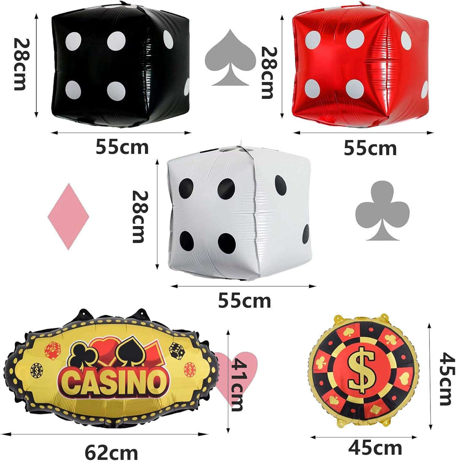 Decorazioni per feste a tema casinò: la confezione contiene 2 palloncini neri dice, 2 palloncini rossi, 2 palloncini bianchi, 2 palloncini rotondi, palloncini da casino soddisferanno le vostre esigenze di decorazione. Qualità premium: il palloncino dell'alfabeto premium in pellicola di alluminio è ispessito. Può essere utilizzato ripetutamente, sigillatura automatica. I palloncini a forma di lettere non sono gonfiati. È possibile riempire il palloncino in pellicola a seconda delle necessità con una pompa o una cannuccia. Design unico: abbiamo elementi importanti del casinò su questi dadi in modo che tu possa goderti il mondo del poker del casinò con la famiglia o gli amici e divertirti un momento di festa da casinò divertente Come Soffiare: Con la paglia. Inserire la cannuccia nella valvola del palloncino. Soffia aria attraverso la bocca. L'effetto del 90% è perfetto. Non soffiare troppo. Dopo l'uso. Usa la paglia per drenare il gas. È un prodotto riutilizzabile. Se li tieni bene, puoi usarli più spesso. Bel design: i palloncini da casinò, composti da tre cubi colorati, sono la scelta ideale per serate di gioco e feste a tema casinò, rendendo la tua festa a tema mozzafiato e indimenticabile