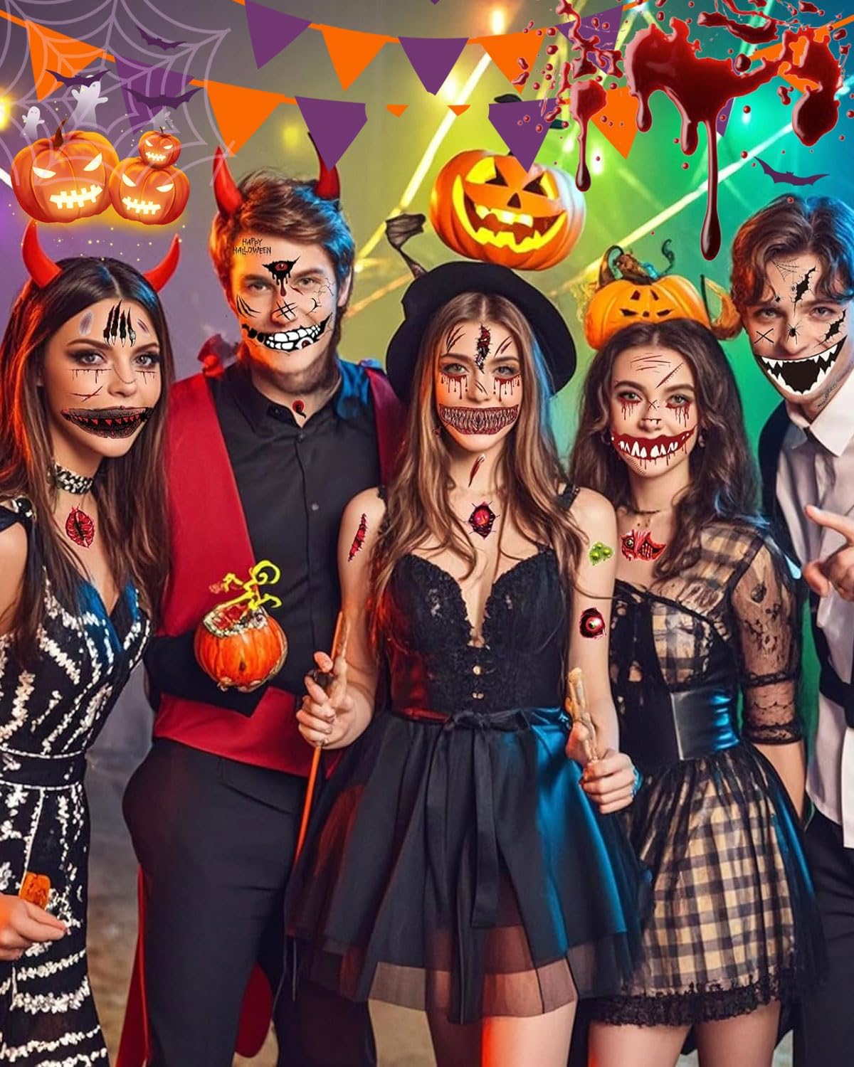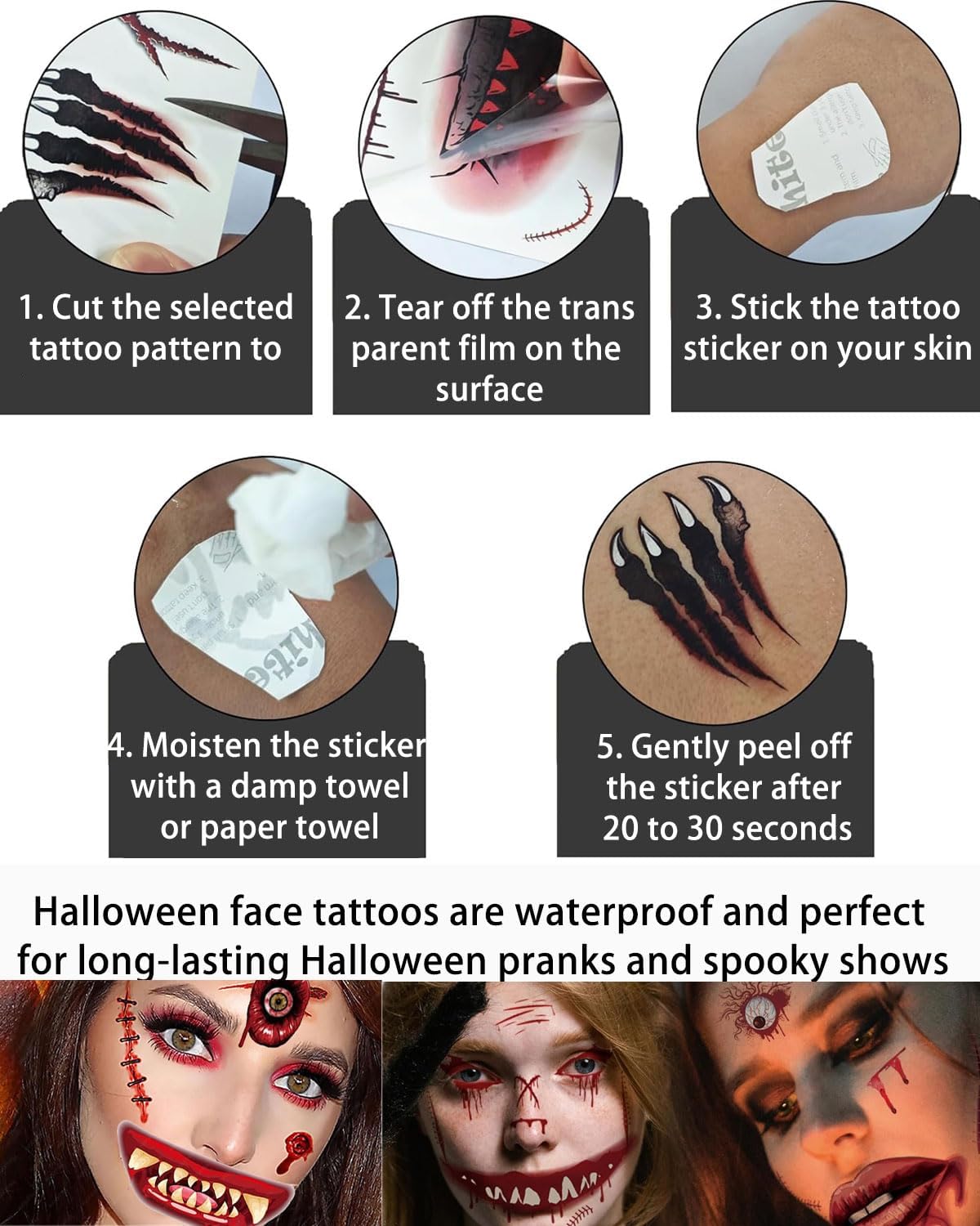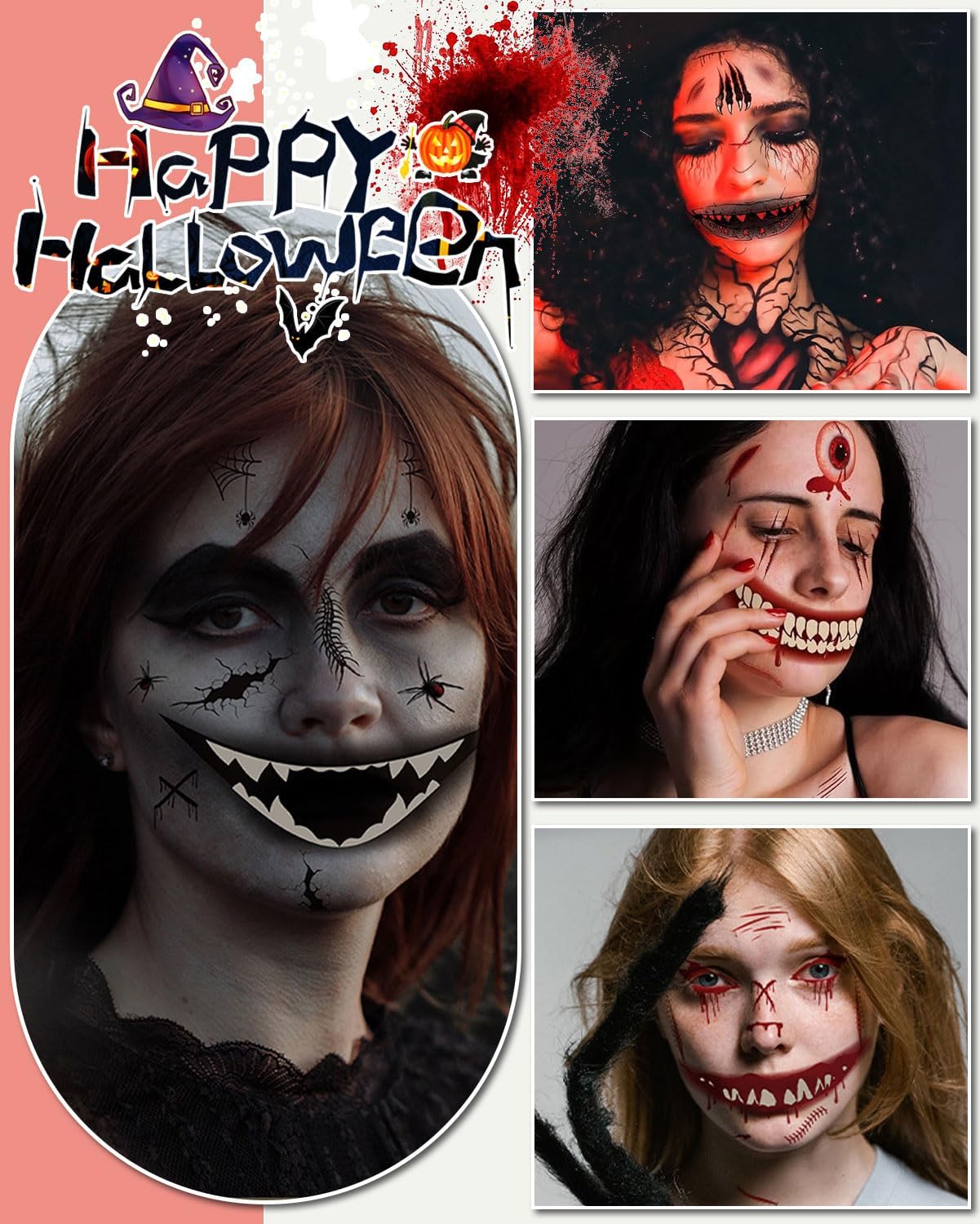 TATTOS VISO REALISTICO DI HALLOWEEN: trasformate il vostro viso in un'immagine davvero spaventosa con i nostri tatuaggi di Halloween da brivido, che includono disegni di demoni, vampiri, zombie, clown e scheletri. Perfetti per qualsiasi festa di Halloween. HALLOWEEN MOUTH TATTOOS FACILE APPLICAZIONE: i nostri adesivi per il viso sono facili da applicare e aggiungono un tocco spaventoso al tuo look. Particolarmente adatti per i tatuaggi a forma di teschio di Halloween e per i disegni di bocche inquietanti. VERSATILI ACCESSORI DI HALLOWEEN: che si tratti di tatuaggi con la bocca, tatuaggi con la faccia da teschio o tatuaggi per il trucco, questi accessori di Halloween offrono infinite possibilità per creazioni spaventose. TATUAGGI PER IL VISO DI HALLOWEEN IMPERMEABILI: i tatuaggi per il viso di Halloween sono impermeabili e perfetti per scherzi di Halloween di lunga durata e look spaventosi. Grande per gli scherzi di Halloween: spaventa i tuoi amici con un tatuaggio realistico della faccia del teschio o un tatuaggio inquietante della bocca del clown. Perfetto per Halloween e altre occasioni spaventose.
