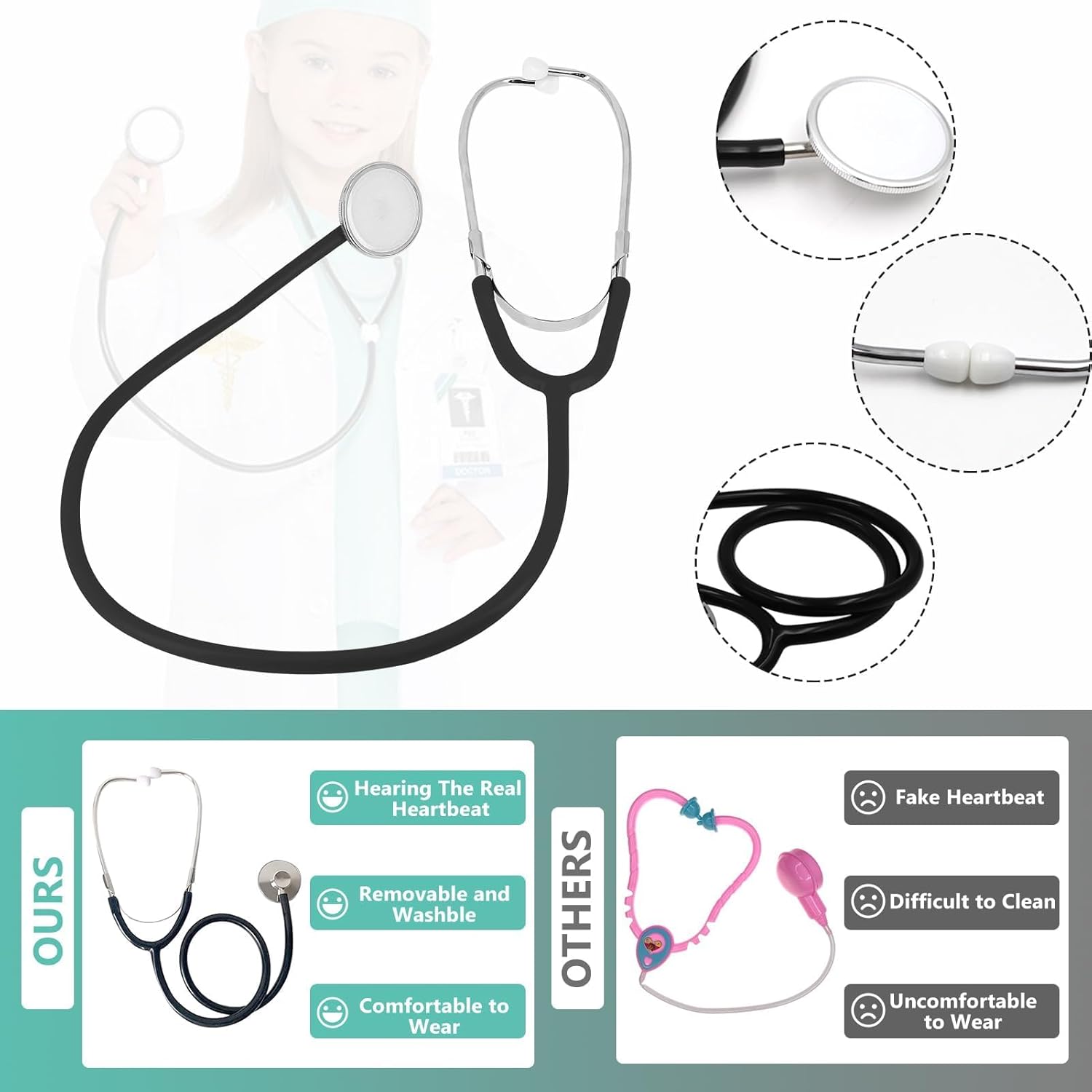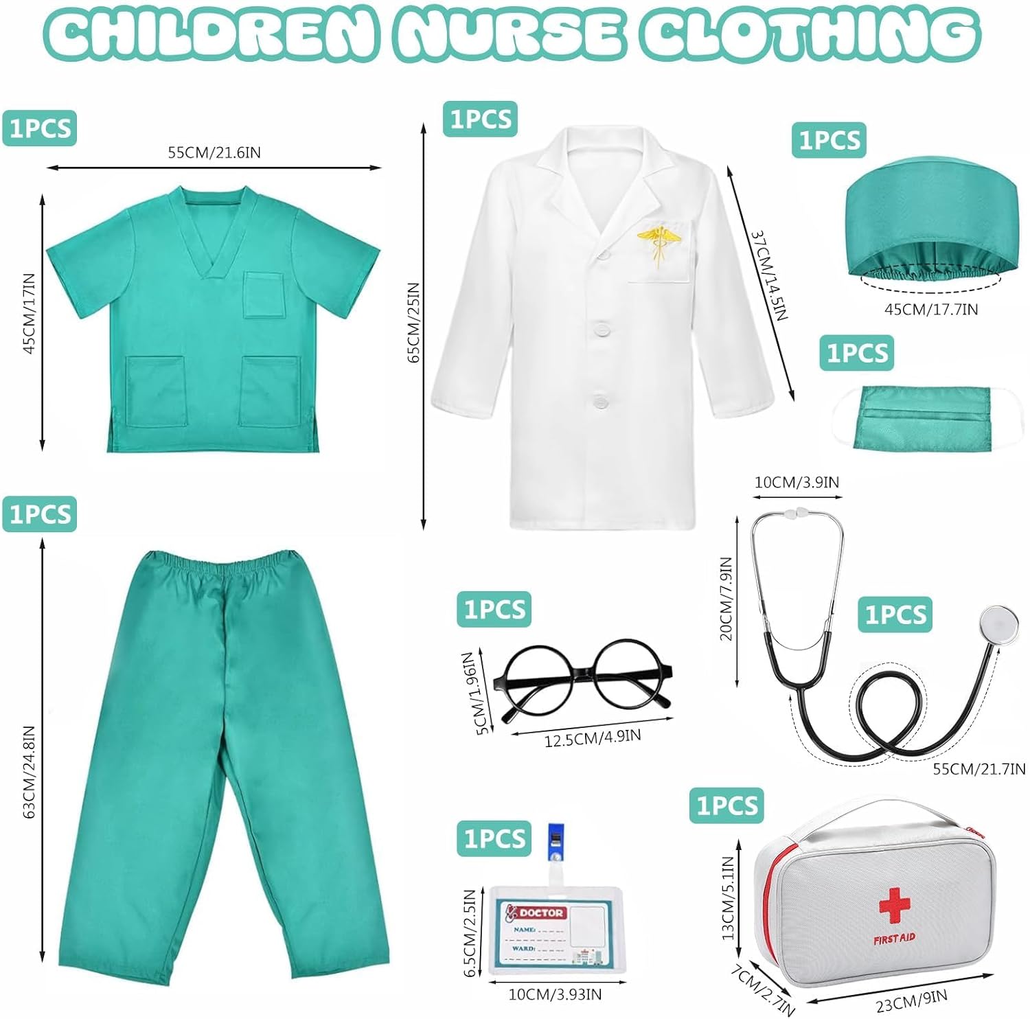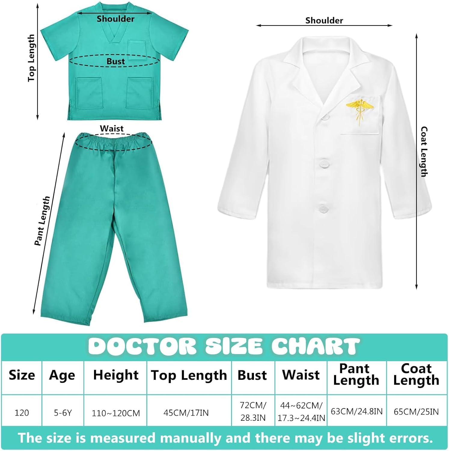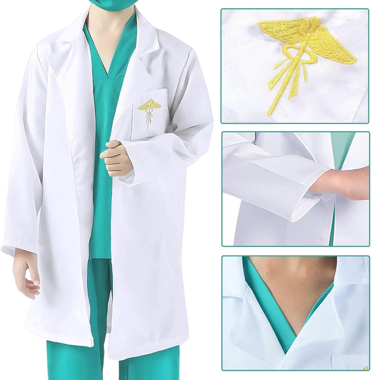 【SET COMPLETO DI COSTUMI DA MEDICO】 Questo set di costumi da comprende 1 camice da medico, 1 tuta chirurgica (top + pantaloni), 1 berretto da medico, 1 stetoscopio, 1 scheda per il petto, 1 maschera per il viso e 1 borsa di pronto soccorso. Offre un costume da medico completo e permette di immergersi nell'affascinante mondo dei medici 【MATERIALI DI ALTA QUALITÀ】 Il camice da medico è realizzato in fibre di poliestere e la tuta chirurgica è piacevolmente morbida e delicata sulla pelle. Il design traspirante e la vestibilità ampia assicurano che si sentano a proprio agio quando li indossano e i materiali sono durevoli, resistenti al colore e delicati sulla pelle. 【DESIGN PRATICO】Sia il camice da medico che la tuta chirurgica sono dotati di ampie tasche che consentono di portare con sé oggetti personali. La borsa del medico offre un pratico spazio per organizzare e trasportare accessori come lo stetoscopio e gli occhiali per fornire il primo soccorso in qualsiasi momento. Rendi il gioco di ruolo più interessante e allevia la paura 【GIOCATTOLO educativo】Indossando il camice da medico, i inserire la foto nella carta d'identità, indossare gli occhiali e simulare il processo di visita dei pazienti. Questo la creatività e immaginazione. Il costume da medico non è solo un capo di abbigliamento, ma anche un giocattolo educativo che promuove la capacità di problem solving, il lavoro di squadra e la comunicazione 【USI VERSATILI】 Adatto a varie occasioni come interni ed esterni. Adatto non solo per l'uso quotidiano, ma ideale anche per Halloween, Natale, carnevale, feste di compleanno, riprese video, spettacoli teatrali, giochi di ruolo e come regalo di compleanno. Offre una varietà di esperienze di intrattenimento