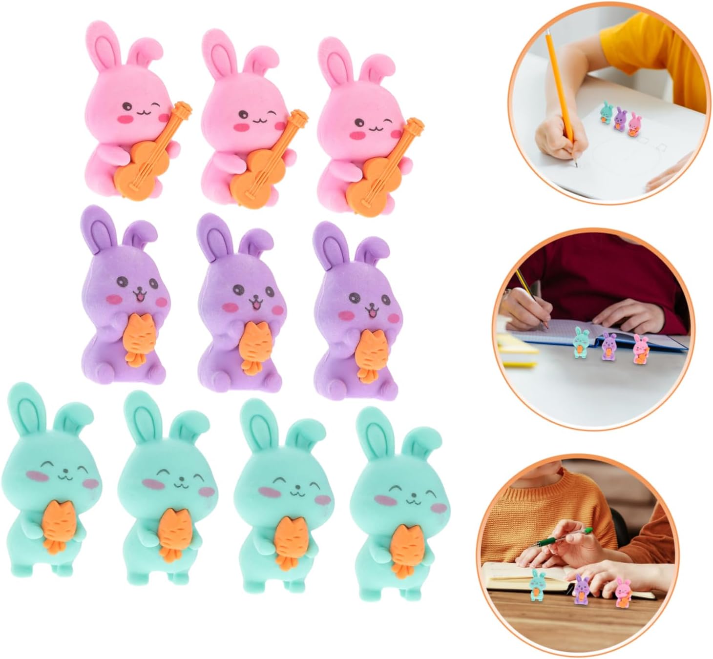 Design adorabile: la simpatica forma di coniglietto di queste gomme catturerà sicuramente il cuore dei , rendendoli desiderosi di usarle per i loro compiti scolastici Migliora l'apprendimento: con il loro design accattivante, queste gomme aiutano ad aumentare l'entusiasmo degli studenti nell'apprendimento e nel completamento dei loro compiti Senza residui: queste gomme rimuovono efficacemente i segni di matita senza lasciare detriti, garantendo ogni volta un risultato pulito e ordinato Multiuso: ideali per l'uso in scuole, uffici e case, queste gomme sono versatili e adatte a vari compiti e attività Per le feste: queste gomme sono ottimi regalini per le feste, premi in classe e regali per le feste, deliziando i con il loro aspetto carino