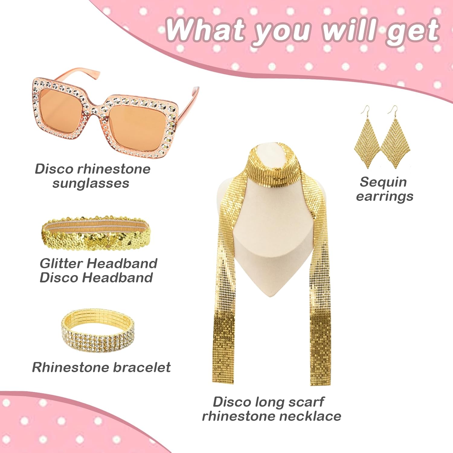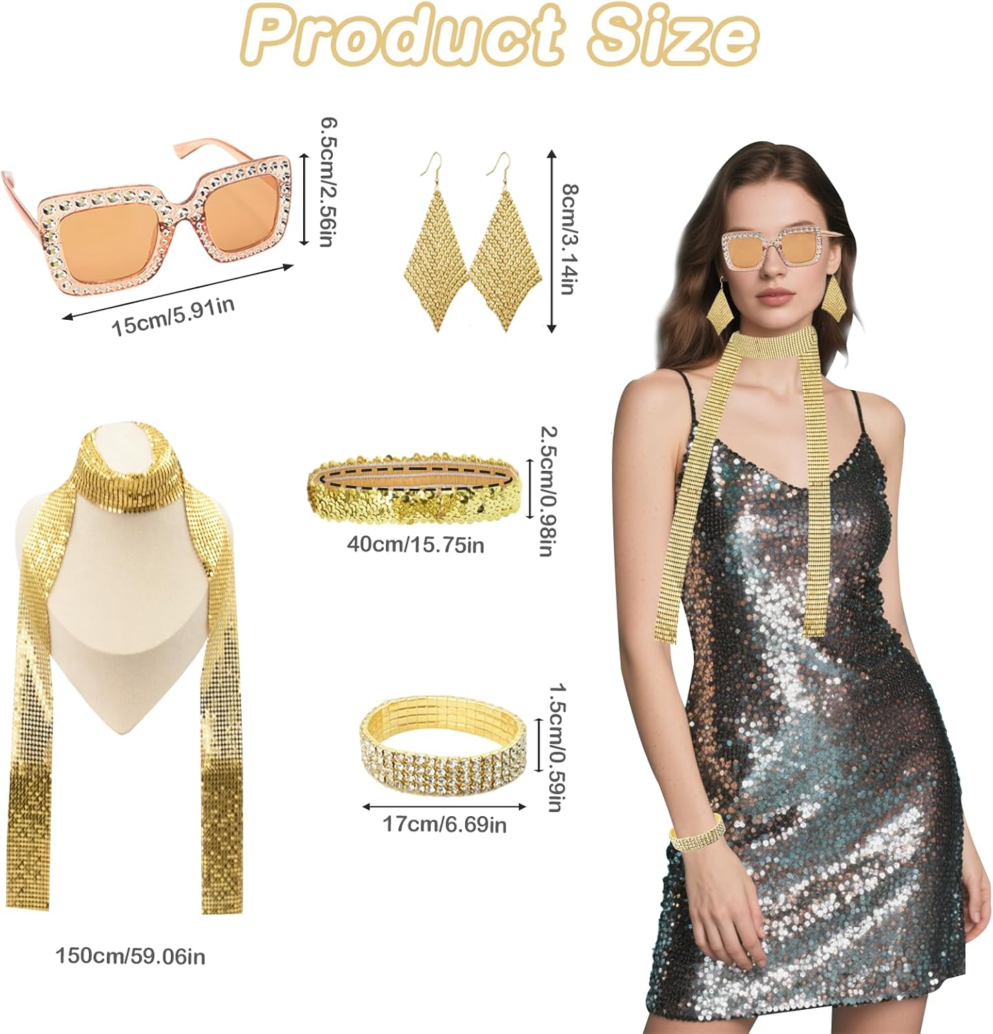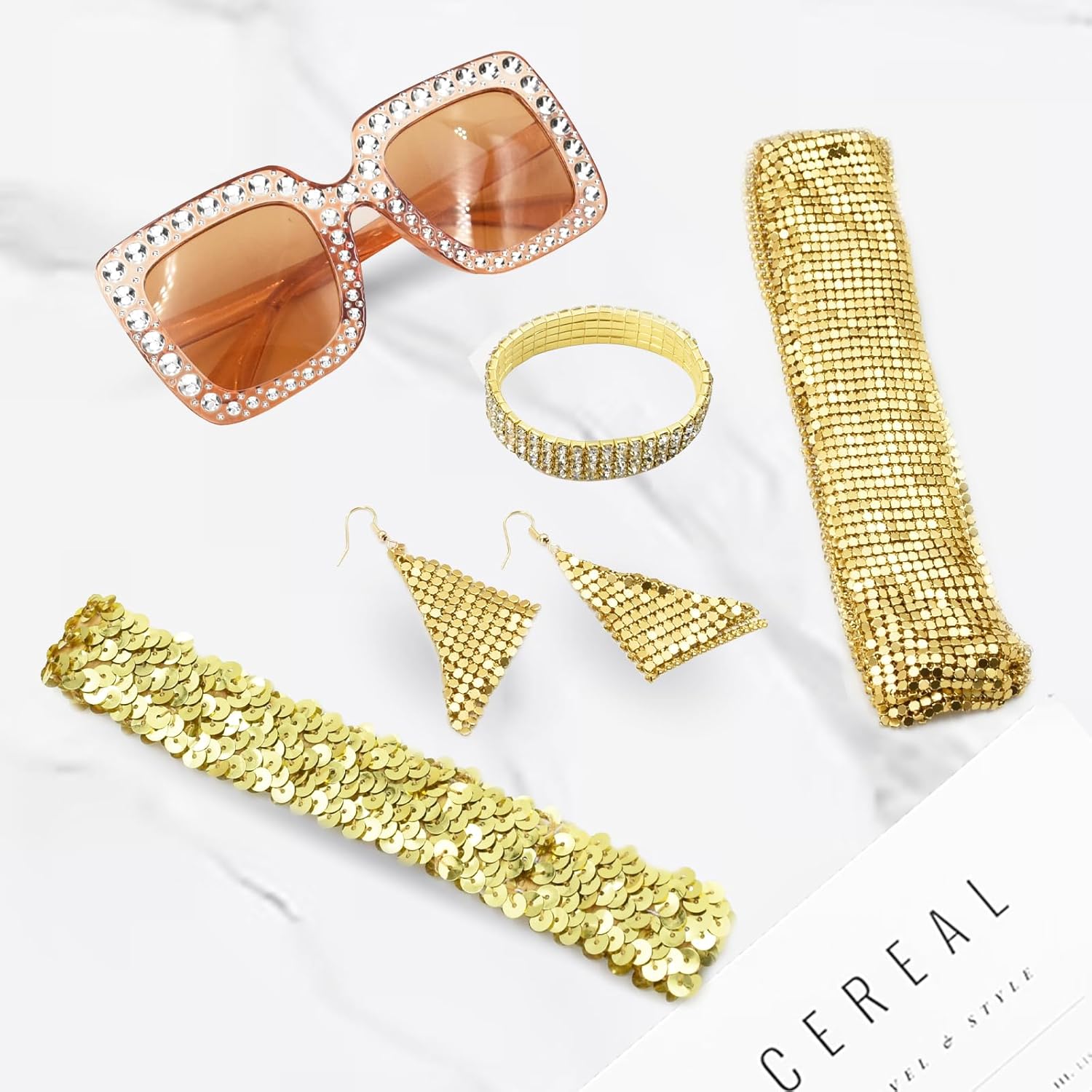 Nome del prodotto: set da discoteca 70s. Materiale: metallo. Colore: oro. La confezione include: 1. Occhiali da sole con strass. 1. Collo con strass da discoteca. 1. Orecchini in sequino. 1. Fascia con brillantini. 1. Bracciale con strass.