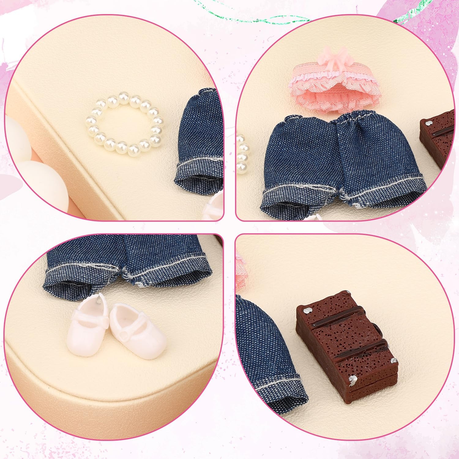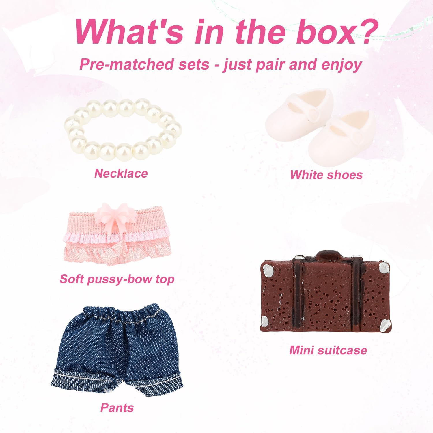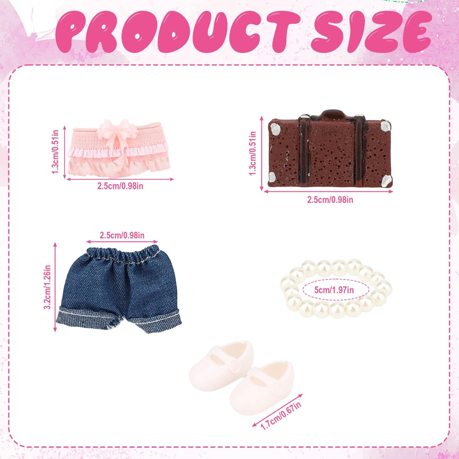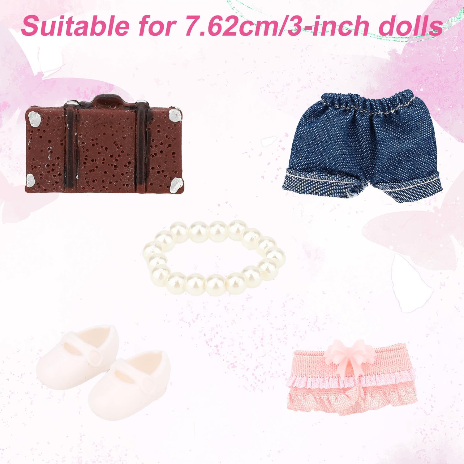 Set completo: il pacchetto include 1 top, 1 pantaloni, 1 paio di scarpe, 1 collana e 1 mini valigia, set pre-partita, consentendo condimento e decorazione istantanei per piccole bambole. Nota: la piccola bambola non è inclusa. Dimensioni adatte: progettate per adattarsi alle bambole da 7,62 cm. I vestiti sono leggeri, facili da indossare e si adattano perfettamente alle bambole in miniatura. Design adorabile: presenta materiali in tessuto morbido con dettagli in pizzo e bowknot, pantaloni eleganti e accessori abbinanti per rendere le bambole più affascinanti. Accessori divertenti: viene fornito con una collana carina, mini valigia e scarpe abbinate per aggiungere diversità e creatività al look della bambola, creando un aspetto carino infinito. Ottima scelta regalo: il set di abiti da bambola porta più divertimento al gioco delle bambole. Regalo perfetto per collezionisti di bambole, fan e bambini che amano i giocattoli in miniatura.