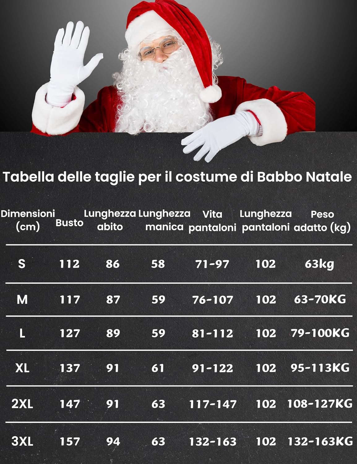 Penso sia, a questo prezzo, uno dei migliori costumi sul mercato, escludendo quelli di sartoria. E ho visti e provati davvero tanti, ma ognuno presentava qualche difetto. Questo mi ha rimasto stupito. Sono alto 1.90, 87kg taglia XL e il vestito mi calza alla perfezione, cura dei dettagli, il panatalone è compreso di un utilissima tasca, la giacca dei passa cintura e soprattutto di una zip e dei bottoni per chiuderla, da non dimenticare anche gli elastici nelle maniche, gli accessori (cappello, cintura, campanella, copriscarpe e occhiali) anche loro sono ben fatti. Per quanto riguarda invece guanti, sacco, barba e parrucca c'è da dire, ma nulla da parte mia in quanto ho acquistato questo articolo esclusivamente per il vestito. Quindi il mio parere è comunque alto. Parrucca e barba presenti nella foto sono presi a separatamente, come anche la parte finale del copriscarpe.