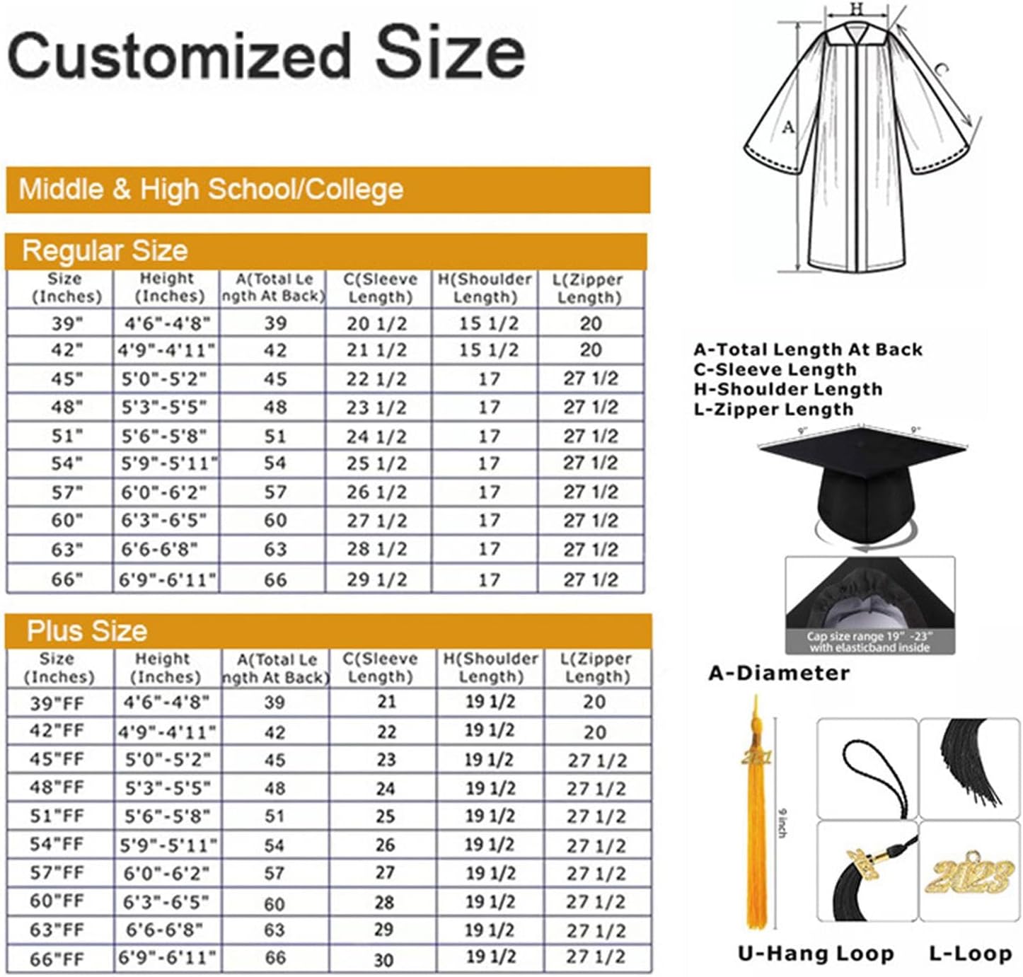 Descrizione prodotto Abito di laurea e Cap - Outfit di inizio formale, abbigliamento da cerimonia accademica | Abito opaco set con il fascino della nappe e 'anno, confortevole per le scuole superiori o gli studenti universitari maschili Descrizione: 1. Fatto in tessuto in poliestere di alta qualità. 2. Lavaggio in lavatrice o pulizia a secco. 3. Adatto alle cerimonie di laurea scolastica, alla chiesa e al coro o all'abbigliamento religioso. Specifica: Colore: nero Stile: adulto Dimensioni: 39-57 Lista imballaggio: 1*vestiti 1*cappello 1*TASSEL+ANNO SEAL Avviso di sicurezza Non applicabile