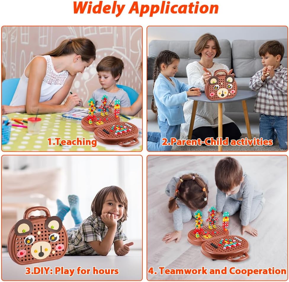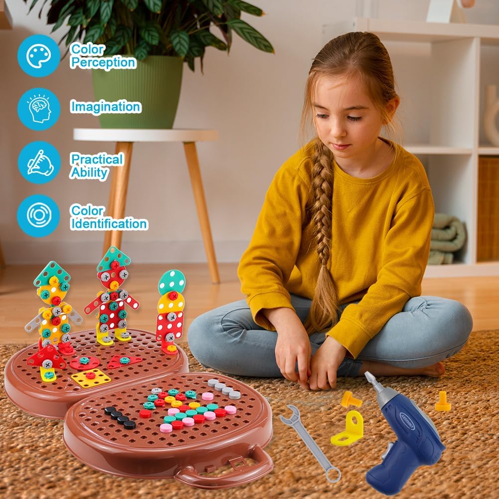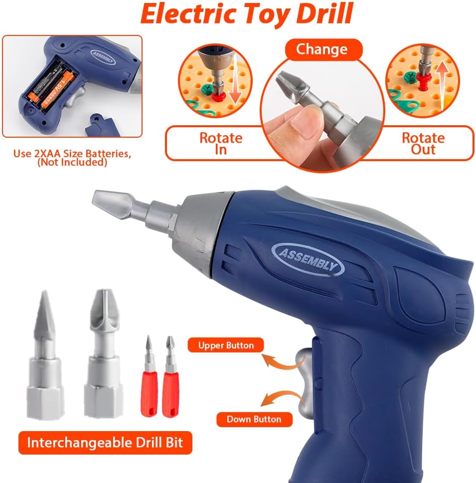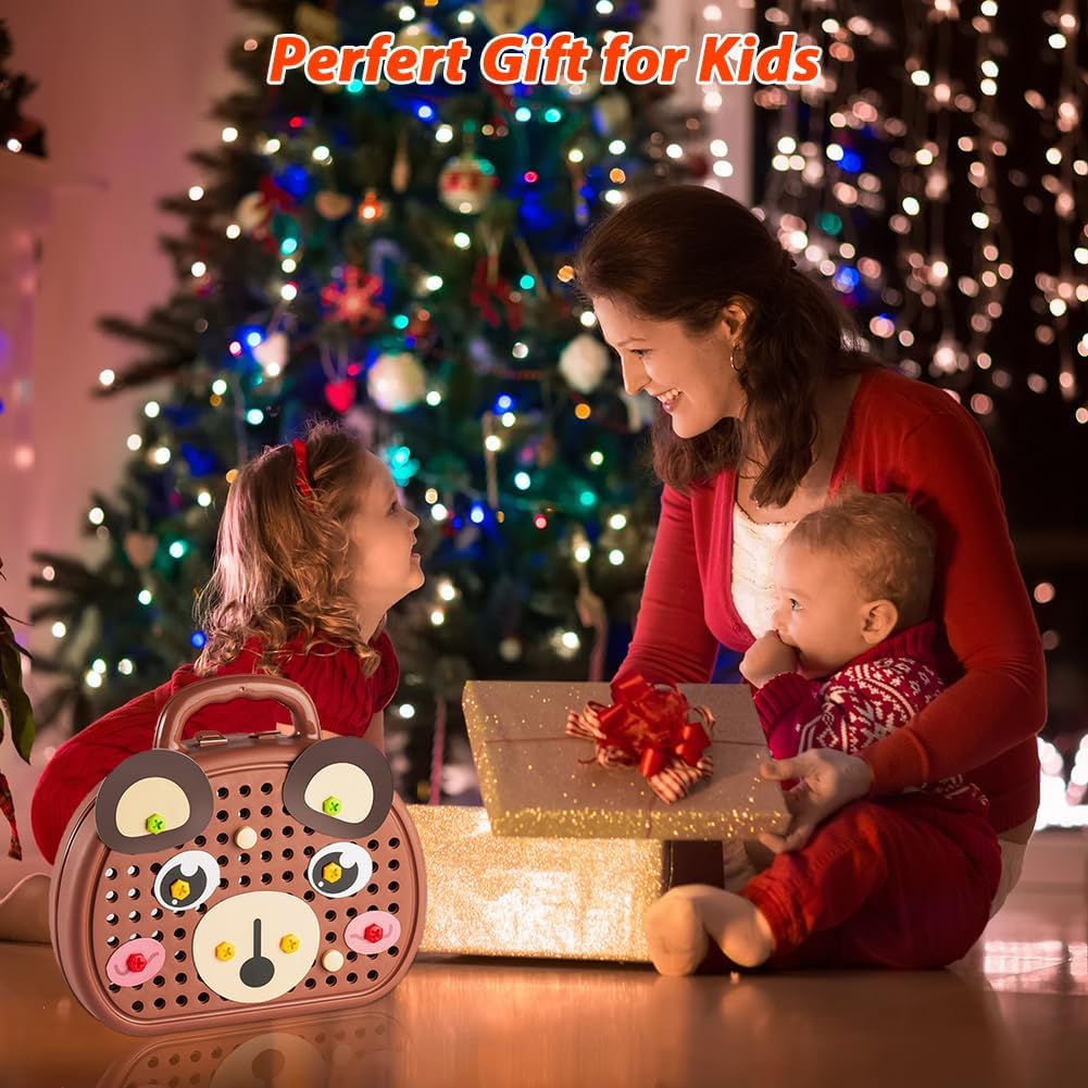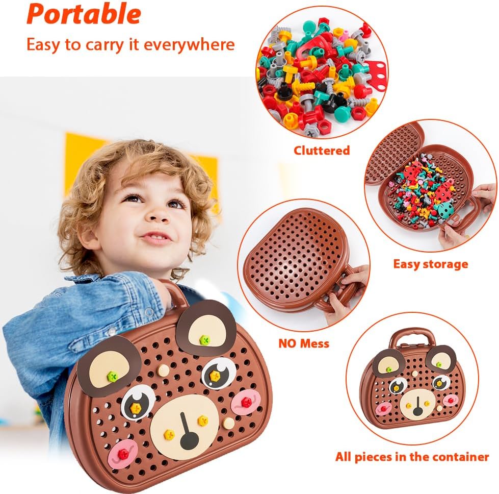 Combinazione di gioco ed educazione: il kit da gioco Montessori creativo e magico contiene 205 piccoli accessori, tra cui trapani e viti, che consentono ai bambini di sviluppare le loro abilità pratiche e la loro creatività progettando e costruendo i propri modelli fantasy combinando dadi e viti con un trapano elettrico e un cacciavite giocattolo. Materiali di alta qualità: realizzato in materiale ABS di alta qualità, la magica scatola per giocattoli Montessori è durevole, liscia e senza sbavature. Puoi essere certo che tuo figlio può giocare in modo indipendente, il che non solo gli offre ore di intrattenimento, ma migliora anche la coordinazione occhio-mano e l'immaginazione. Il cacciavite elettrico per bambini è alimentato da batterie AA ed è lento, quindi non devi preoccuparti che tuo figlio si faccia male. (Nota: le batterie non sono incluse e devono essere acquistate da soli) Innovativo giocattolo per cassetta degli attrezzi: si tratta di una cassetta degli attrezzi da gioco, progettata appositamente per i bambini e incoraggia i bambini a esplorare aree come la lavorazione del legno, l'architettura e il design attraverso la pratica pratica e a sviluppare interessi e potenziali precoci. Contiene diverse forme di accessori e istruzioni per l'uso, supporta la costruzione creativa dal 2D al 3D ed è adatto non solo per il gioco quotidiano, ma anche come regalo ideale per compleanni, feste (Natale, Halloween, Ringraziamento) e altre occasioni. Facile da riporre: niente più preoccupazioni per le parti perse. La cassetta degli attrezzi creativa con trapano ha una grande capacità ed è progettata come una valigia, in modo che possa essere facilmente riposta e portata con te dopo il gioco. Il giocattolo viene fornito con accessori di varie forme e un foglio di istruzioni con molte idee. Inoltre, puoi costruire le tue fantastiche formazioni geometriche! Sviluppo di abilità importanti: questo set di giocattoli aiuta i bambini a sviluppare importanti abilità come la risoluzione dei problemi, la memoria, la coordinazione occhio-mano e la concentrazione. Durante la costruzione e la progettazione, i bambini imparano a pianificare, misurare e costruire, migliorando al contempo il riconoscimento del colore, le capacità motorie e le capacità artistiche – e tutto questo attraverso progetti fai da te divertenti e accattivanti