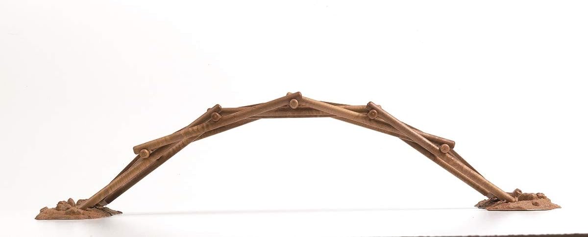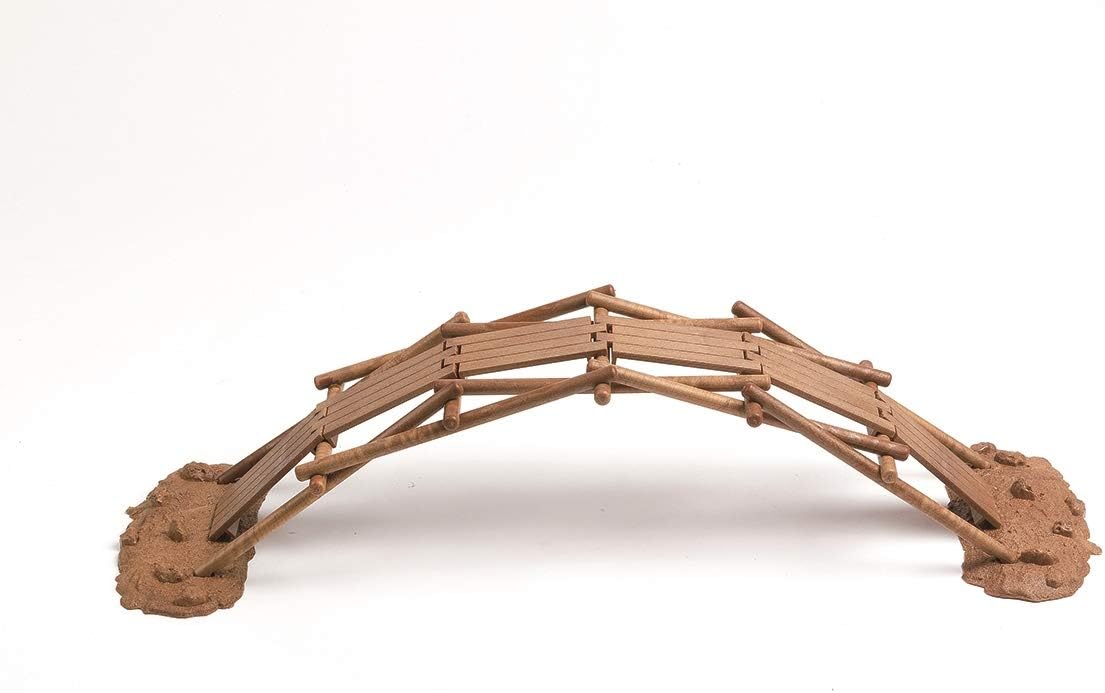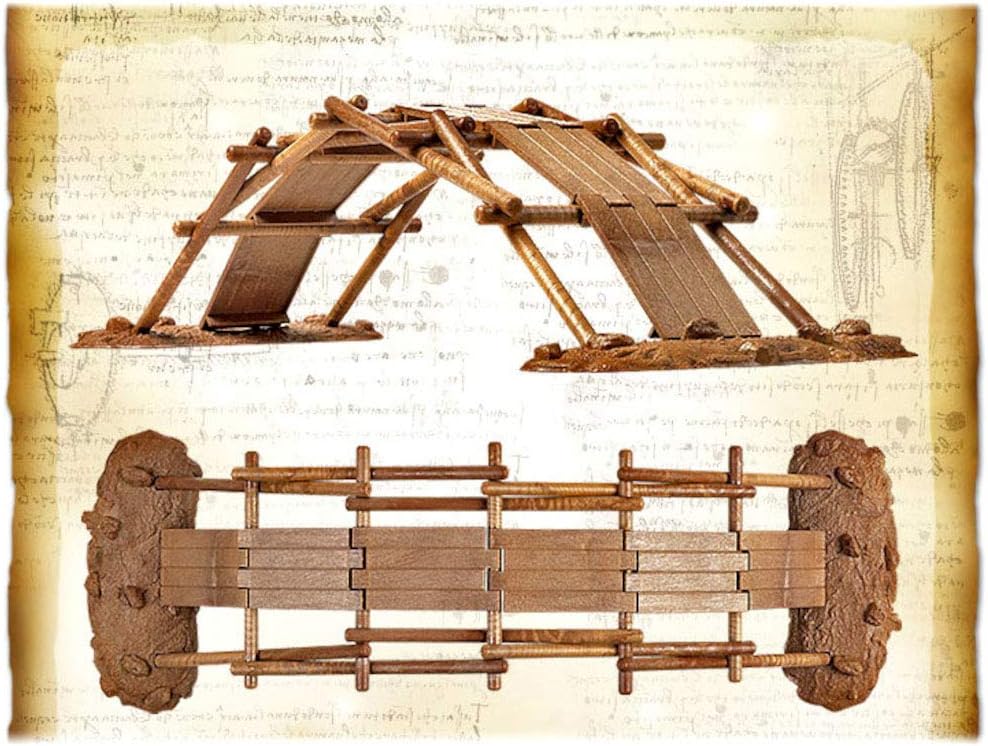 Questo è un modello del ponte ad arco progettato da Leonardo da Vinci Il design utilizza un concetto di arco plantare autoportante per distribuire il peso attraverso l'intera curva dell'arco plantare Il kit è una replica del più antico design del ponte d'arco conosciuto Assemblaggio di parti testurizzate a clip Non necessita di batterie, vernice o colla
